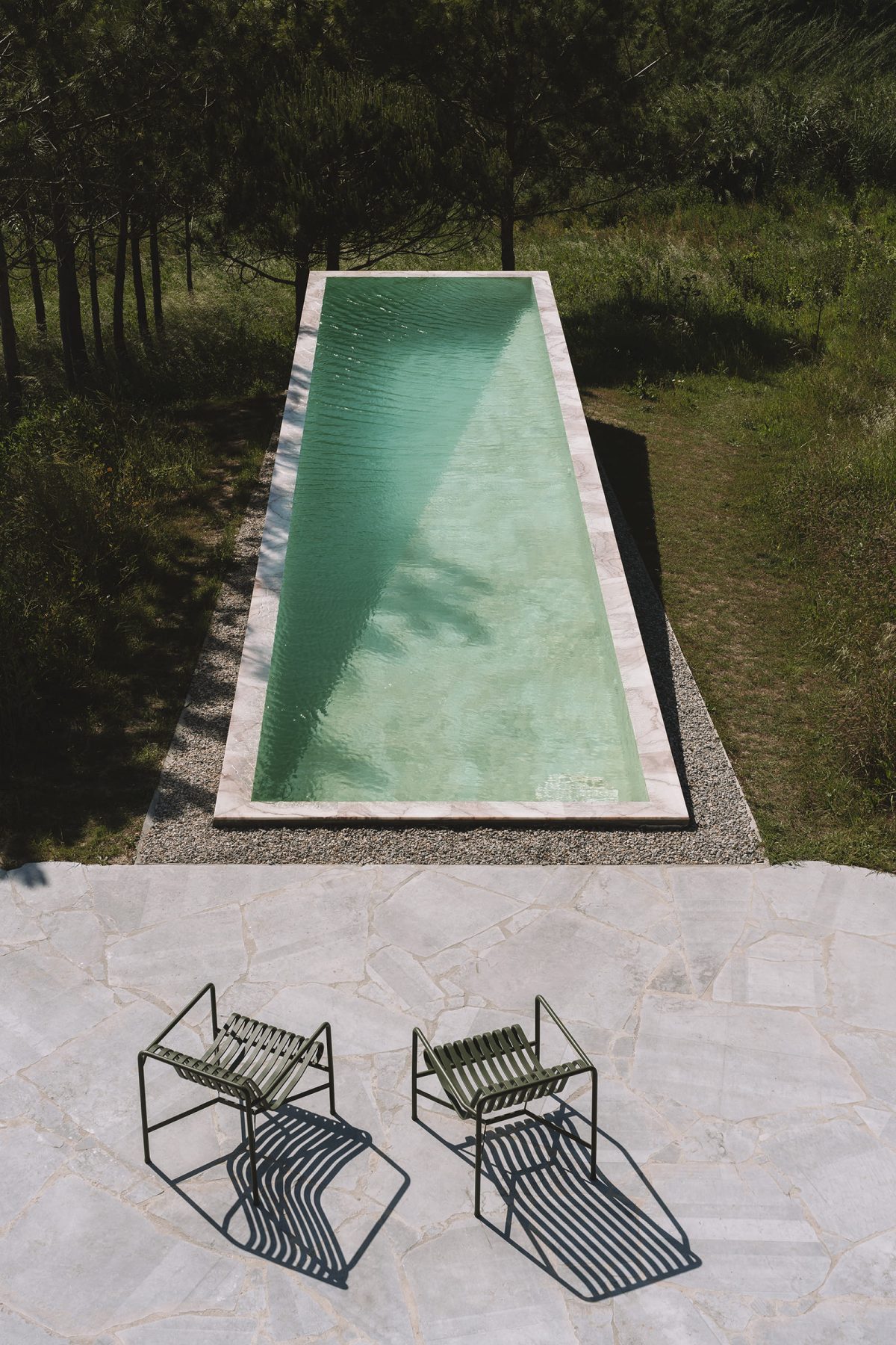 Outside, a long swimming-pool stands among wild pine trees, parallel to the sea.
