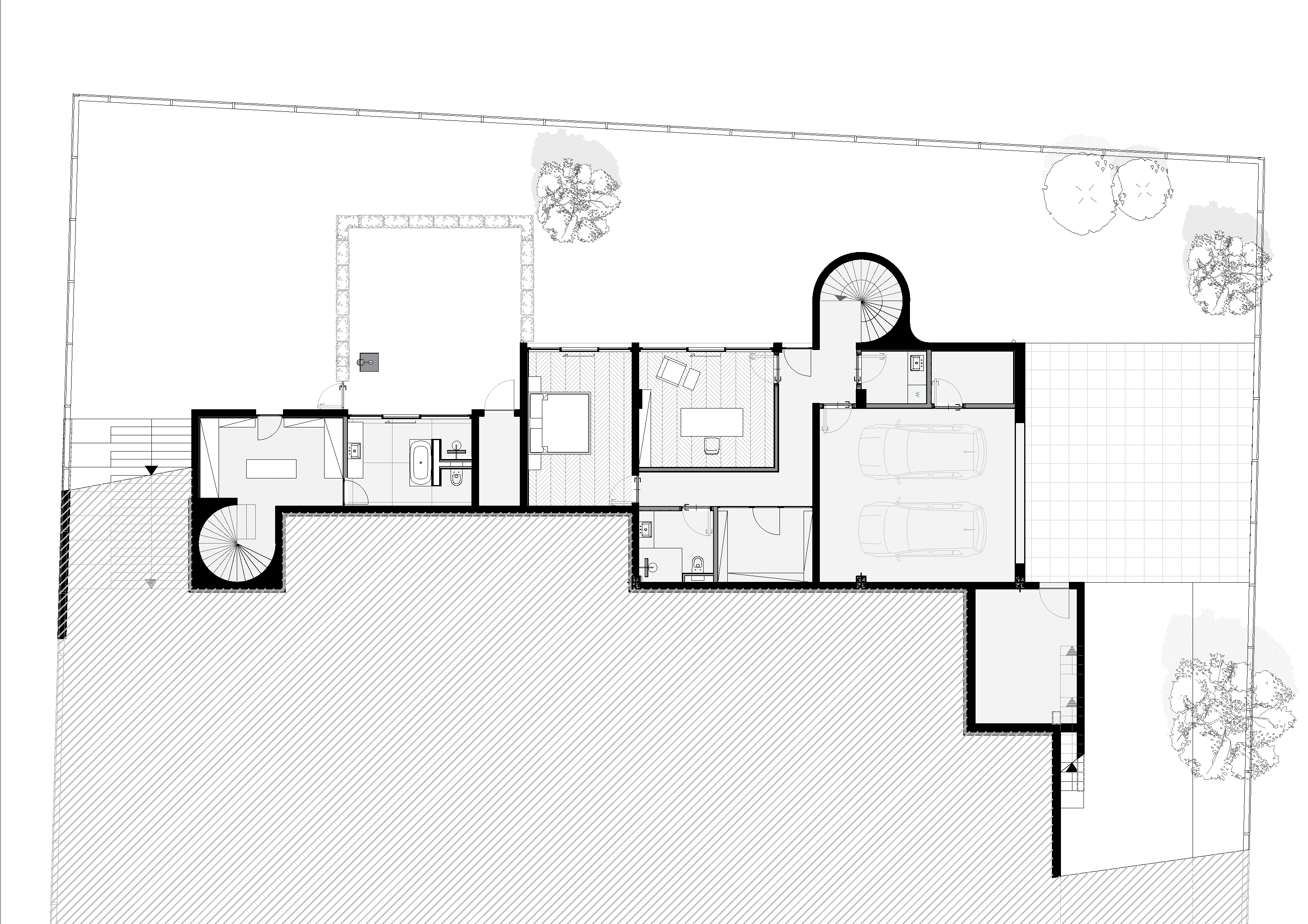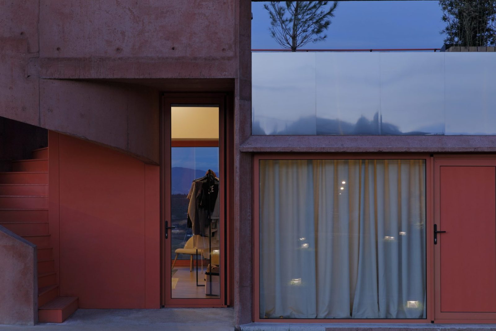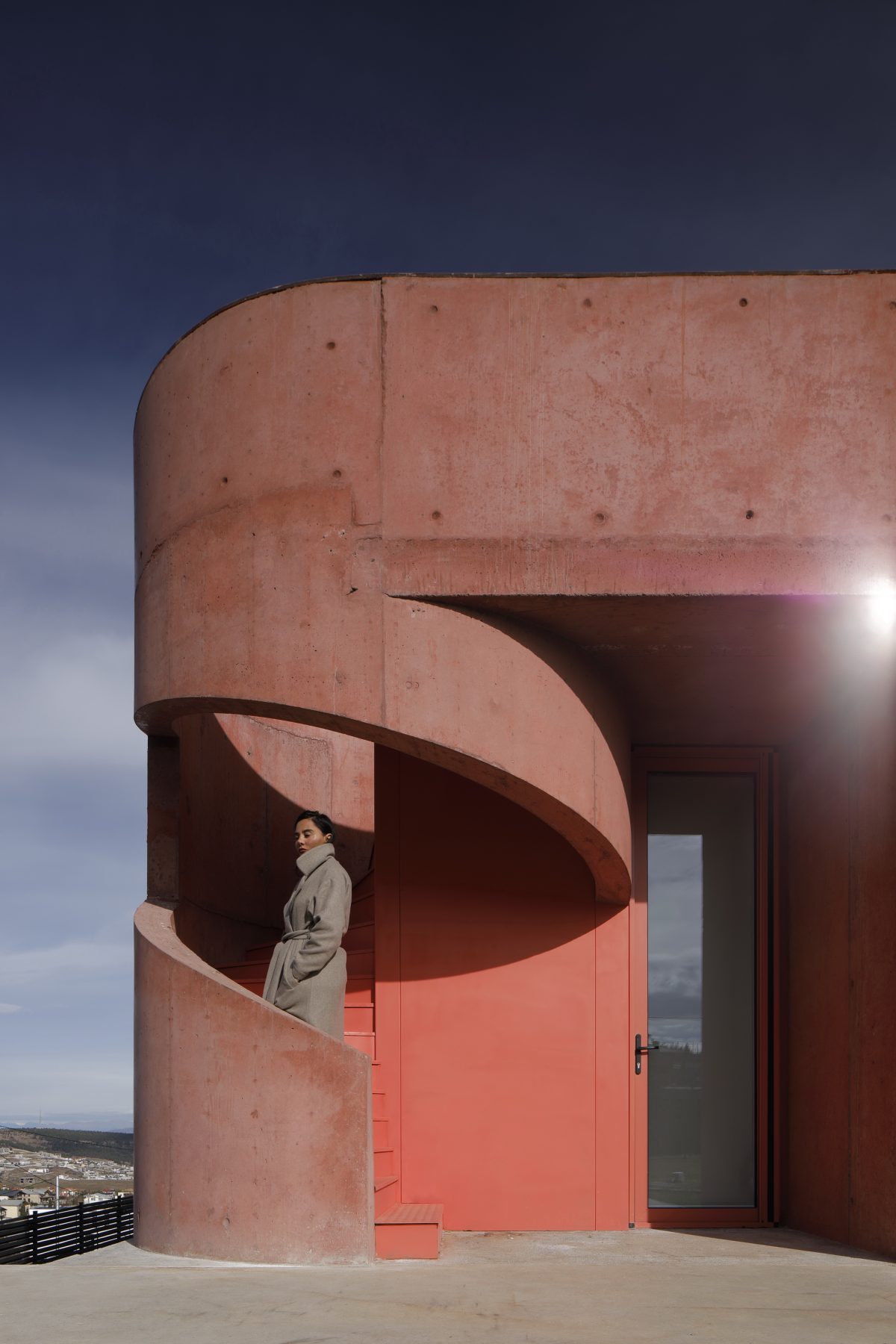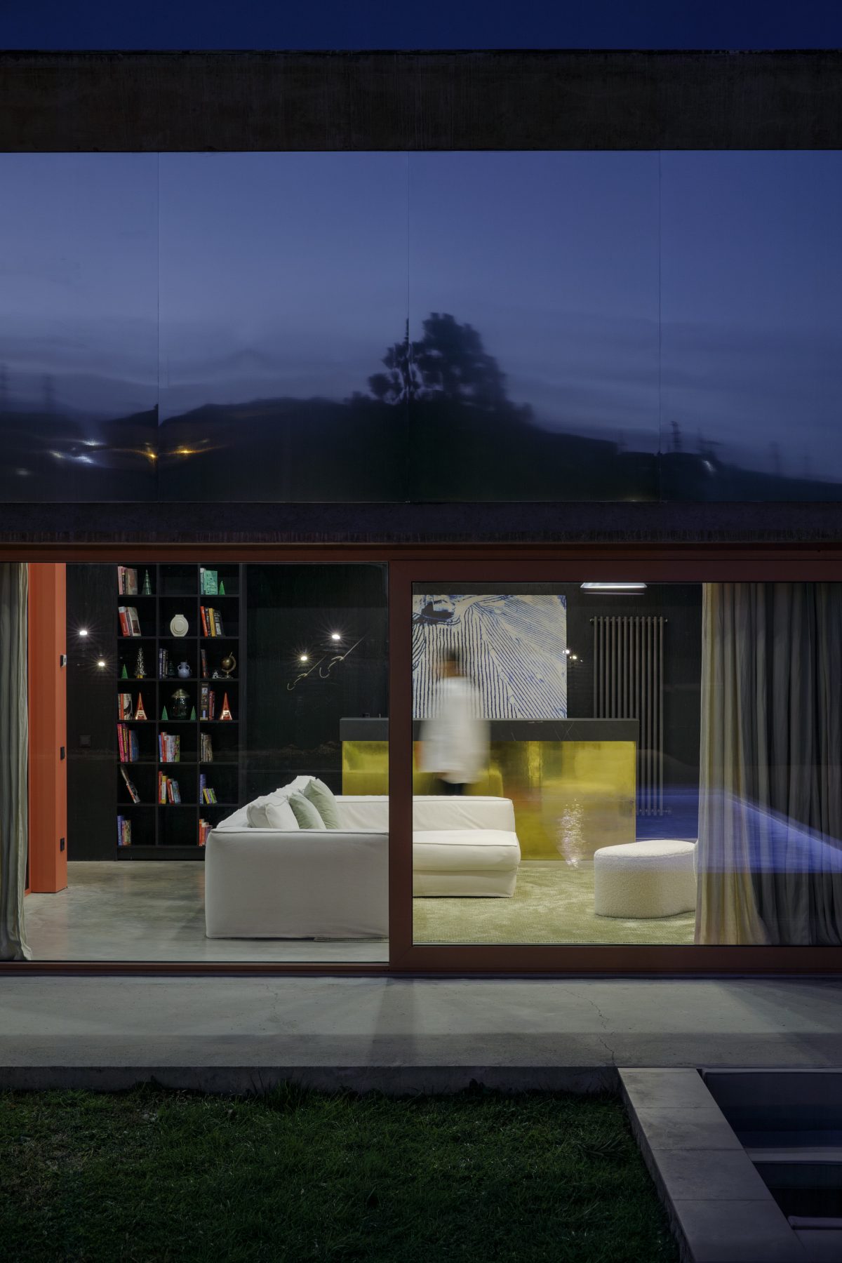 A concrete spiral staircase introduces a sculptural counterpoint to the otherwise linear geometry. Its tactile, monolithic presence anchors the composition, while simultaneously organizing circulation and vertical connections to the rooftop. In contrast, the adjacent conservatory emerges as a sharply defined cubic volume, distinguished by a grid-like façade system. This transparent structure houses the domestic garden—a reference to the owner’s botanical interests—and operates as a glazed oasis suspended above the terrain.