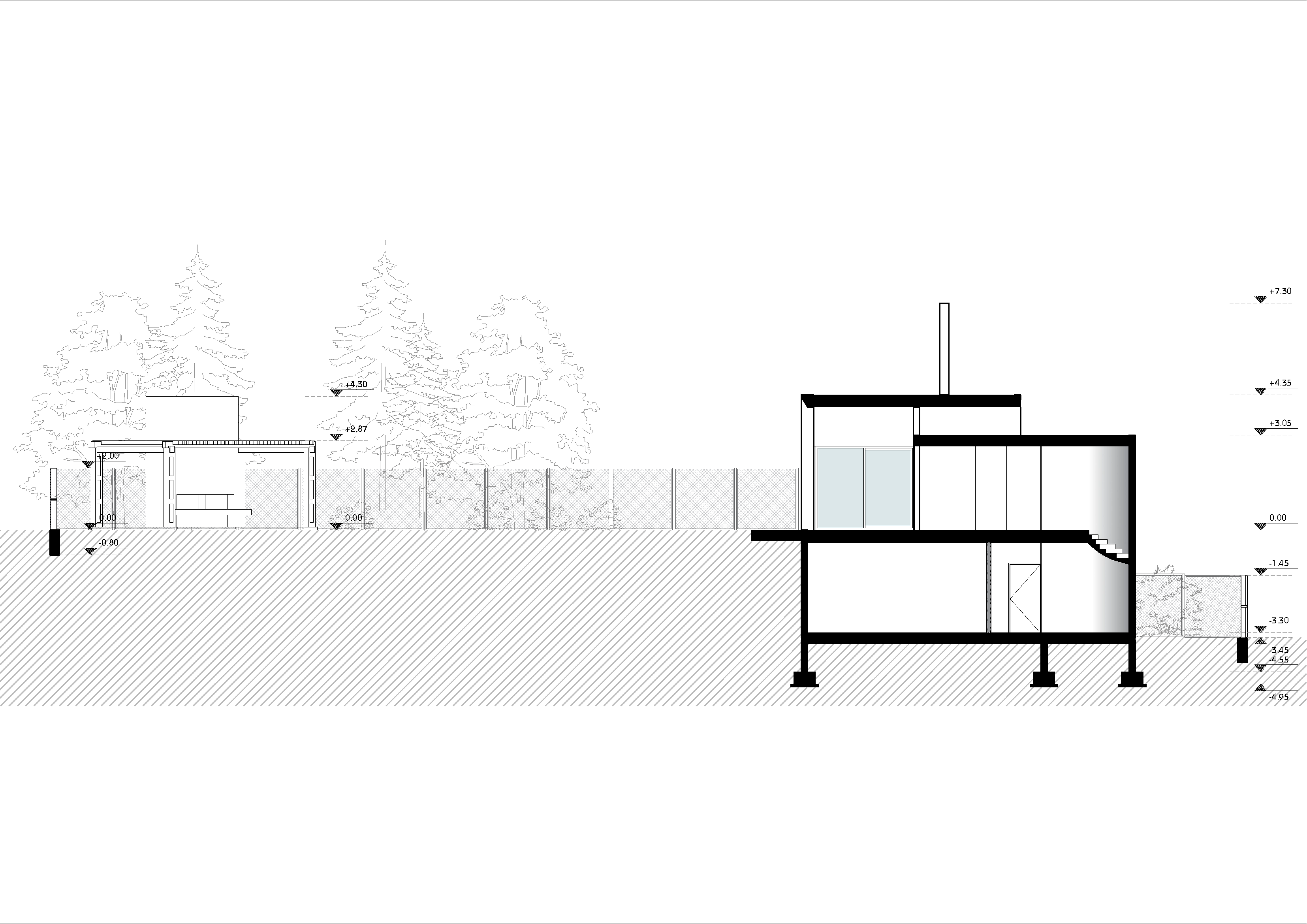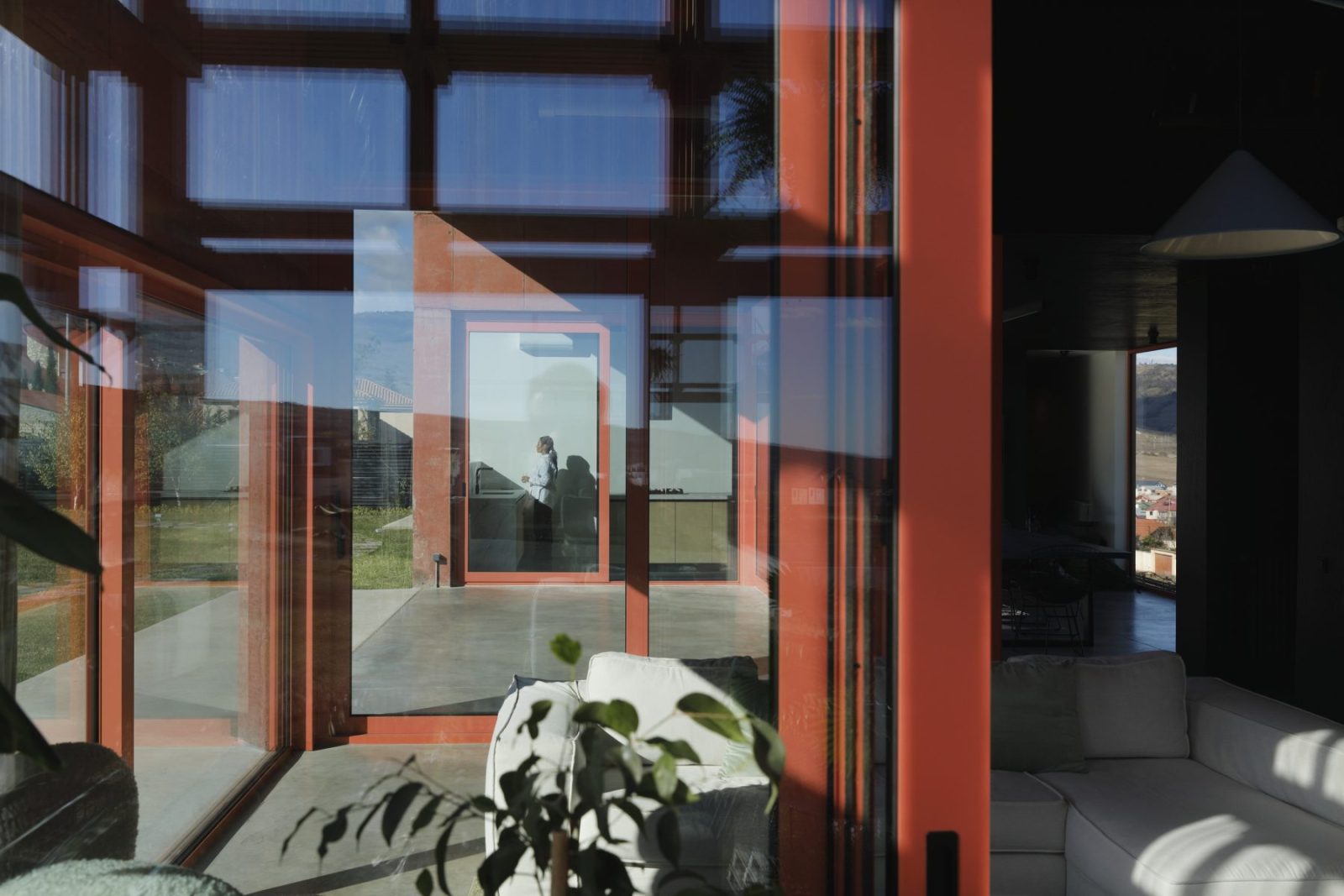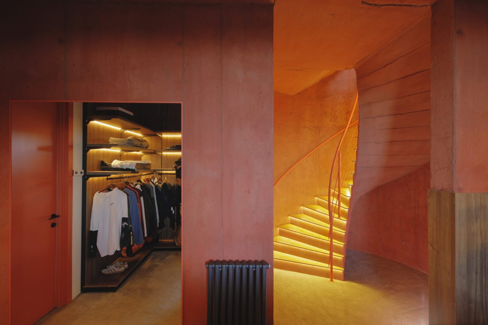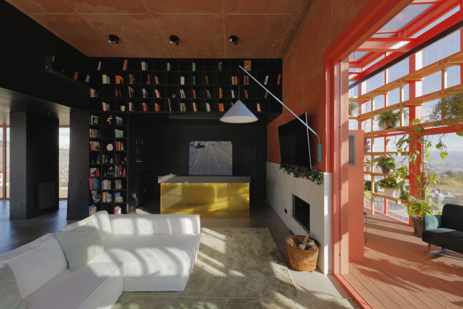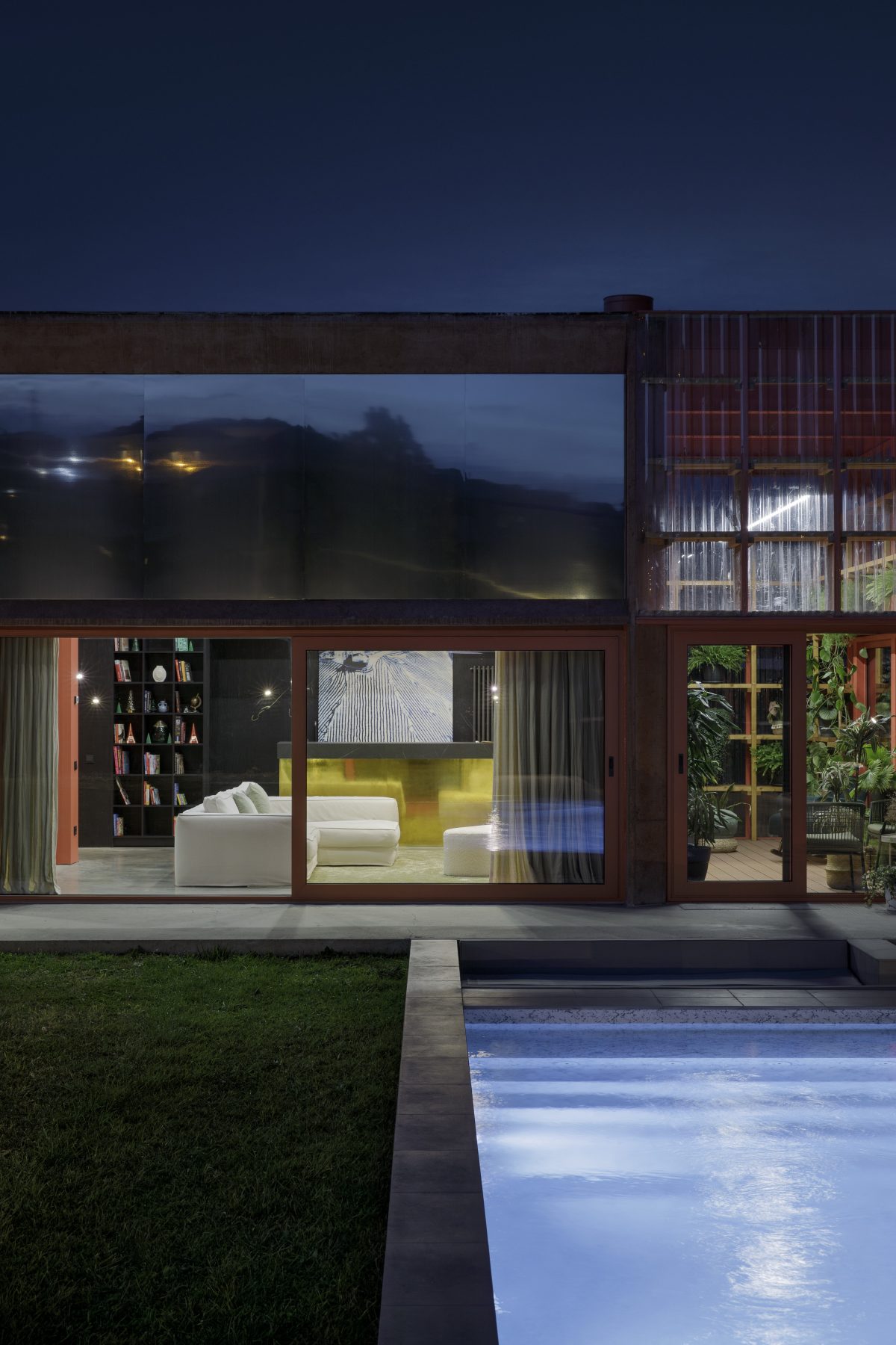 A concrete spiral staircase introduces a sculptural counterpoint to the otherwise linear geometry. Its tactile, monolithic presence anchors the composition, while simultaneously organizing circulation and vertical connections to the rooftop. In contrast, the adjacent conservatory emerges as a sharply defined cubic volume, distinguished by a grid-like façade system. This transparent structure houses the domestic garden—a reference to the owner’s botanical interests—and operates as a glazed oasis suspended above the terrain.