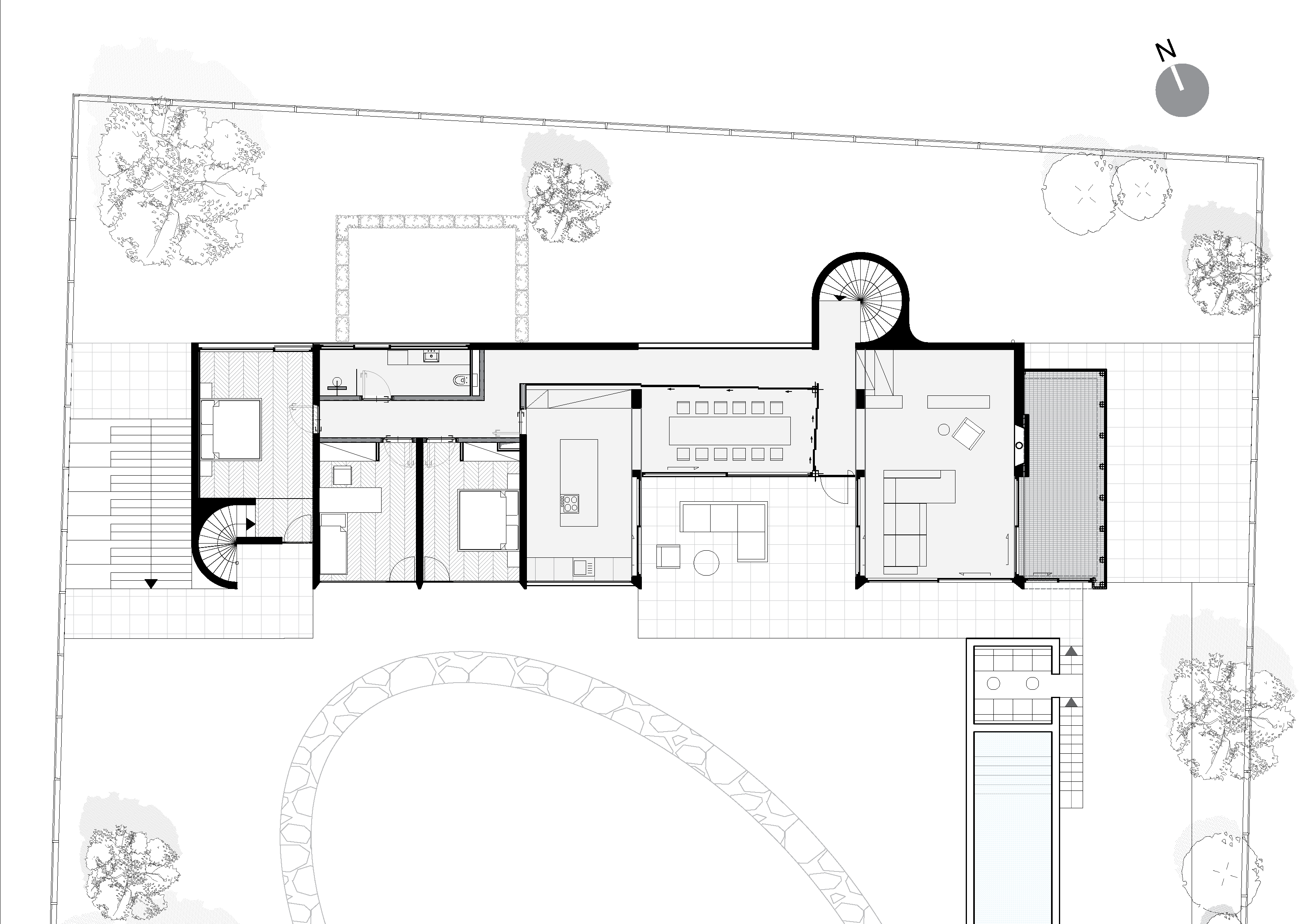 Private rooms, including bathrooms and bedrooms, extend directly onto individual patios at ground level. These outdoor extensions enrich the domestic experience by offering secluded micro-landscapes within the broader site, reinforcing the house’s relationship with nature through intimacy rather than spectacle.