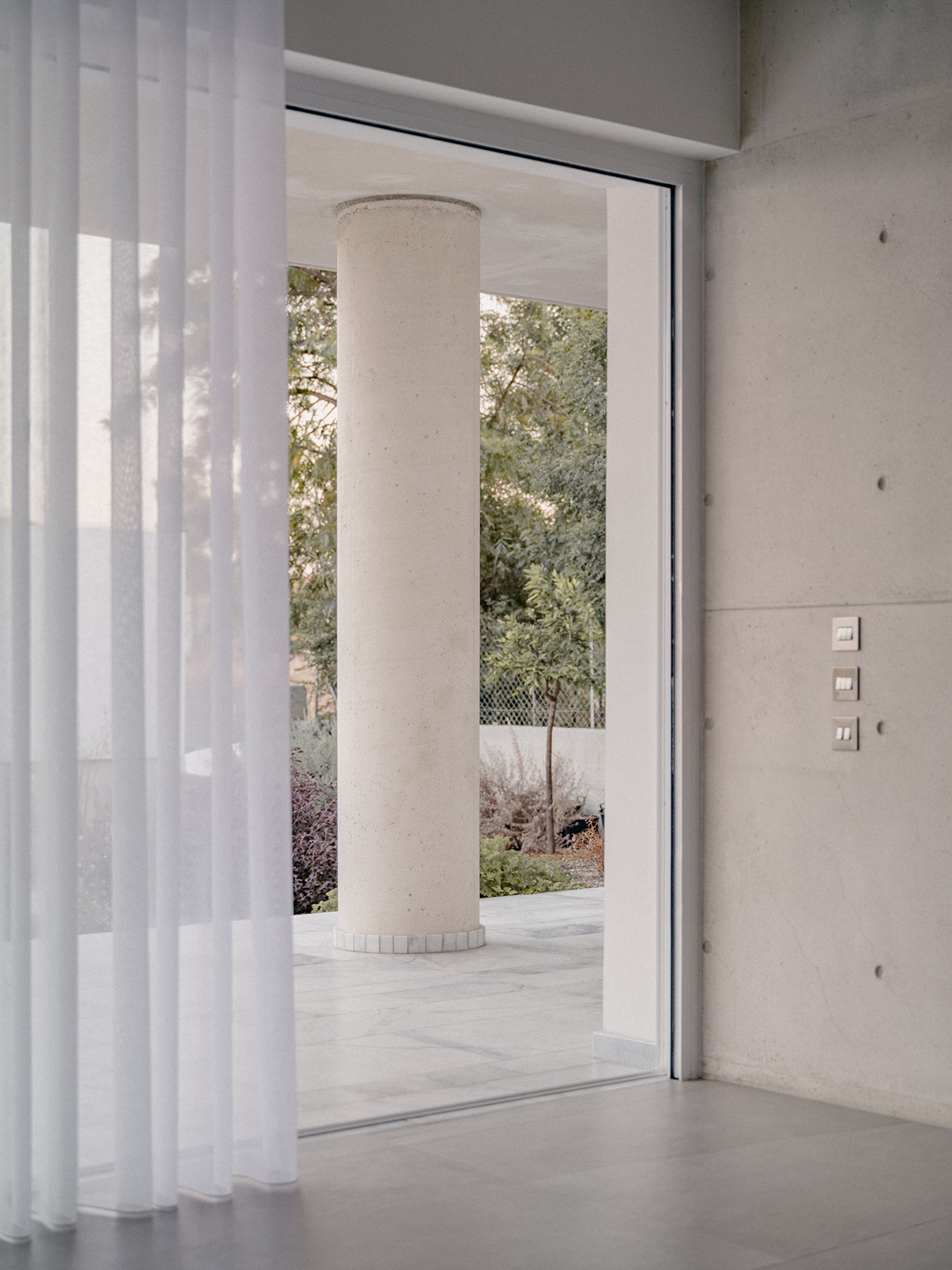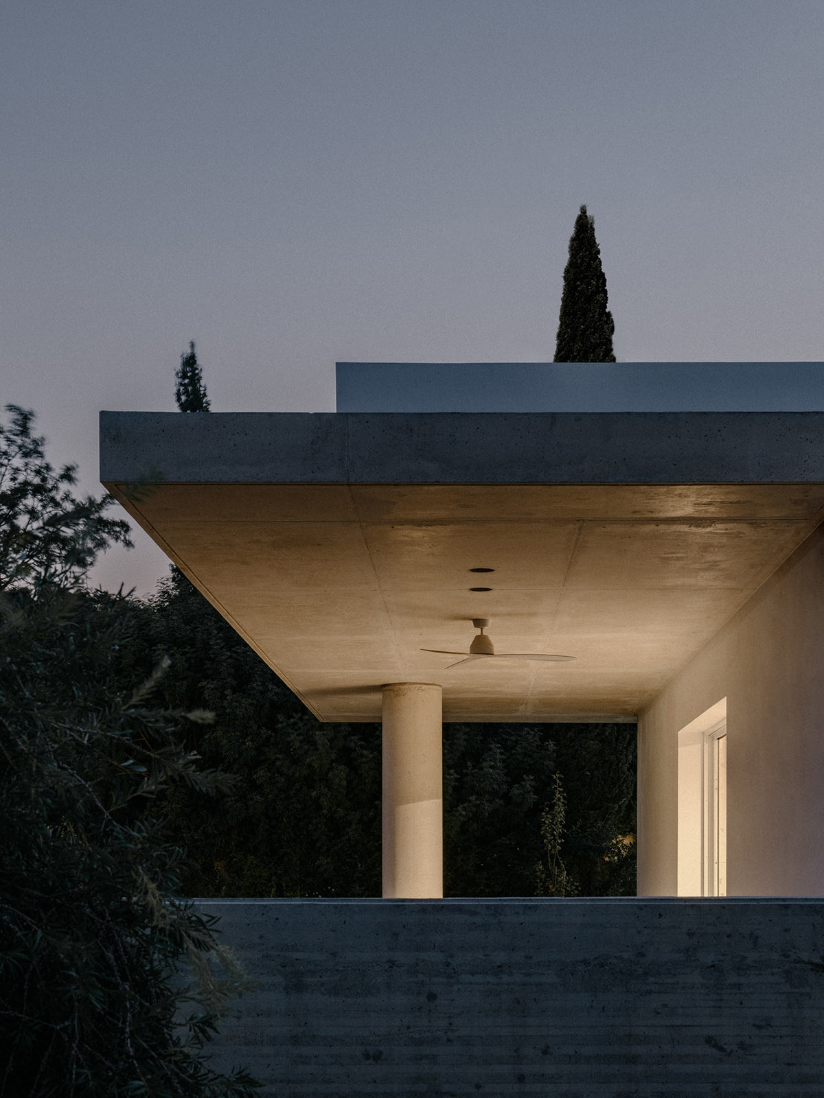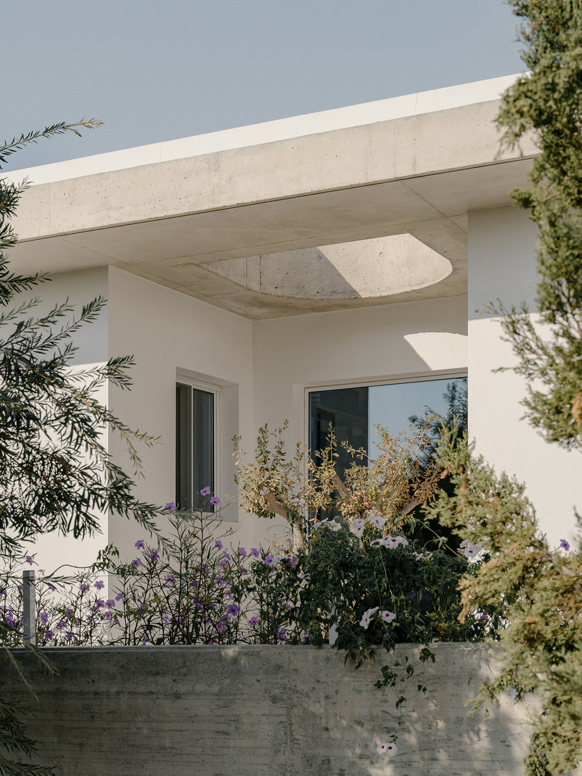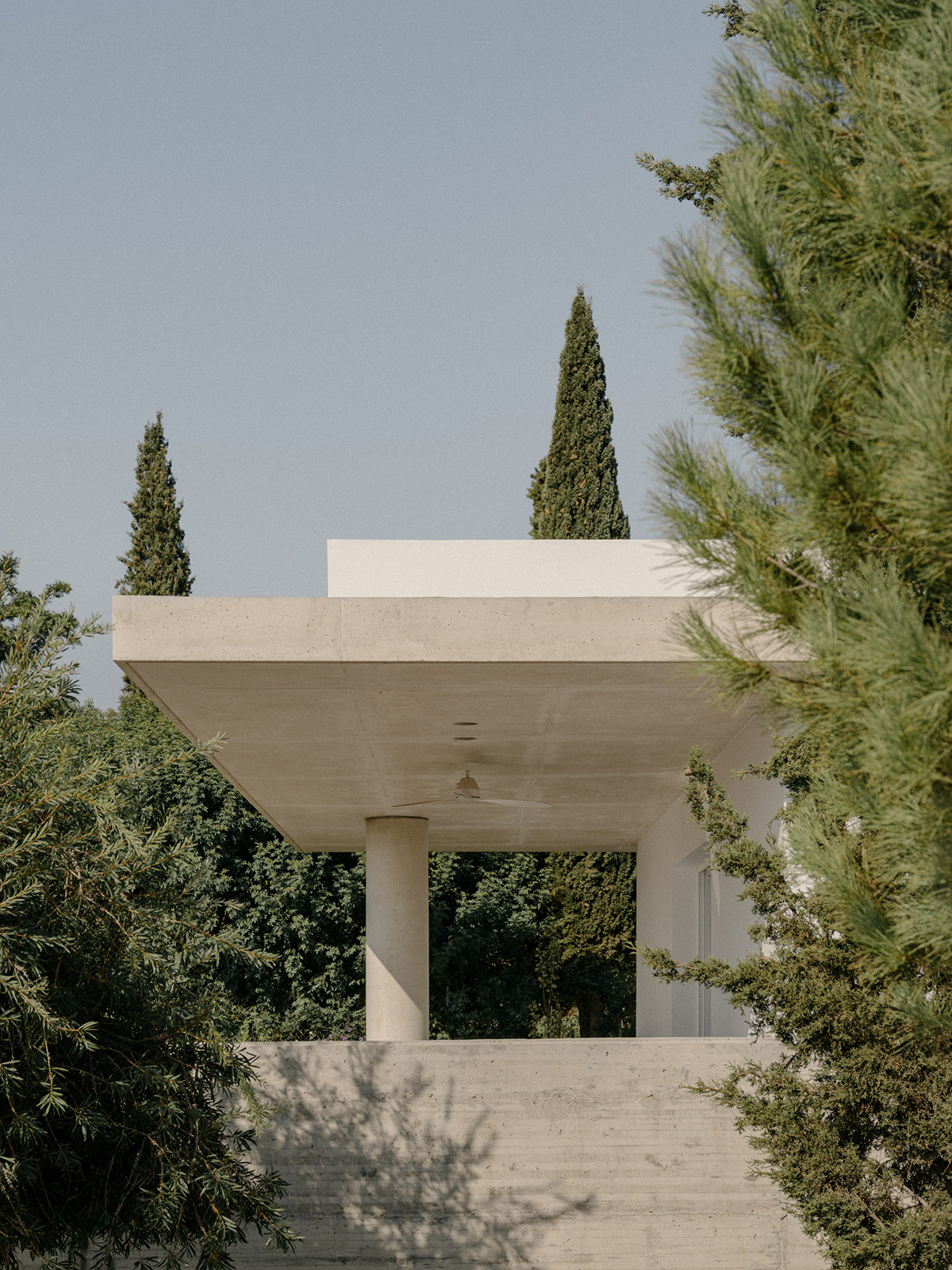 Περιμετρικά, ένας πρόβολος από εμφανές μπετόν, περιβάλλει το σύνολο προσφέροντας σκίαση και προστασία από τις καιρικές συνθήκες. Στη νότια πλευρά, ο πρόβολος προεξέχει 4 μέτρα προς τον κήπο, δημιουργώντας μία ευρύχωρη καλυμμένη βεράντα που στηρίζεται σε μια κυλινδρική κολώνα, ενισχύοντας την αίσθηση της κλίμακας και της αναλογίας στον εξωτερικό χώρο.