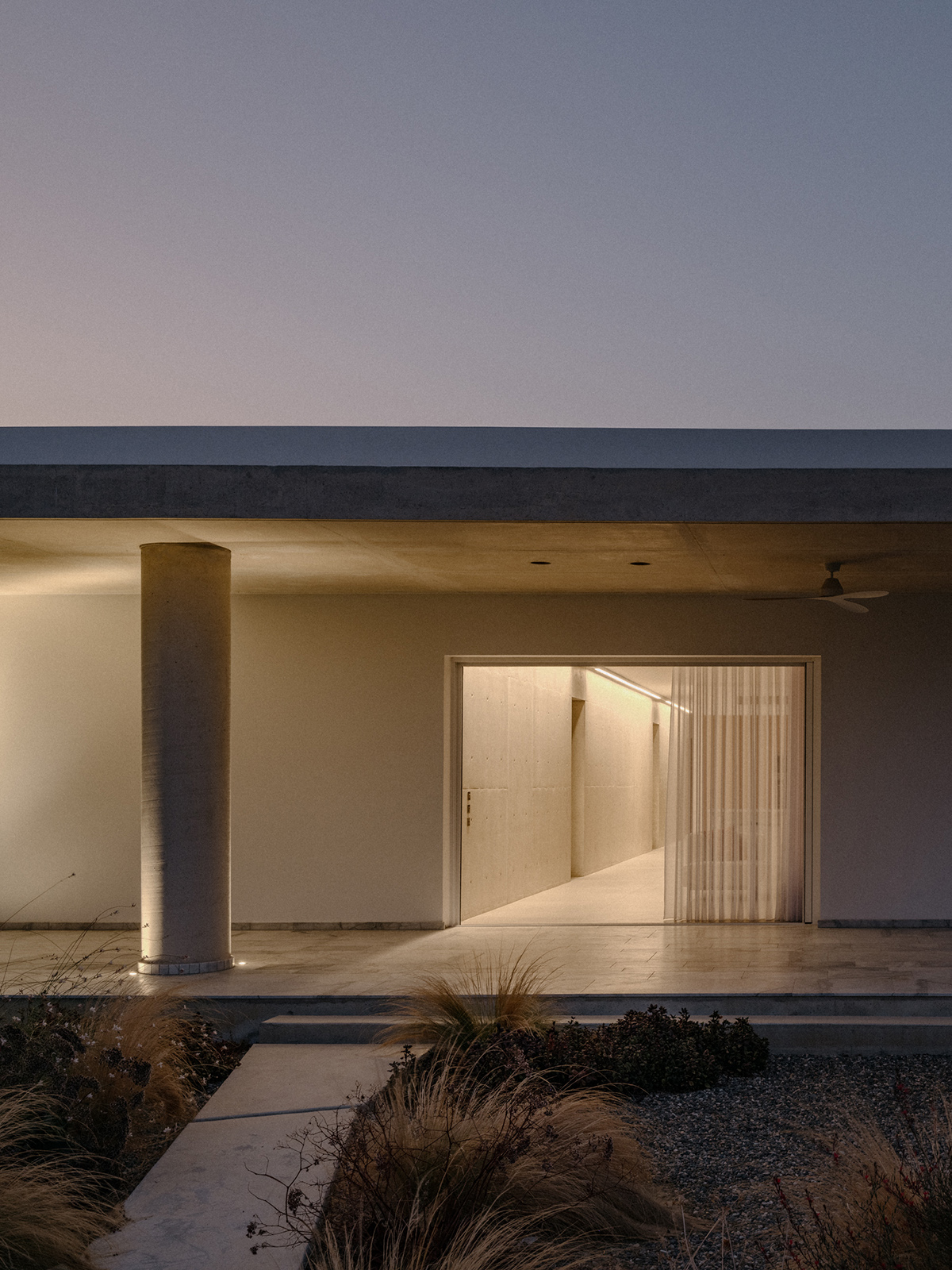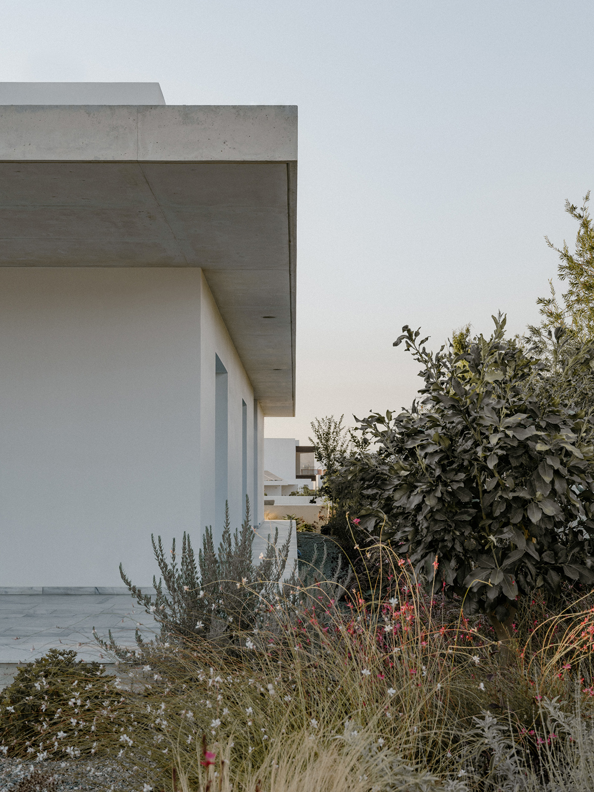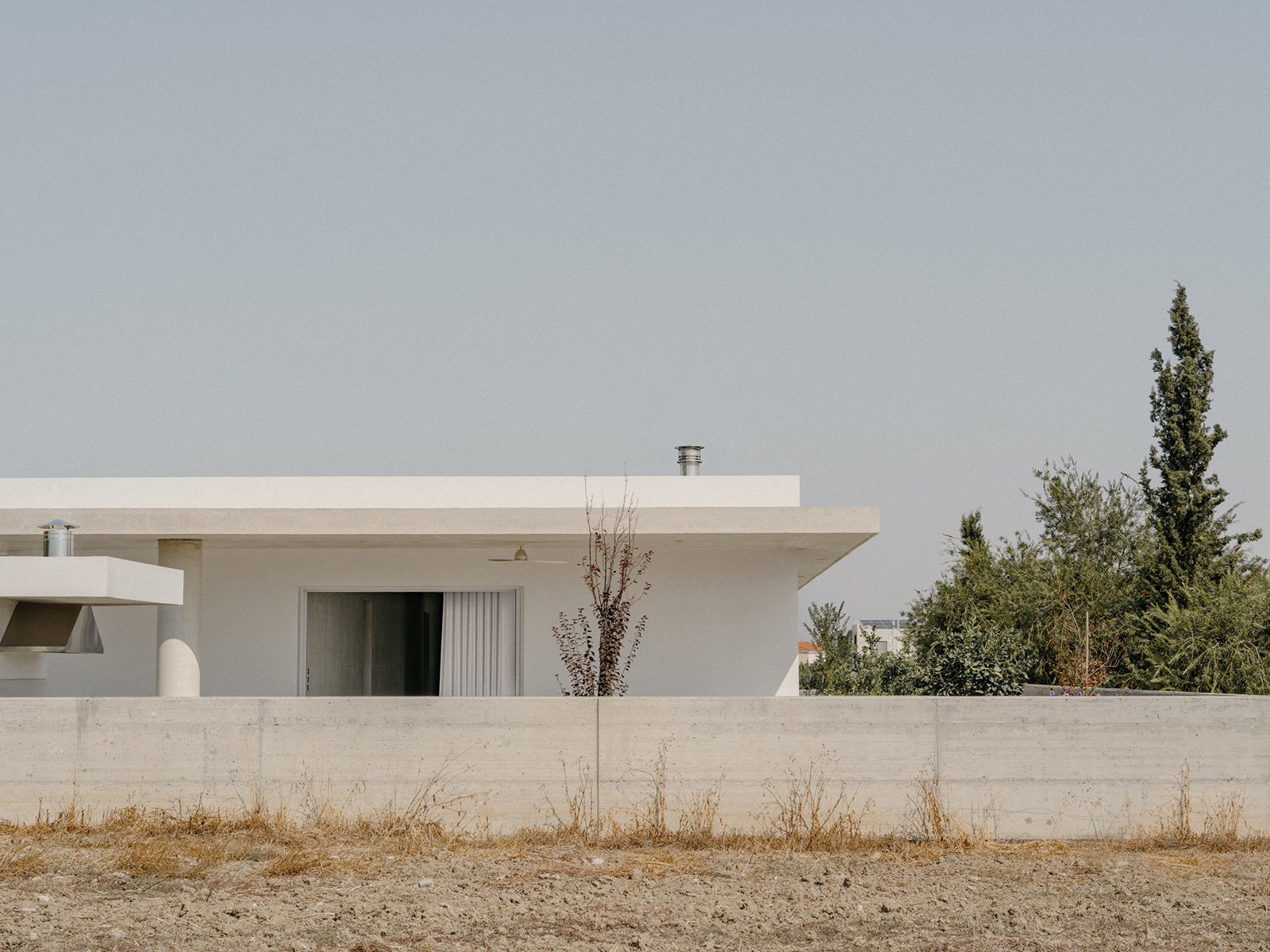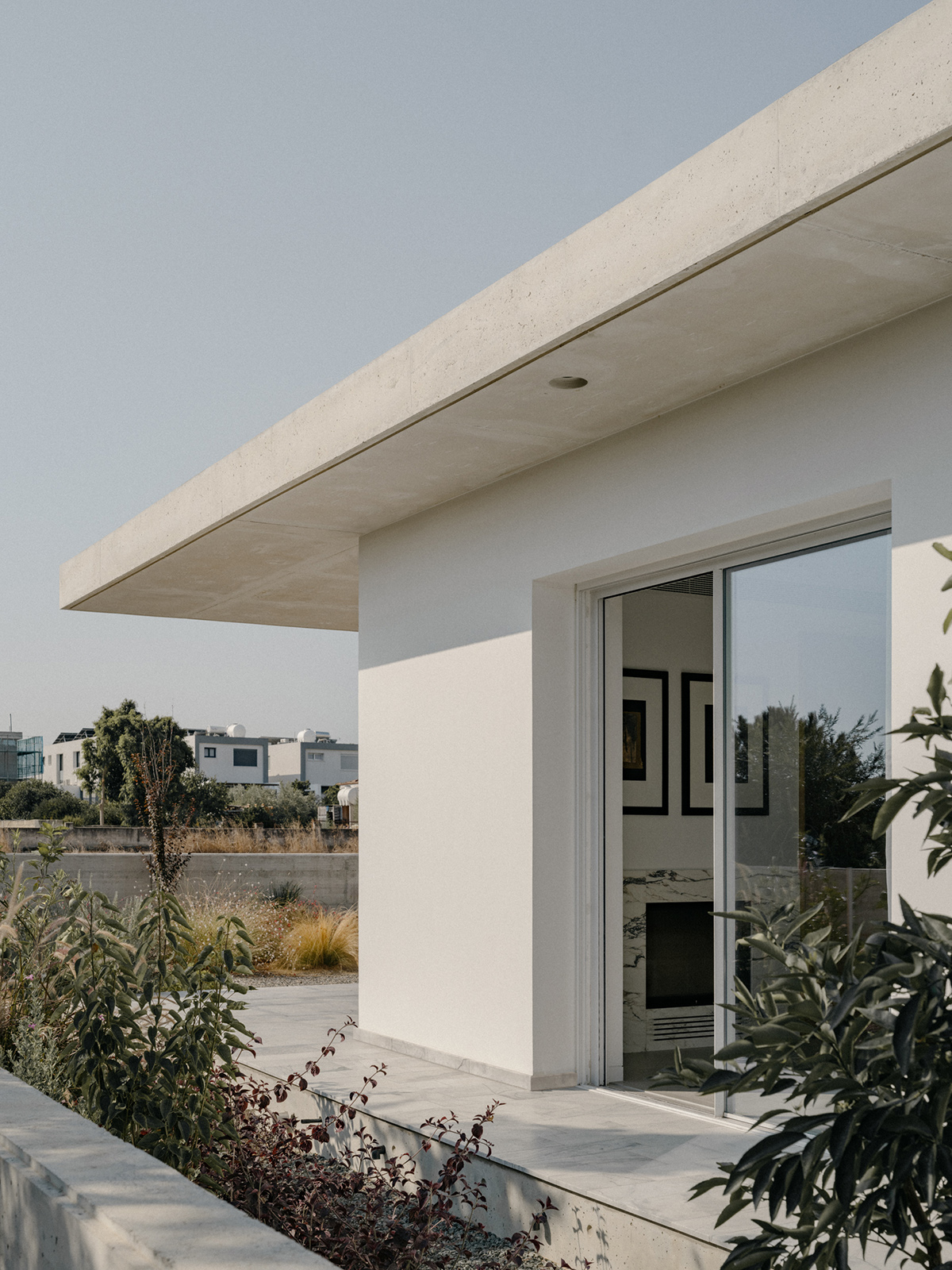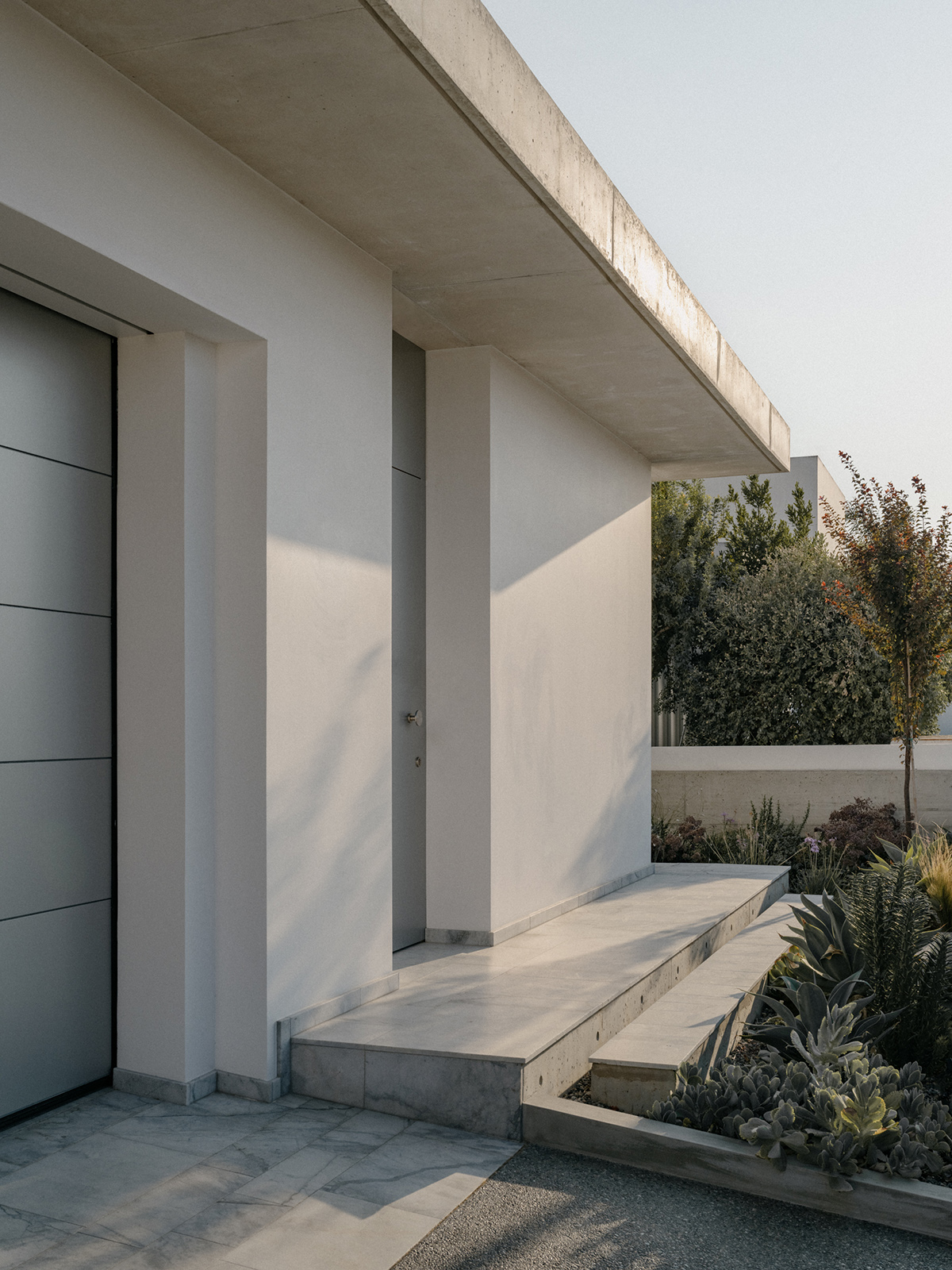 Περιμετρικά, ένας πρόβολος από εμφανές μπετόν, περιβάλλει το σύνολο προσφέροντας σκίαση και προστασία από τις καιρικές συνθήκες. Στη νότια πλευρά, ο πρόβολος προεξέχει 4 μέτρα προς τον κήπο, δημιουργώντας μία ευρύχωρη καλυμμένη βεράντα που στηρίζεται σε μια κυλινδρική κολώνα, ενισχύοντας την αίσθηση της κλίμακας και της αναλογίας στον εξωτερικό χώρο.