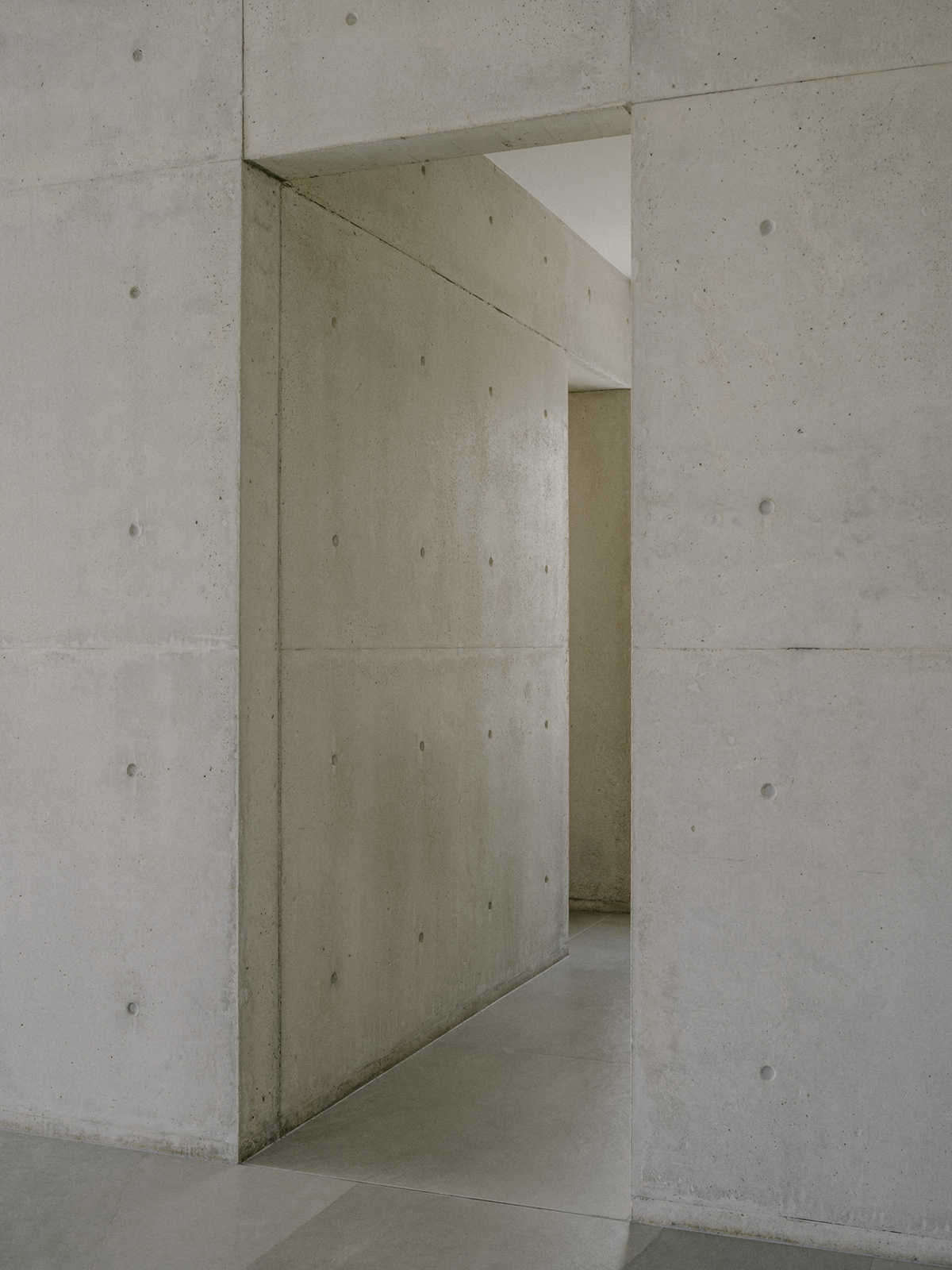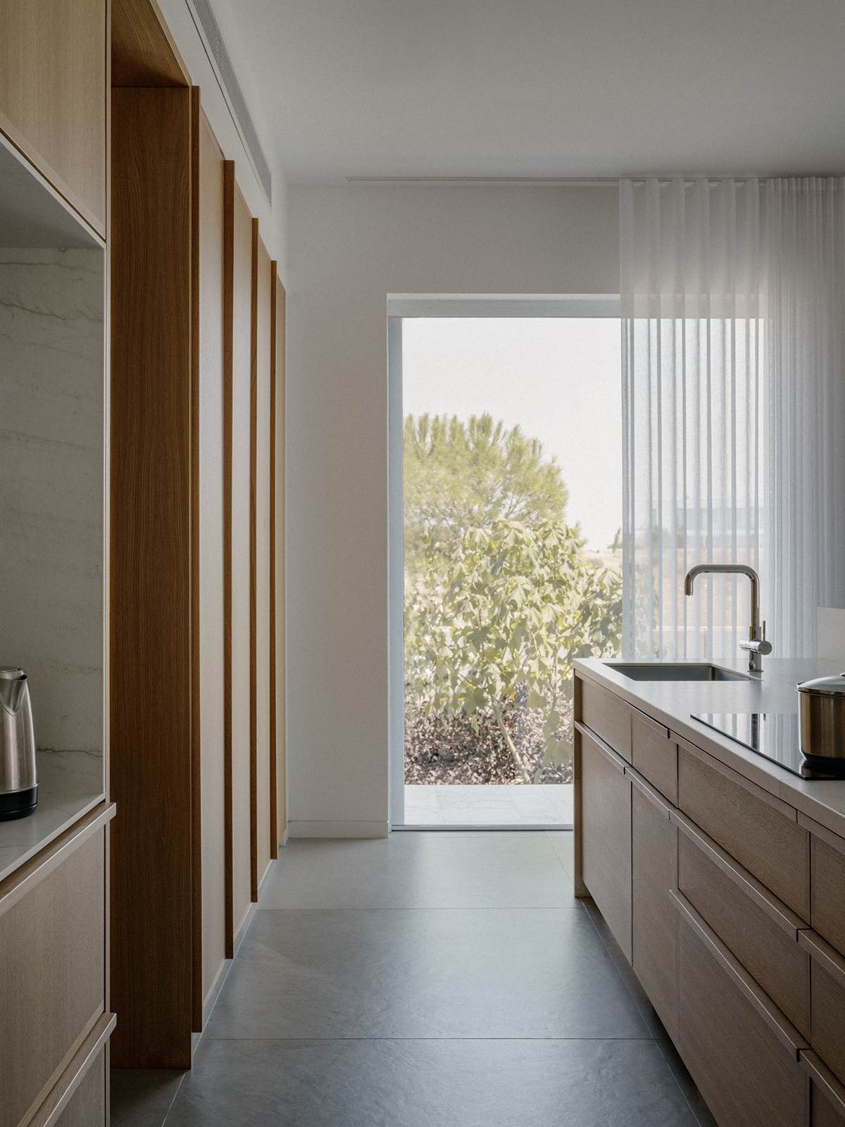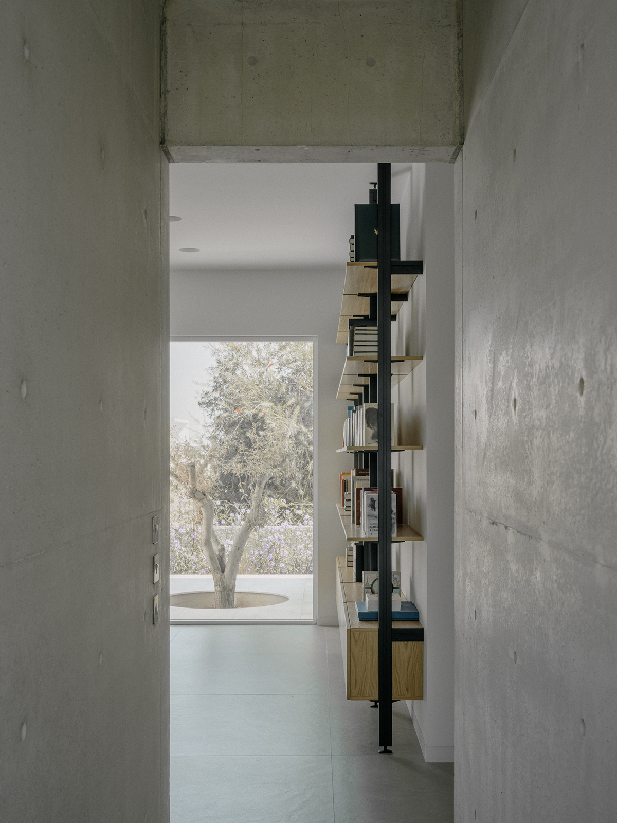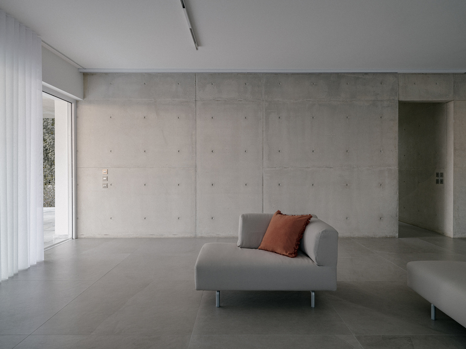 Περιμετρικά, ένας πρόβολος από εμφανές μπετόν, περιβάλλει το σύνολο προσφέροντας σκίαση και προστασία από τις καιρικές συνθήκες. Στη νότια πλευρά, ο πρόβολος προεξέχει 4 μέτρα προς τον κήπο, δημιουργώντας μία ευρύχωρη καλυμμένη βεράντα που στηρίζεται σε μια κυλινδρική κολώνα, ενισχύοντας την αίσθηση της κλίμακας και της αναλογίας στον εξωτερικό χώρο.