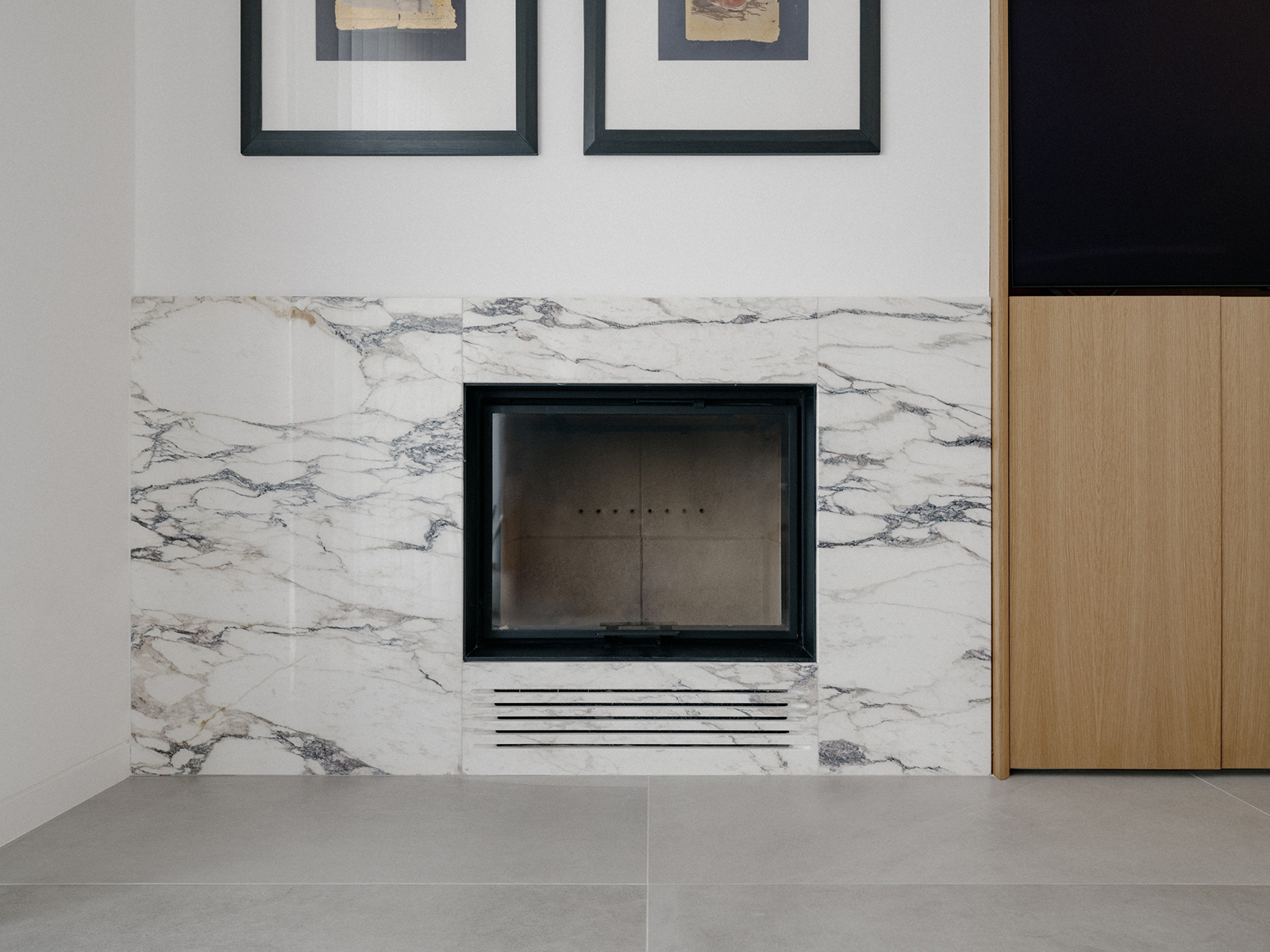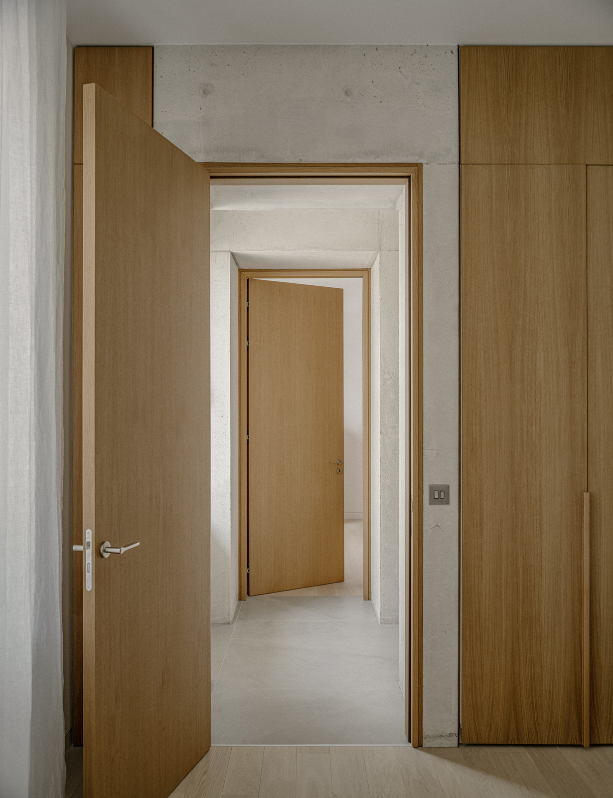 Η λιτότητα της εξωτερικής μορφής και των εσωτερικών χώρων οδήγησε στην επιλογή συγκεκριμένων υλικών: μεγάλες κεραμικές πλάκες για το δάπεδο στους κοινόχρηστους χώρους, ξύλινα δάπεδα στα υπνοδωμάτια, εμφανές μπετόν σε τοίχους και την εξωτερική οροφή, και λευκό επίχρισμα στις κατακόρυφες επιφάνειες. Επιπλέον, οι θύρες, τα ερμάρια, η κουζίνα και οι αποθηκευτικοί χώροι, σχεδιάστηκαν με επιμέλεια και κατασκευάστηκαν από δρυ, προσφέροντας στον εσωτερικό χώρο ένα ζεστό και οικείο χαρακτήρα.