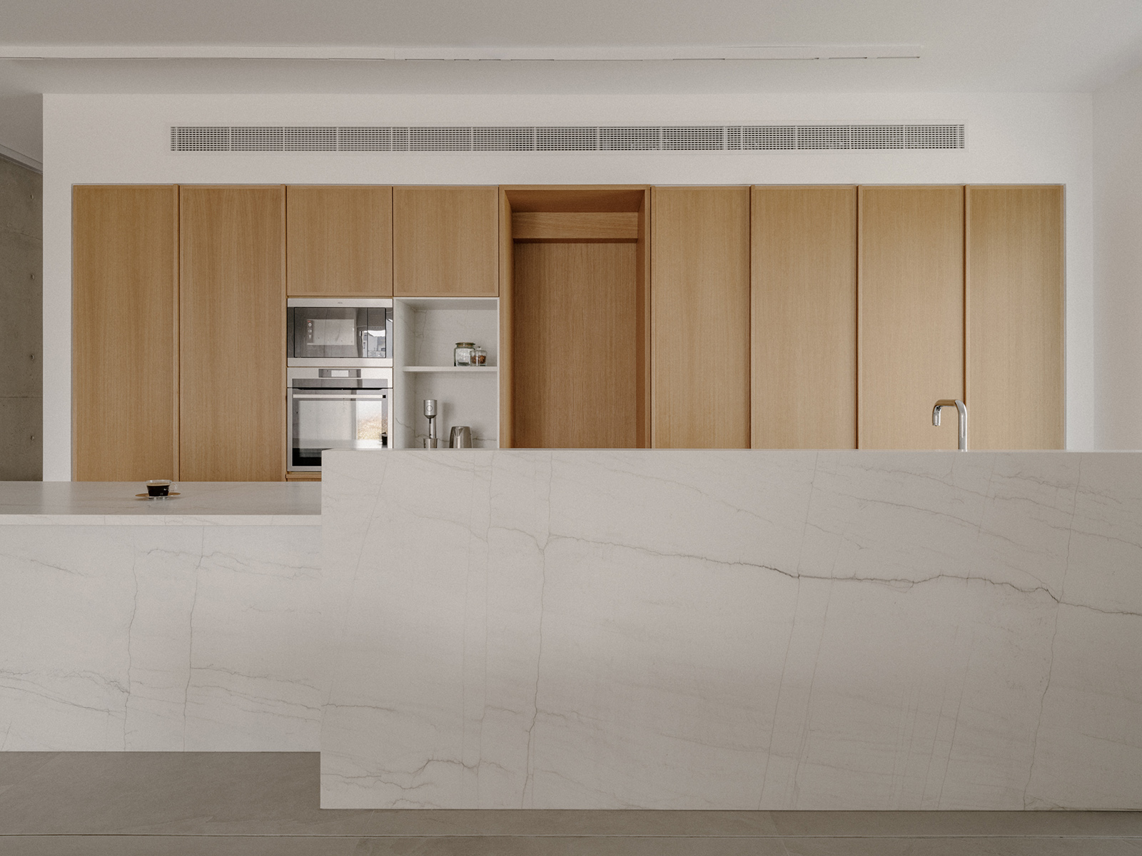 Η εσωτερική διάταξη της κατοικίας είναι λιτή και λειτουργική, χωρισμένη σε δύο ζώνες: τη δυτική ζώνη, όπου τα υπνοδωμάτια απολαμβάνουν το βραδινό καλοκαιρινό δροσερό αέρα, και την ανατολική ζώνη, όπου οι καθημερινές χρήσεις απολαμβάνουν τη θέα προς το πράσινο που περιβάλλει το τεμάχιο. Μέσω μεγάλων ανοιγμάτων, ο εσωτερικός χώρος ενοποιείται οπτικά με το εξωτερικό περιβάλλον, προσφέροντας οπτική συνέχεια και φυσικό φωτισμό. Ένας τοίχος 17 μέτρων από εμφανές σκυρόδεμα εκτείνεται κατά μήκος του σπιτιού, δημιουργώντας μία γλυπτική μορφή που διαχωρίζει τις δύο ζώνες.