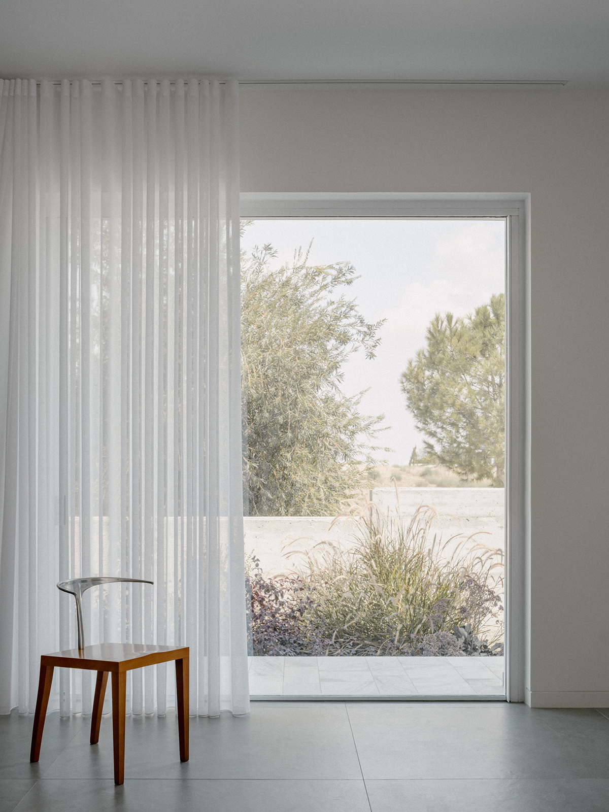 Το οπτικό πεδίο από την είσοδο της κατοικίας παραμένει ανεμπόδιστο εξασφαλίζοντας άμεση θέα προς τον κήπο ο οποίος ξεδιπλώνεται μέσα από τις εναλλαγές των χώρων.