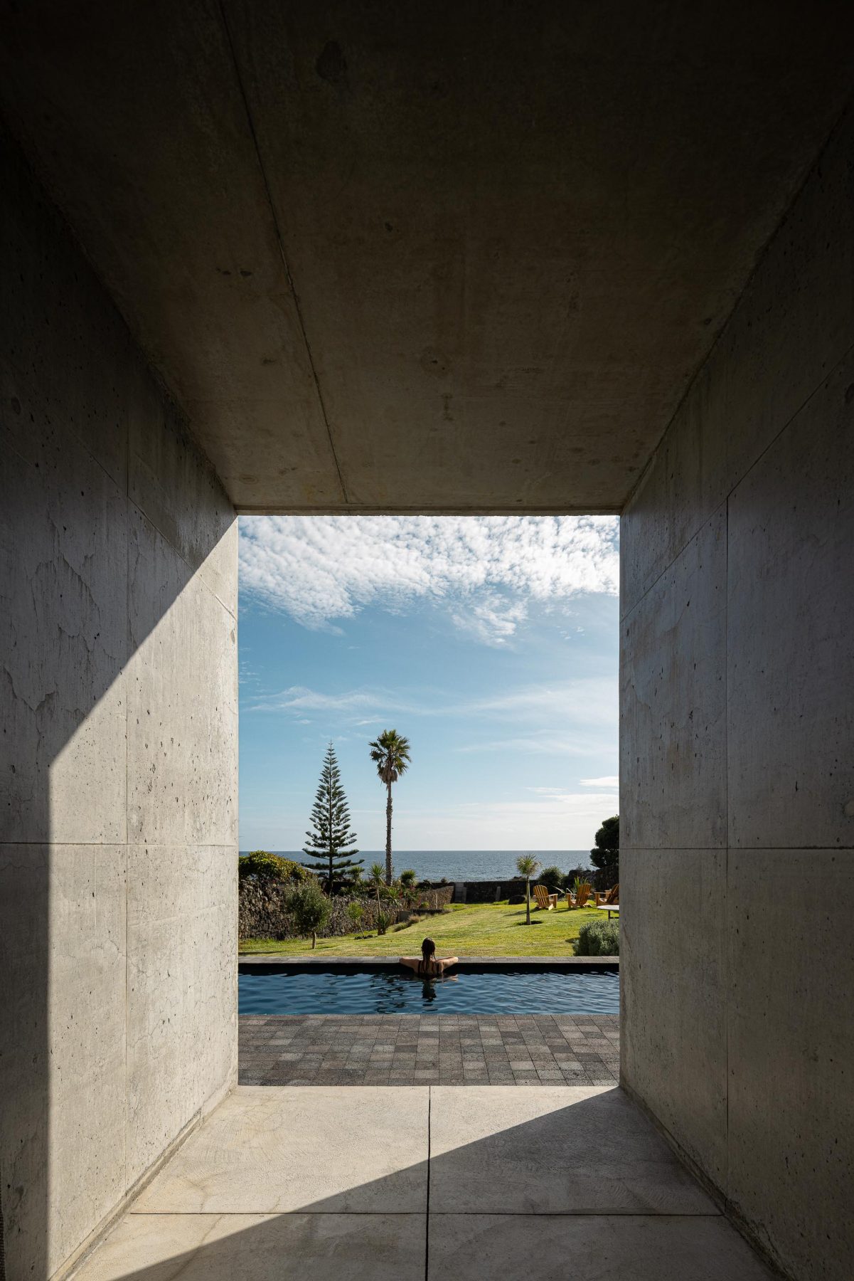 Situated on the last empty plot along a stretch of São Miguel’s southern coast, the house assumes a dual role—closing the urban block while simultaneously establishing itself as a natural extension of the volcanic rock that characterizes the landscape.