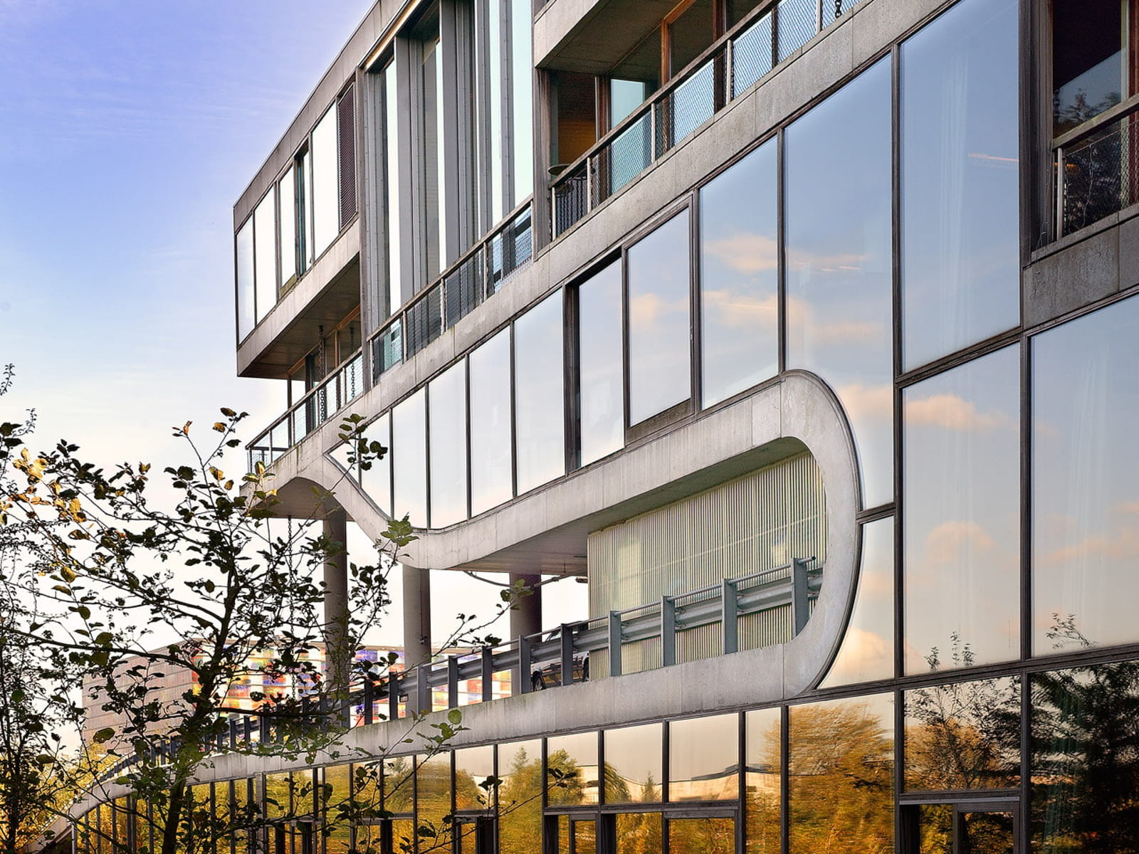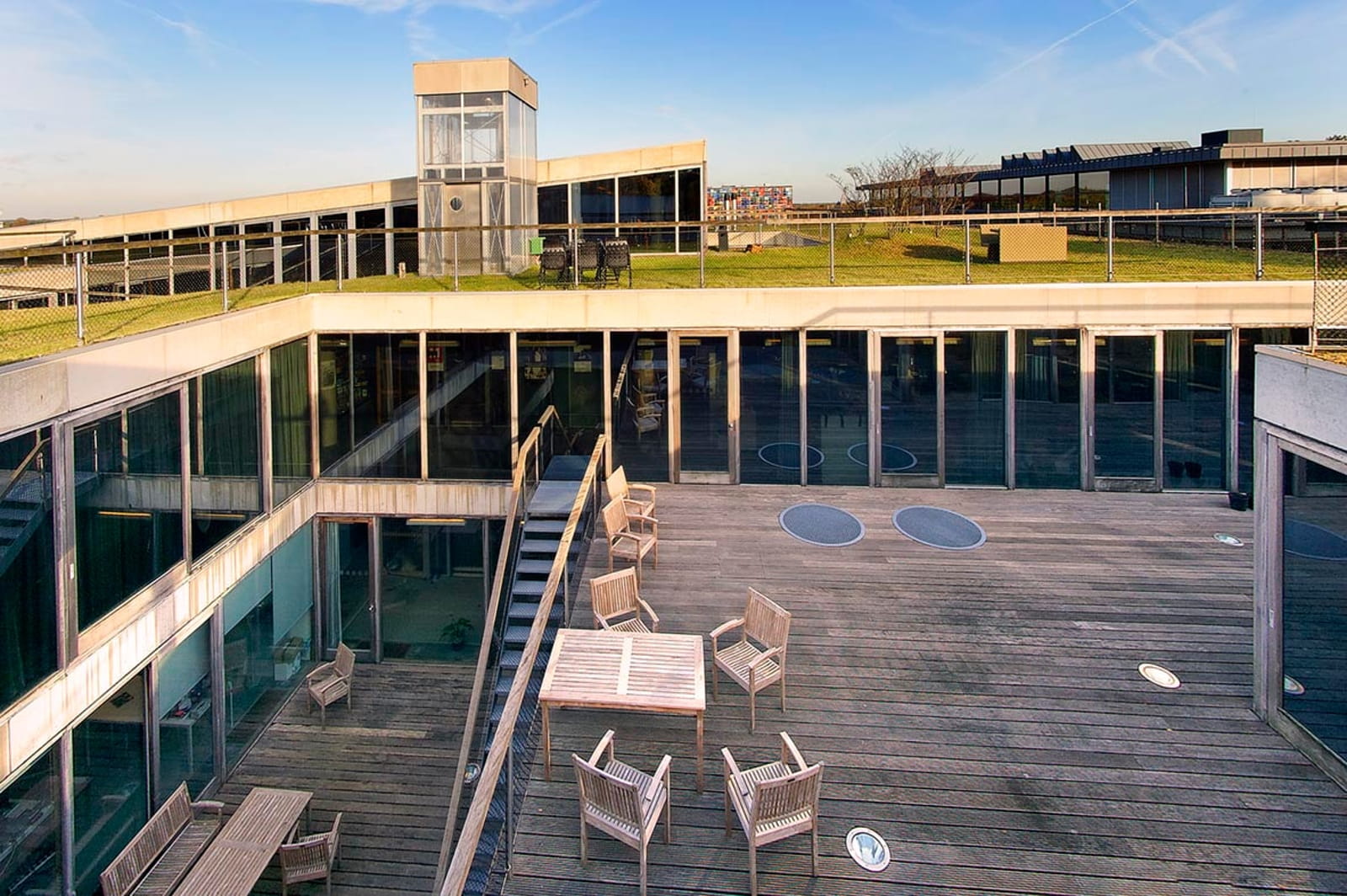 The building’s structure — with floors supported by a grid of columns and stabilising props — maximises transparency and eliminates typical office partitions, while technical systems are discreetly hidden within hollow floors and semi-transparent shafts. Materials such as stone, steel, wood, and plastic replace conventional finishes, and generous floor-to-ceiling apertures connect interior spaces with gardens, balconies, terraces and patios.