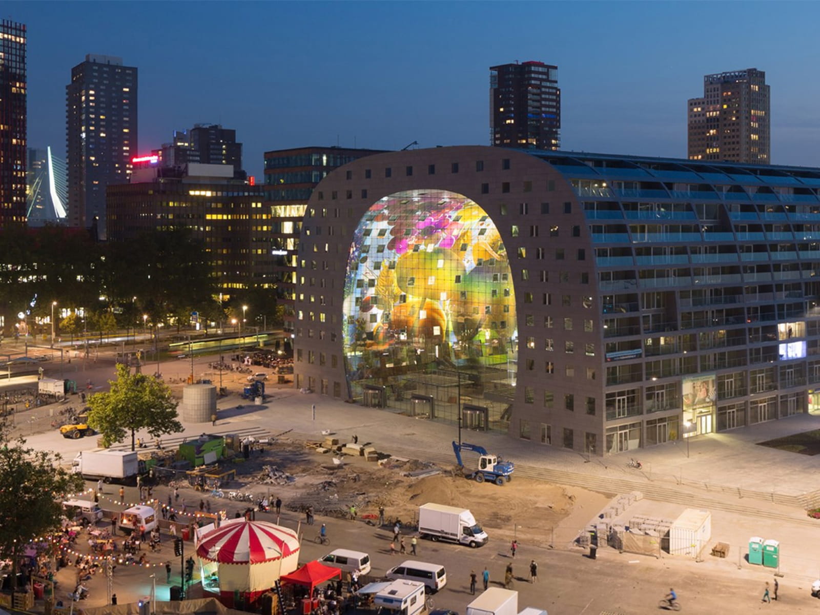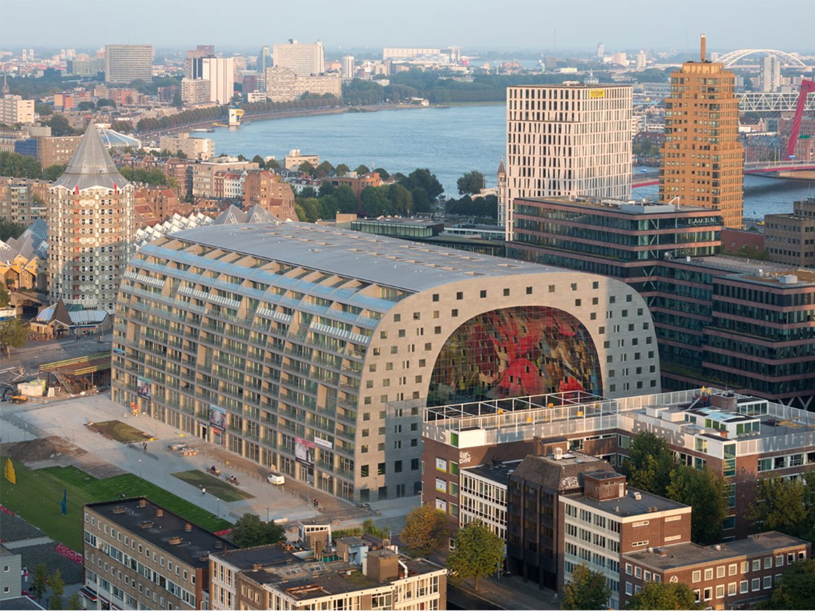 Markthal in Rotterdam, Netherlands, is a realised mixed-use project by MVRDV that integrates food, leisure, living, and parking into a single architectural work. Its defining feature is a large arch that houses privately developed apartments arranged above a covered square, creating a unique hybrid of market hall and public space.