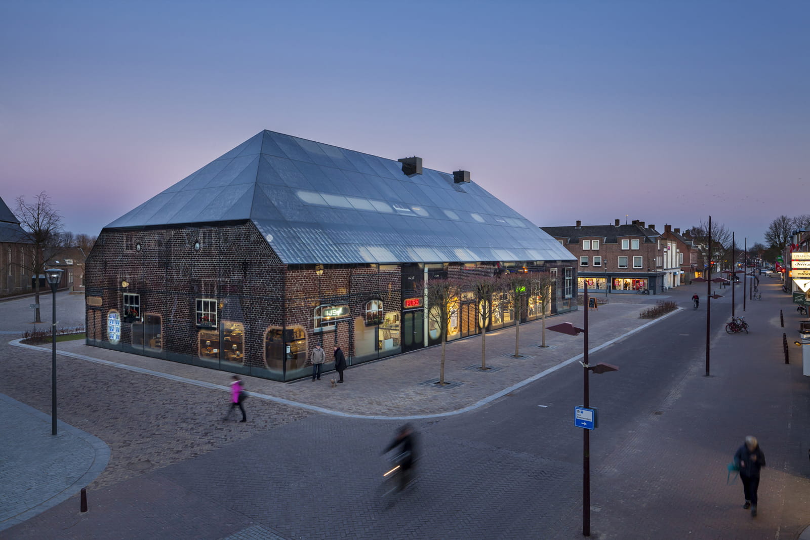 Scaled 1.6 times larger than a real farm, the design creates a monumental reinterpretation of the vernacular farmhouse. The 1,600 m² building houses a variety of public amenities including retail, cultural functions, bar-restaurants, and wellness spaces behind its striking glazed façade.