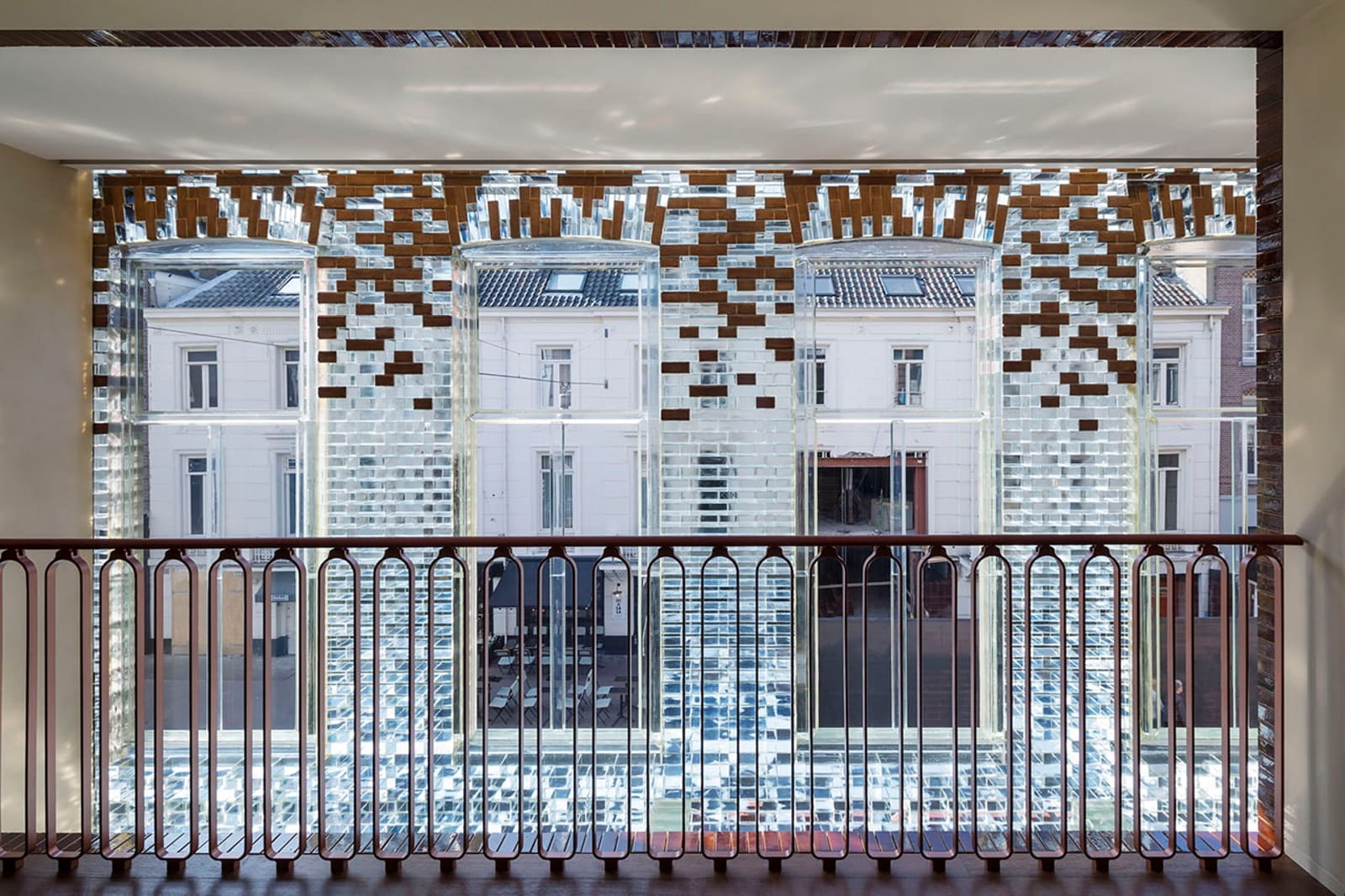 Beginning from a concept to combine Dutch heritage with international architecture, the façade design mimics traditional brick layering and detailing but is stretched vertically to comply with zoning and to increase interior space. Glass bricks gradually dissolve into a traditional terracotta brick façade for the upper residential portion, visually floating above the shop floor.