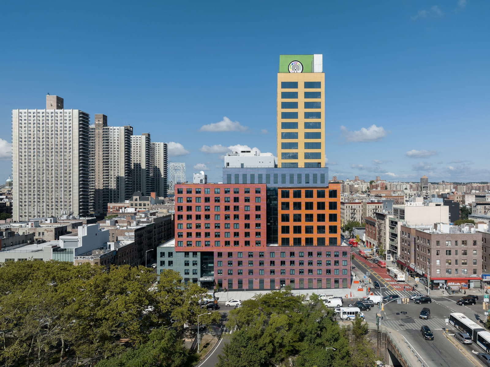 Radio Hotel and Tower is MVRDV’s first completed building in the United States, located in Upper Manhattan, New York. The design responds to its context through a distinctive stack of block-sized forms clad in eight different colours of glazed brick, creating what the architects describe as a vertical village that respects the scale of the neighbouring buildings while adding a bold presence to the skyline.