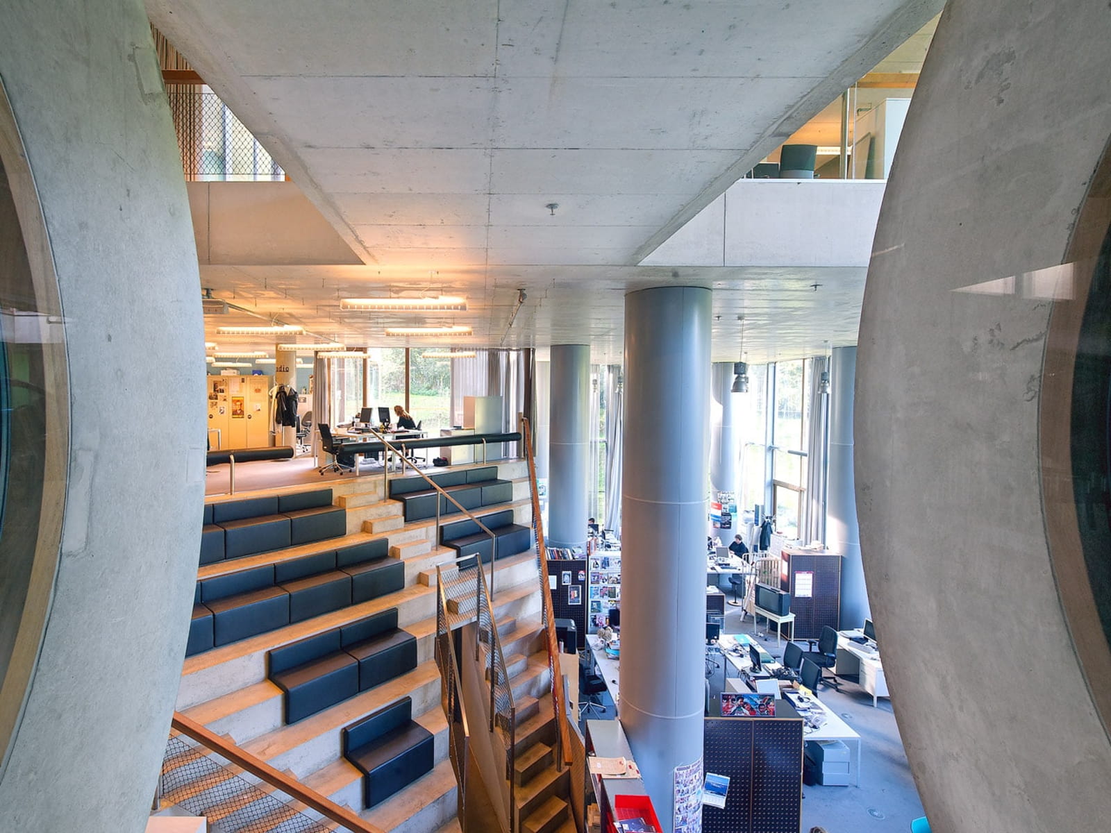 Villa VPRO, realised in 1997, is the first completed project by MVRDV, located in Hilversum, Netherlands. Inspired by the informal spatial qualities of the broadcasting company’s former villas, the design departs from traditional office typologies by creating an undulating, stepped concrete landscape that allows people to transition seamlessly between floors.