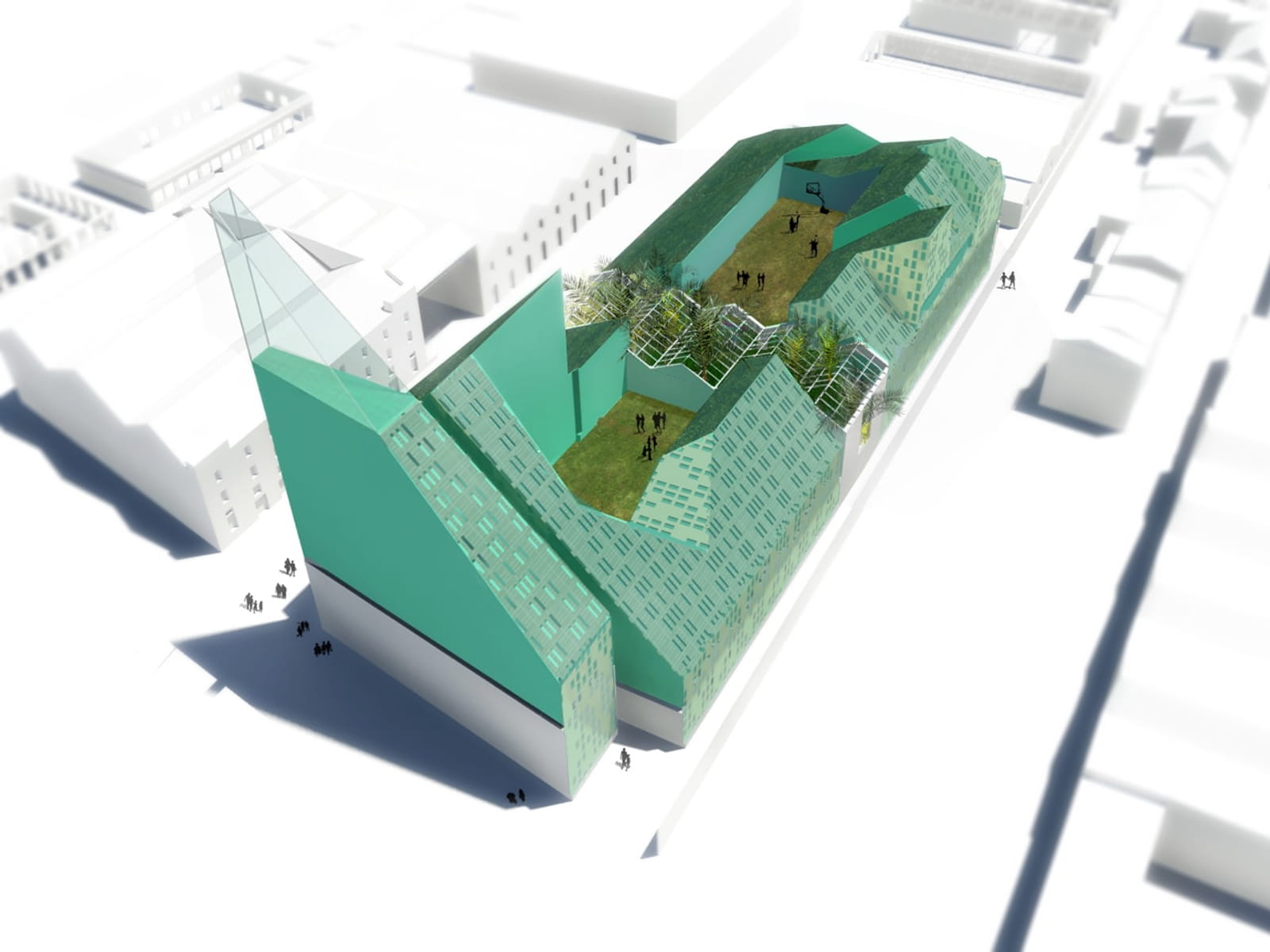 Rather than treating nature and technology as opposites, the design proposed that they could reinforce one another, creating multi-level public spaces that extend the existing landscape and allow for visibility, accessibility, and interaction.