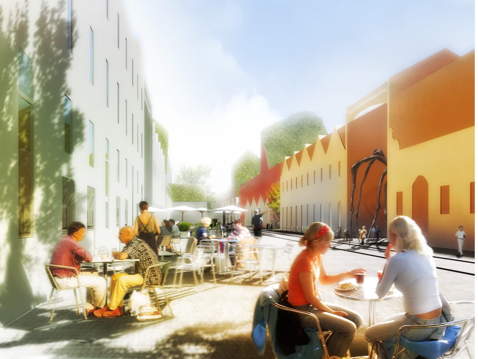 Beneath the arch, the central market hall comes alive during the day with 96 fresh-food stalls and a variety of products, while restaurants and cafés enliven the space into the evening. The programme includes retail units, a supermarket, and a centre for healthy-eating education, all designed to be seamlessly part of the everyday life of residents and visitors alike.