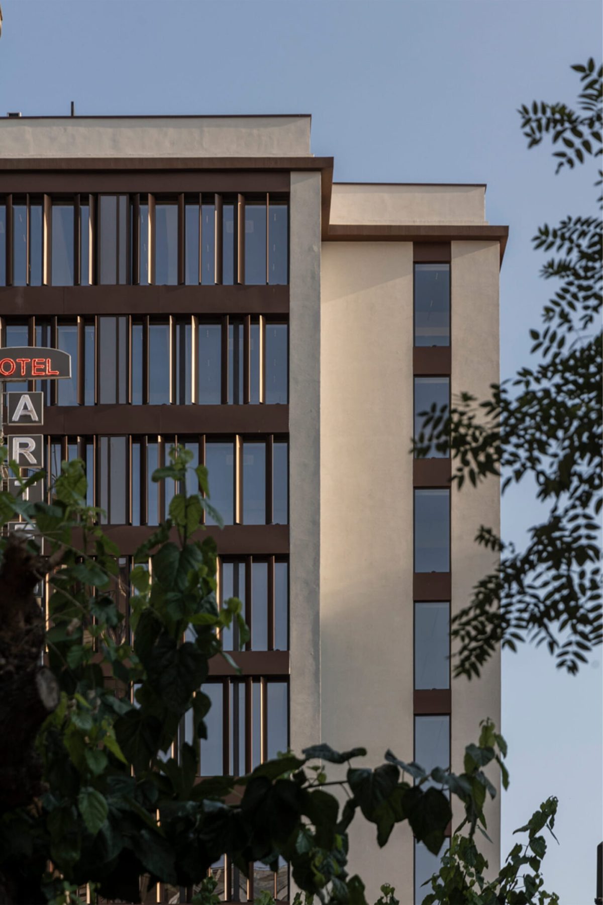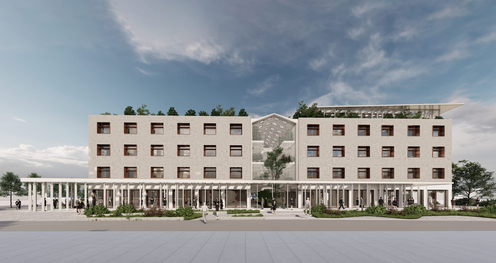 Κεντρικό στοιχείο της πρότασης αποτελεί ο νέος εξωτερικός φλοιός του κτίσματος. Τα κατακόρυφα προκατασκευασμένα στοιχεία —«the wings»— τοποθετούνται στις όψεις του κτηρίου, λειτουργώντας ταυτόχρονα ως χαρακτηριστικό αναγνωρίσιμο στοιχείο και ως σύστημα σκίασης, εξασφαλίζοντας ηλιακή προστασία καθ’ όλη τη διάρκεια της ημέρας. Η υλικότητά τους, σε γήινες αποχρώσεις, προσδίδει μια θερμότερη εικόνα στο αστικό τοπίο, χωρίς να ανταγωνίζεται τα γειτονικά ιστορικά κτήρια.