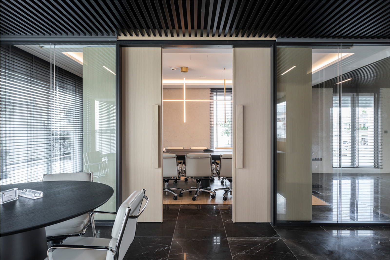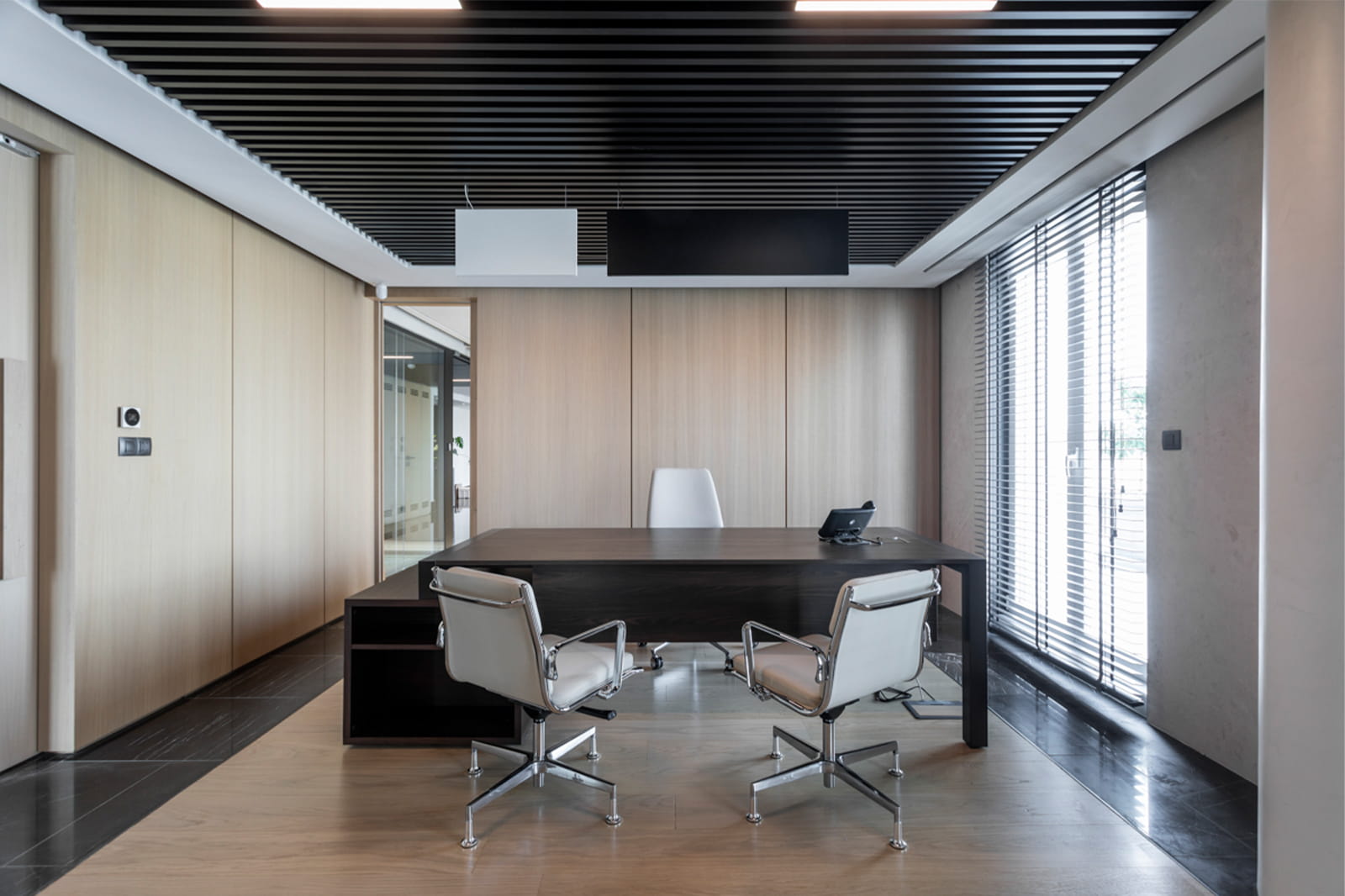 Η υλικότητα στηρίζεται σε ουδέτερη παλέτα φυσικών υλικών –ξύλο και μάρμαρο– με διακριτικές χρυσές λεπτομέρειες, συνθέτοντας ένα περιβάλλον πολυτέλειας και βιωσιμότητας. Ιδιαίτερη έμφαση δόθηκε στη διατήρηση και αποκατάσταση υφιστάμενων στοιχείων, μειώνοντας το περιβαλλοντικό αποτύπωμα. Η διαμόρφωση της βεράντας, με βιοκλιματική πέργκολα και φυτεύσεις, ενισχύει τη σύνδεση του χώρου εργασίας με την πόλη και το φυσικό στοιχείο. Το αποτέλεσμα είναι ένας σύγχρονος, ευέλικτος και «ζεστός» εργασιακός χώρος, που συνδυάζει απλότητα, λειτουργικότητα και αρχιτεκτονική συνέπεια.