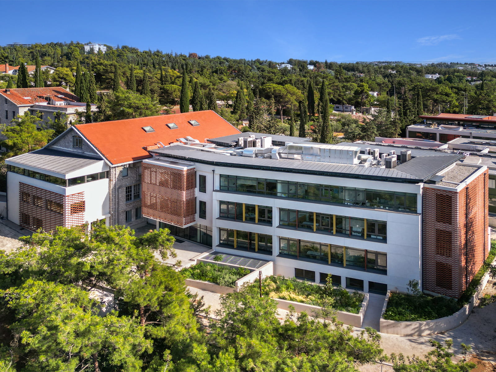 Η αρχιτεκτονική πρόθεση είναι διπλή: από τη μία, μια αναγνωρίσιμη παρουσία μέσα στο campus, και από την άλλη, μια περιβαλλοντική λογική που αξιοποιεί το μικροκλίμα και τα φυσικά στοιχεία ενώ το κέλυφος εξασφαλίζει καλύτερες εσωτερικές συνθήκες και μειωμένες απώλειες. Οι σχεδιαστικές αυτές προθέσεις μεταφράζονται σε χώρους που δεν στηρίζονται στη διακόσμηση για να πείσουν, αλλά στη ρυθμισμένη σχέση φωτός, υλικότητας και ροής.