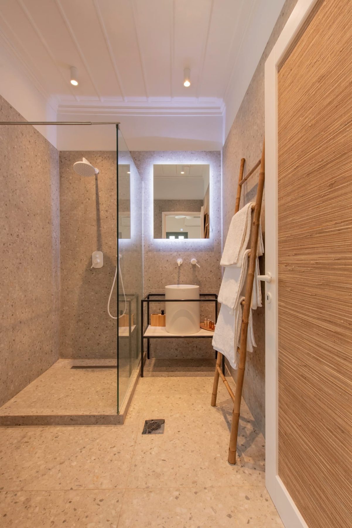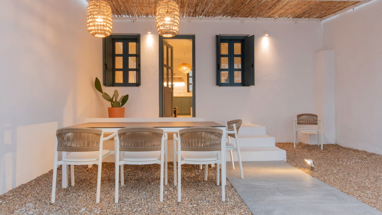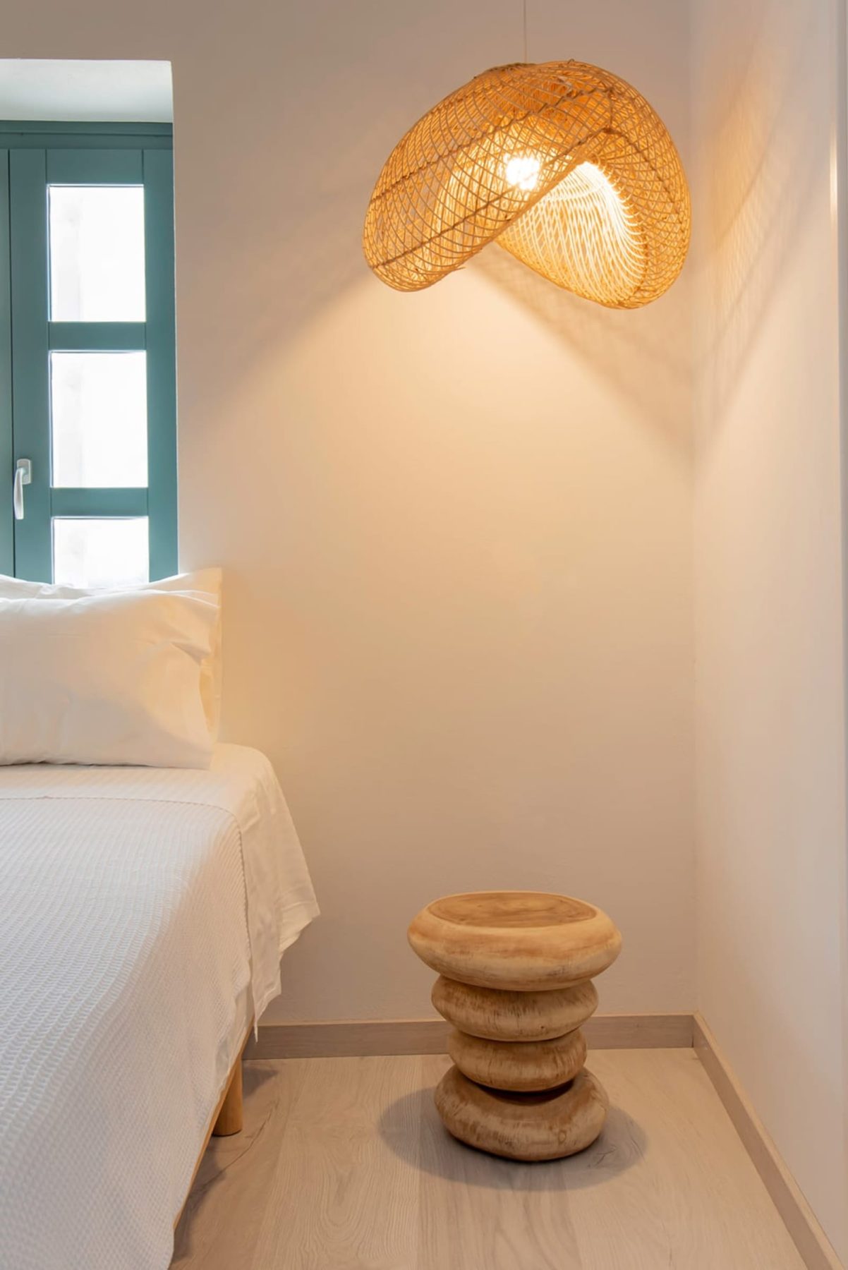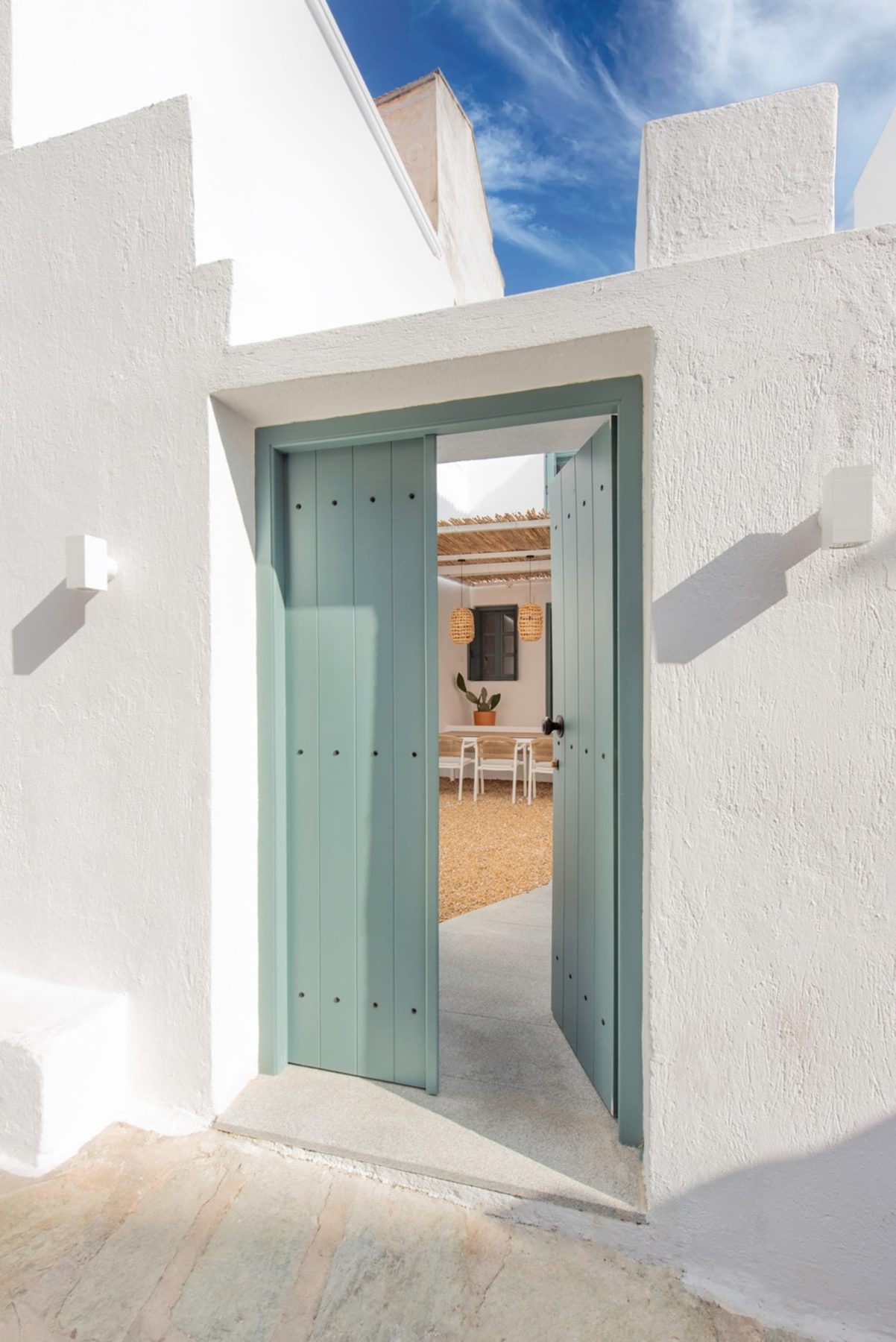 Τα δάπεδα των εσωτερικών χώρων καλύπτονται από ξύλινες σανίδες δρυός και πέτρινες πλάκες σε αντίστοιχες αποχρώσεις, ενώ η επίπλωση, με επιλεγμένα στοιχεία, ακολουθεί τη φιλοσοφία του νησιωτικού σπιτιού. Κεντρικό ρόλο στη σύνθεση έχει η αυλή, ένα σπάνιο στοιχείο για κτήριο στο κέντρο του νησιού, η οποία σχεδιάστηκε ως φυσική προέκταση του εσωτερικού. Οι διαφορετικές στάθμες διαμορφώνουν ποικίλες χρήσεις: έναν υπαίθριο χώρο καθιστικού, μικρές γωνιές χαλάρωσης με boho στοιχεία και ένα υπαίθριο ντους σε υπερυψωμένη πλατφόρμα από σκυρόδεμα. Το Skopelos Suites προτείνει ένα ήσυχο, σύγχρονο καταφύγιο, βαθιά συνδεδεμένο με τον τόπο και την κλίμακα του νησιού.