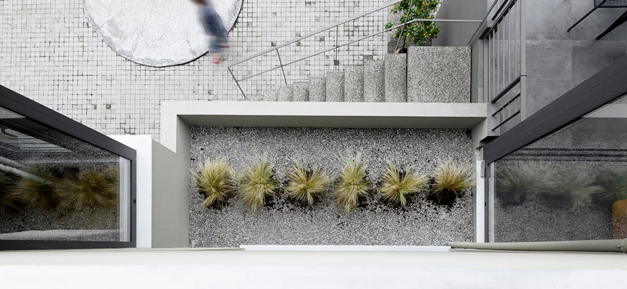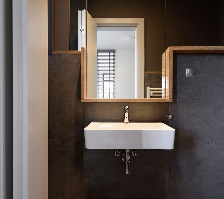 Grey hues were chosen for walls and floors in the interior public spaces, while in private spaces the warm tones of oak predominate.