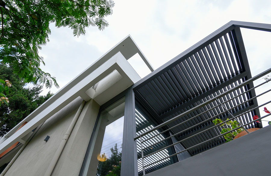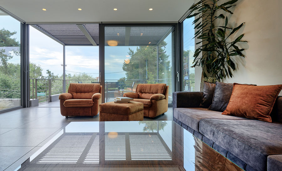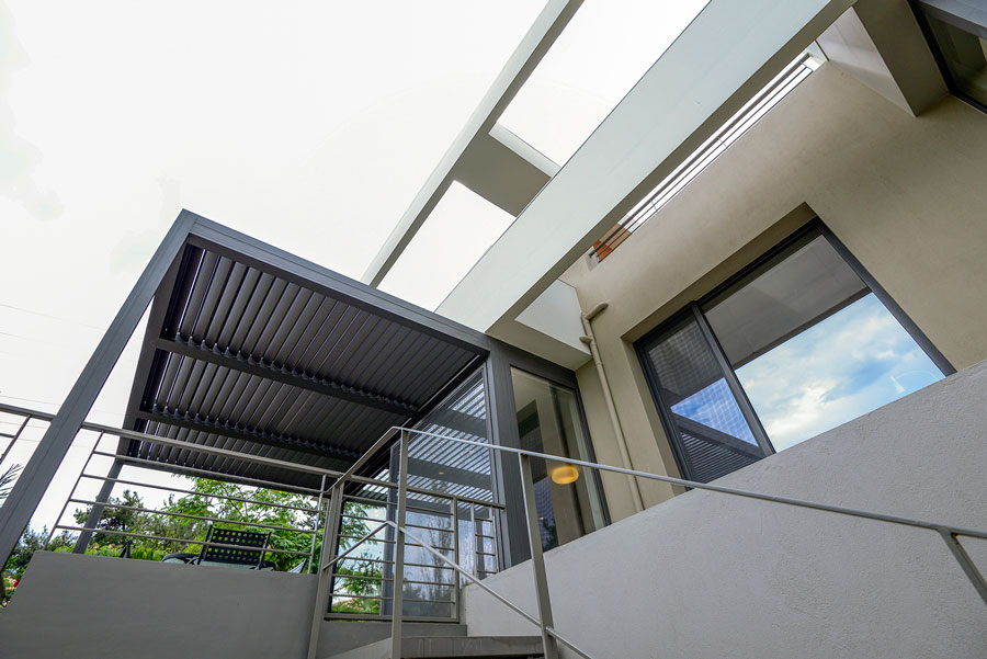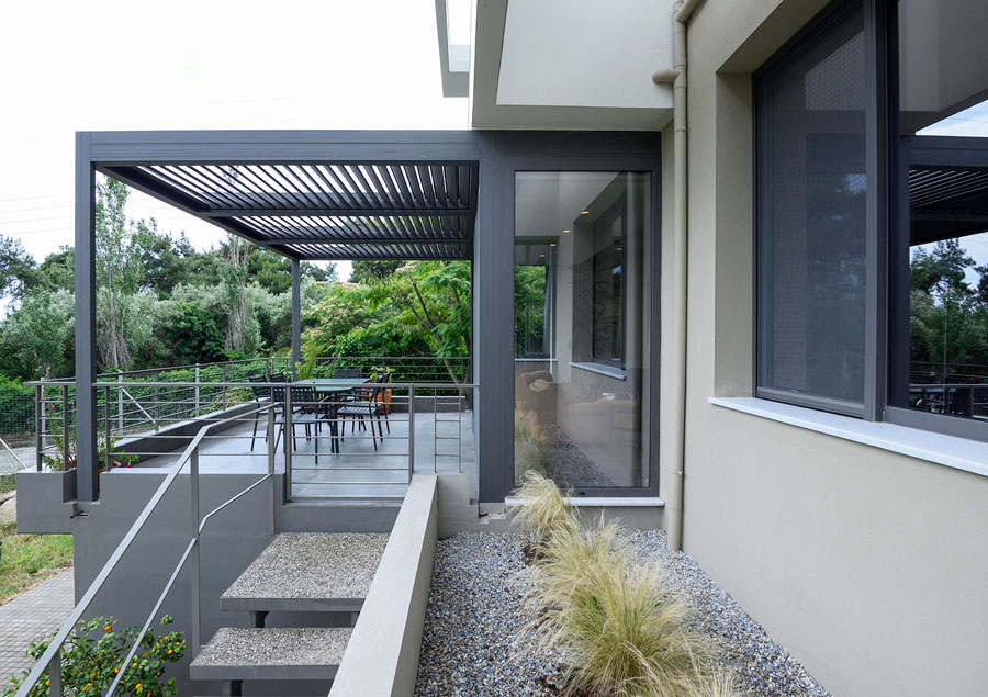 Το καθιστικό,συνεχίζεται σε μια βεράντα η οποία προβάλλει από τον κυρίως όγκο του κτιρίου. Η βεράντα στεγάζεται από μία μεταλλική πέργκολα με κινητά πτερύγια, που δίνουν τη δυνατότητα της ρύθμισης της σκίασης αλλά και της πλήρους στέγασης του χώρου κατά τις βροχερές ημέρες.
