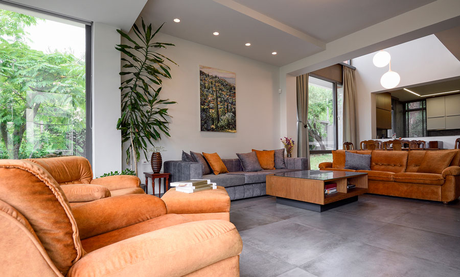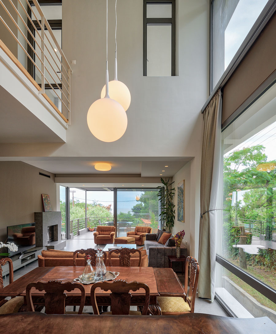 Ο διπλού ύψους χώρος αποτελεί το “κέντρο”της κατοικίας. Ενα μεγάλο υαλοστάσιο καταλαμβάνει όλο το ύψος της νότιας όψης του, συλλέγοντας την ακτινοβολία του χειμωνιάτικου ήλιου και μεταδίδοντας τη θερμότητα στο εσωτερικό της κατοικίας, με εντυπωσιακά αποτελέσματα.