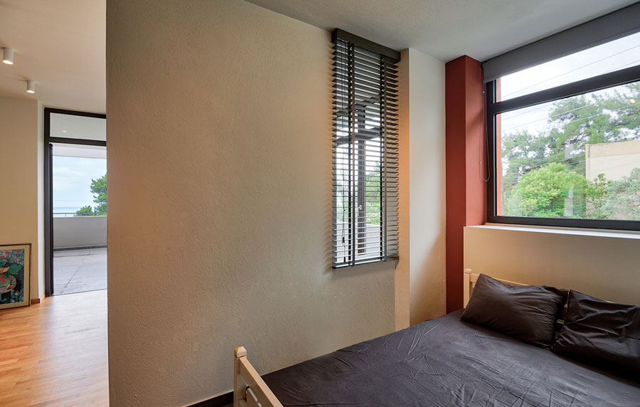 On the first floor, above the living room and kitchen, a transitional area operates on occasion as a guest room. From there one reaches the terrace via an open hallway that passes through a double-height interior with a southern orientation, and ends in a semi-sheltered space. This is intended to become a second living room with a sea view.