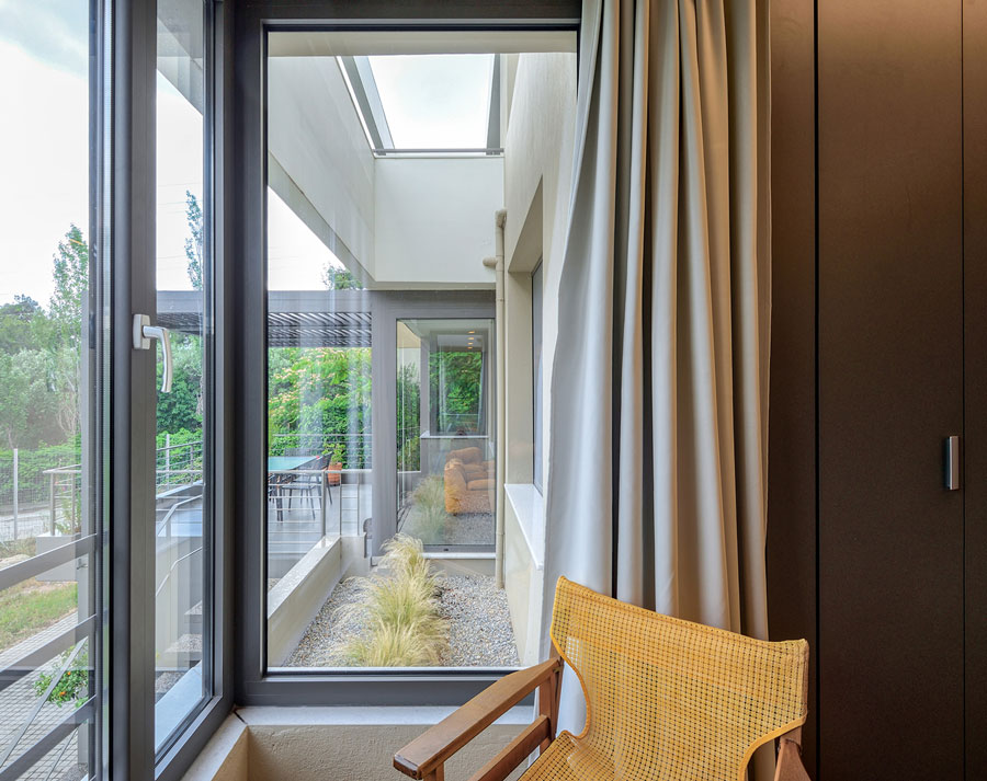 On the eastern façade, large floor-to-ceiling window panes connect the interior with the courtyard and greenery. A Π-shaped pane in the living room offers sightlines toward the verandah, the courtyard and a small raised garden. The corner window of the bedroom and the centrally-located office offer similar sightlines.