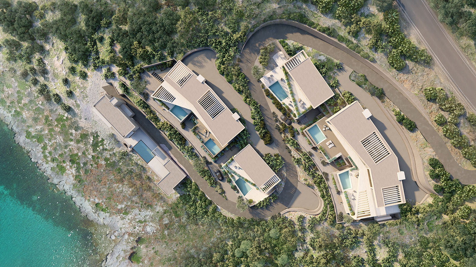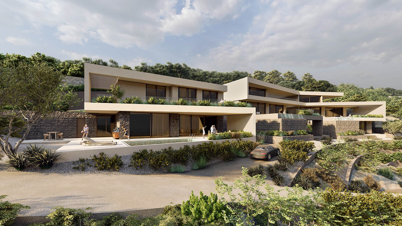 The six residences are strategically arranged in two clusters: three on the upper plateau and three mirrored on the lower level. The complex is crossed by an S shaped road that connects to auxiliary roads, facilitating smooth vehicle circulation to both the upper terraces and the lower levels near the residences’ entrances. Each residence is carefully positioned to maximize unobstructed views of the sea, fostering an immersive connection with the surroundings.