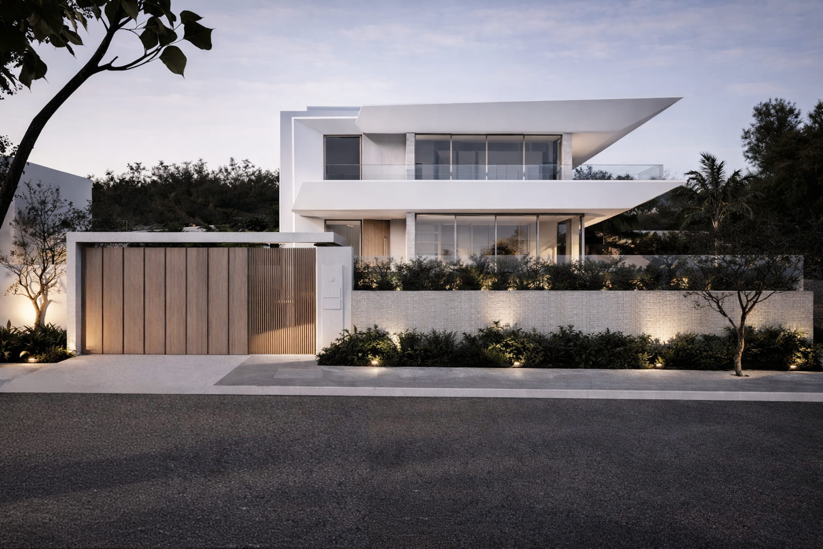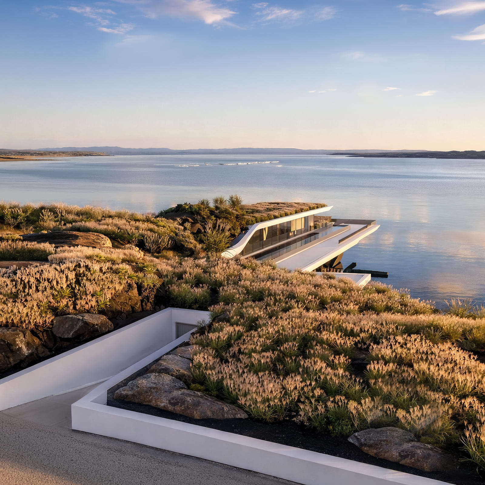 Από εκεί διαμορφώθηκε η κατεύθυνσή της: έργα που συλλαμβάνονται ως γλυπτά στον χώρο, με εικαστική πρόθεση και μια ιδιαίτερη ένταση. Αυτή είναι η περίπτωση της Villa Earth, η οποία έγινε viral, κυρίως, επειδή εισήγαγε μια σπάνια τυπολογία: όχι μια παραθαλάσσια κατοικία στραμμένη προς τη θέα, αλλά μια κατοικία οργανωμένη γύρω από την ίδια τη ναυσιπλοΐα. Ένας ιδιωτικός λιμένας «πλέκεται» με την πισίνα, ώστε το νερό να λειτουργεί ως κυκλοφορία.