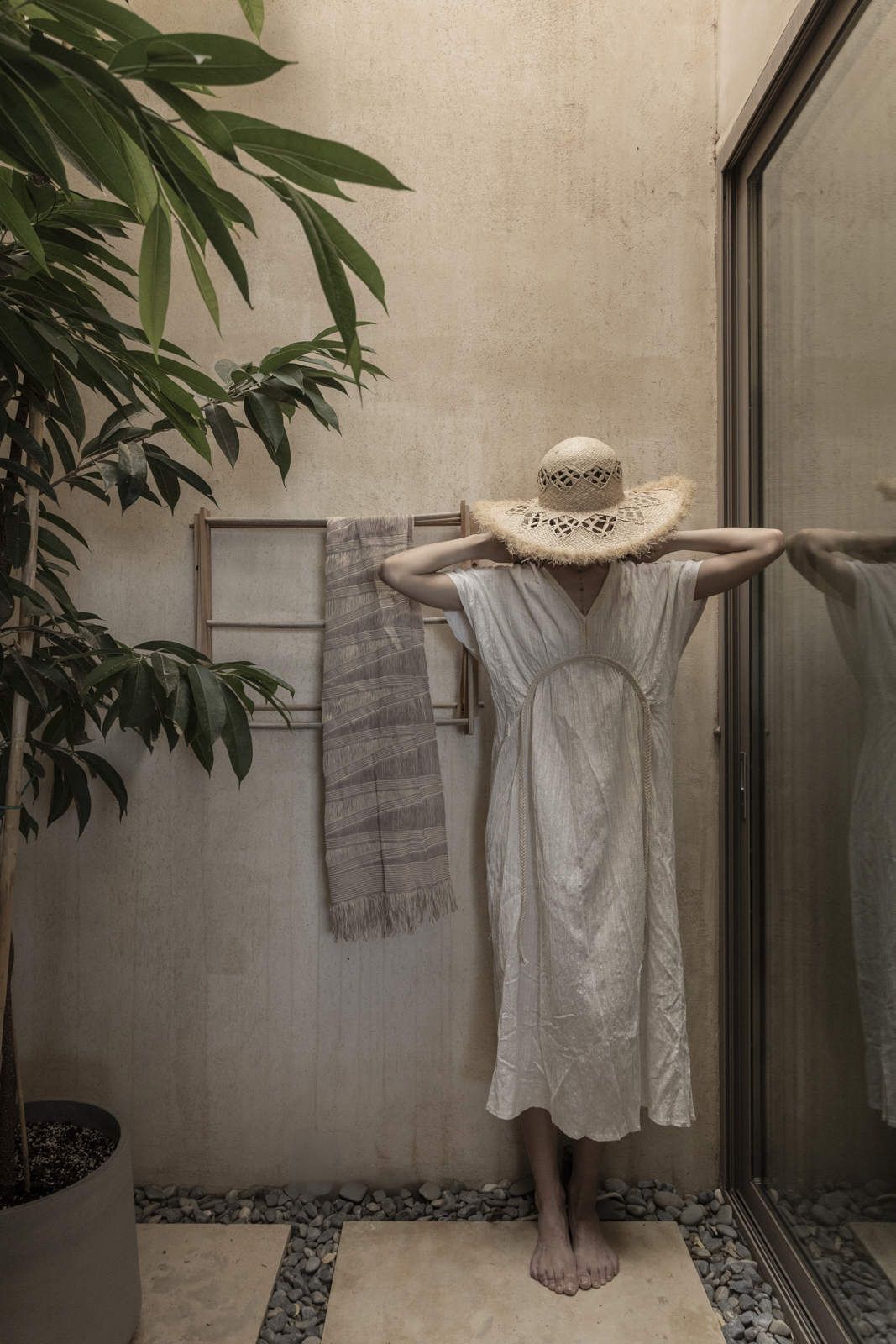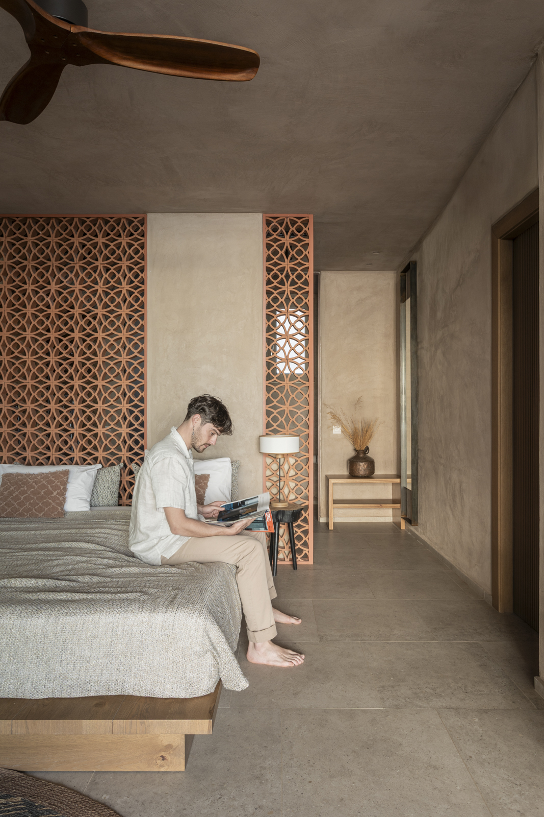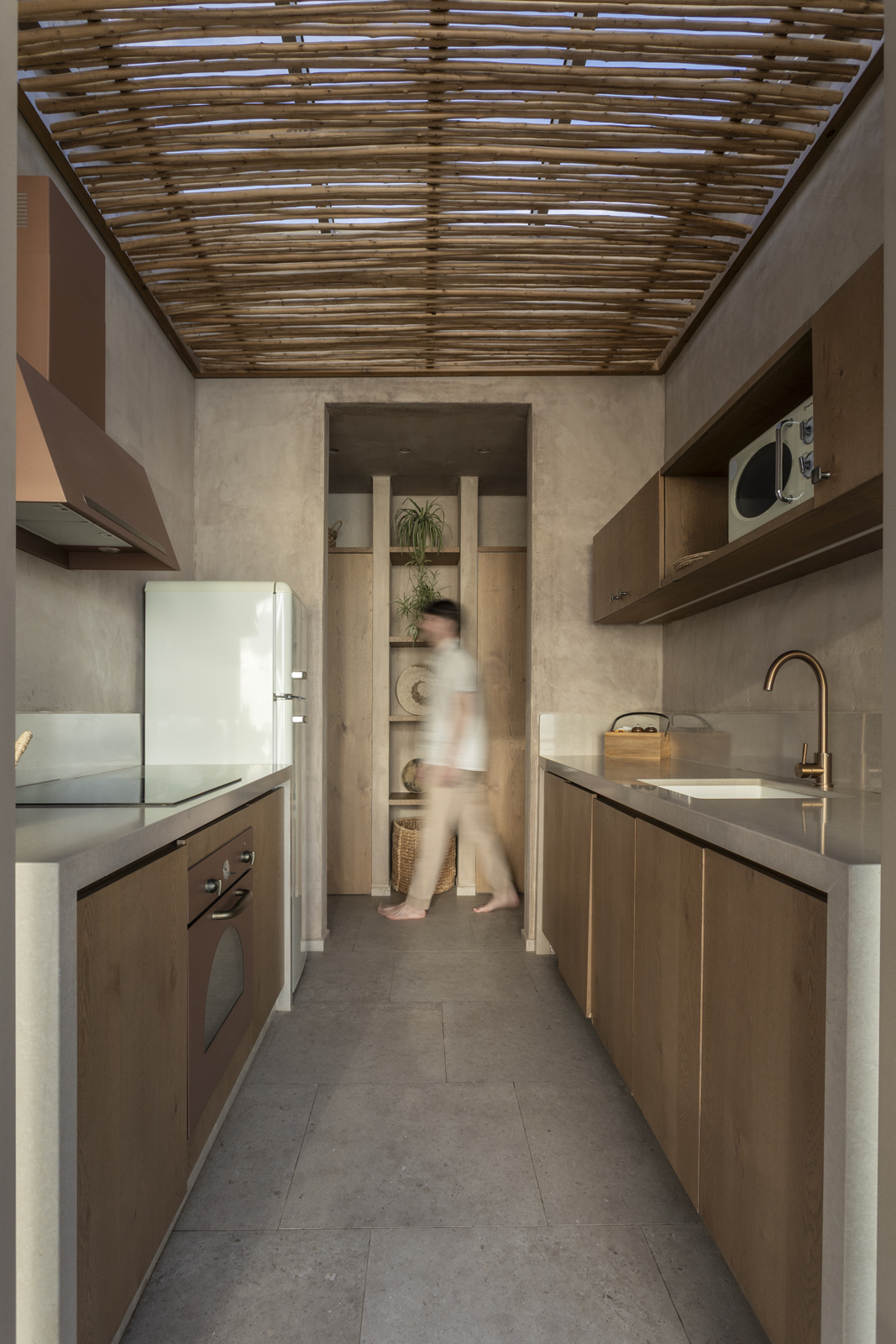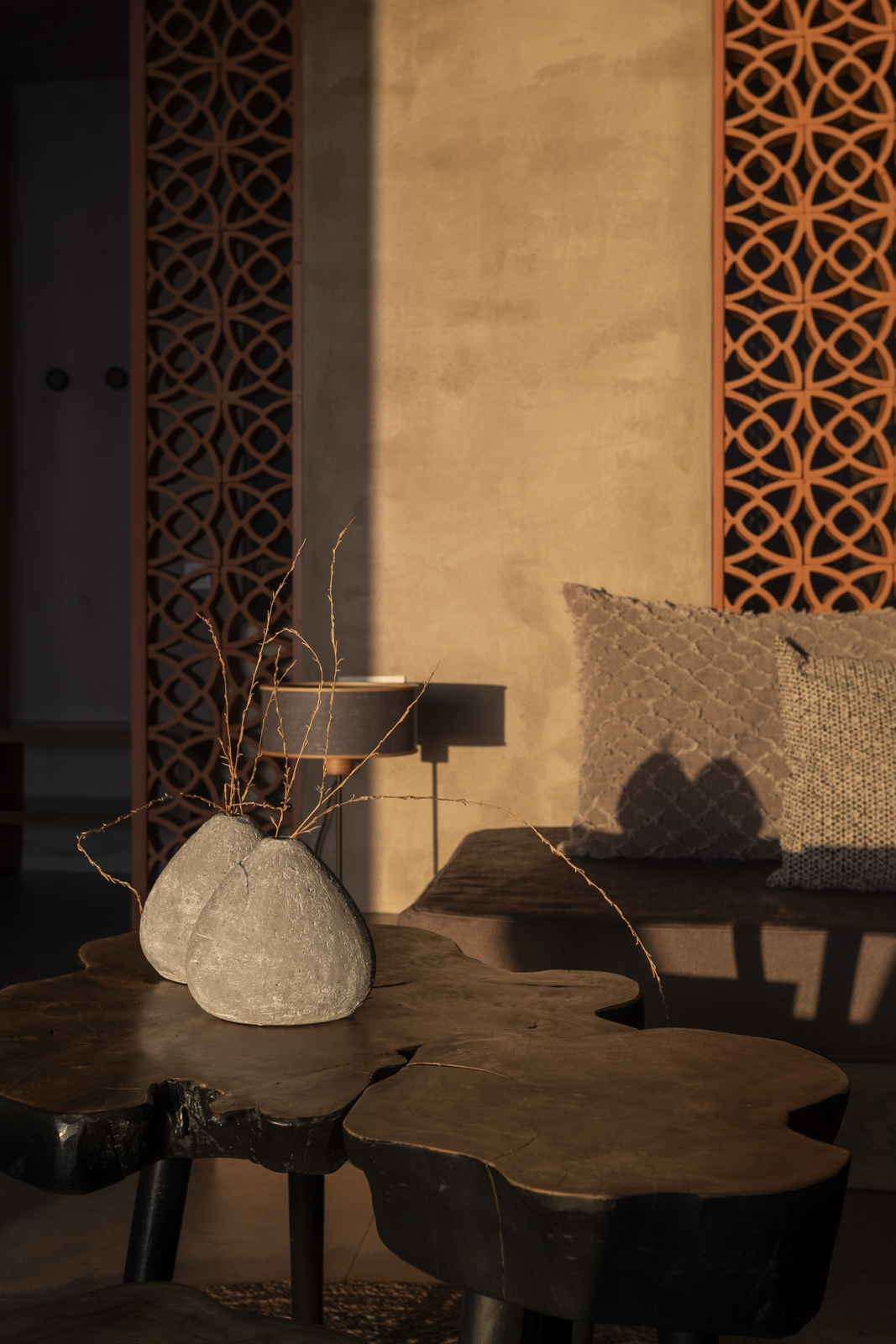 Το φως αντιμετωπίζεται ισότιμα με το χώμα και το σκυρόδεμα. Καλαμωτές φιλτράρουν το φως, δημιουργώντας ένα μεταβαλλόμενο πλέγμα σκιάς. Οι αδρές υλικότητες, οι γήινοι τόνοι των επιχρισμάτων και οι ξύλινες υφές συγκροτούν μια παλέτα που βασίζεται στην εντοπιότητα.
