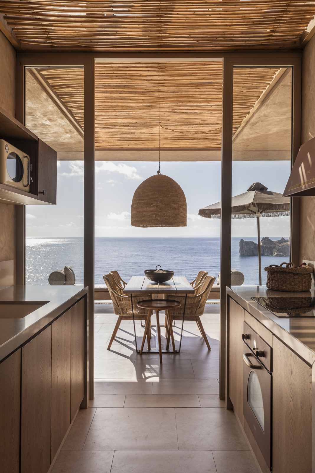 Στο εσωτερικό, η εμπειρία οργανώνεται μέσω μιας σαφούς χωρικής συνθήκης: οι κύριοι χώροι διαβίωσης εκτονώνονται προς τη θάλασσα, καδράροντας αποκλειστικά τον ορίζοντα, ενώ οι ιδιωτικές λειτουργίες εδράζονται βαθύτερα στο έδαφος.
