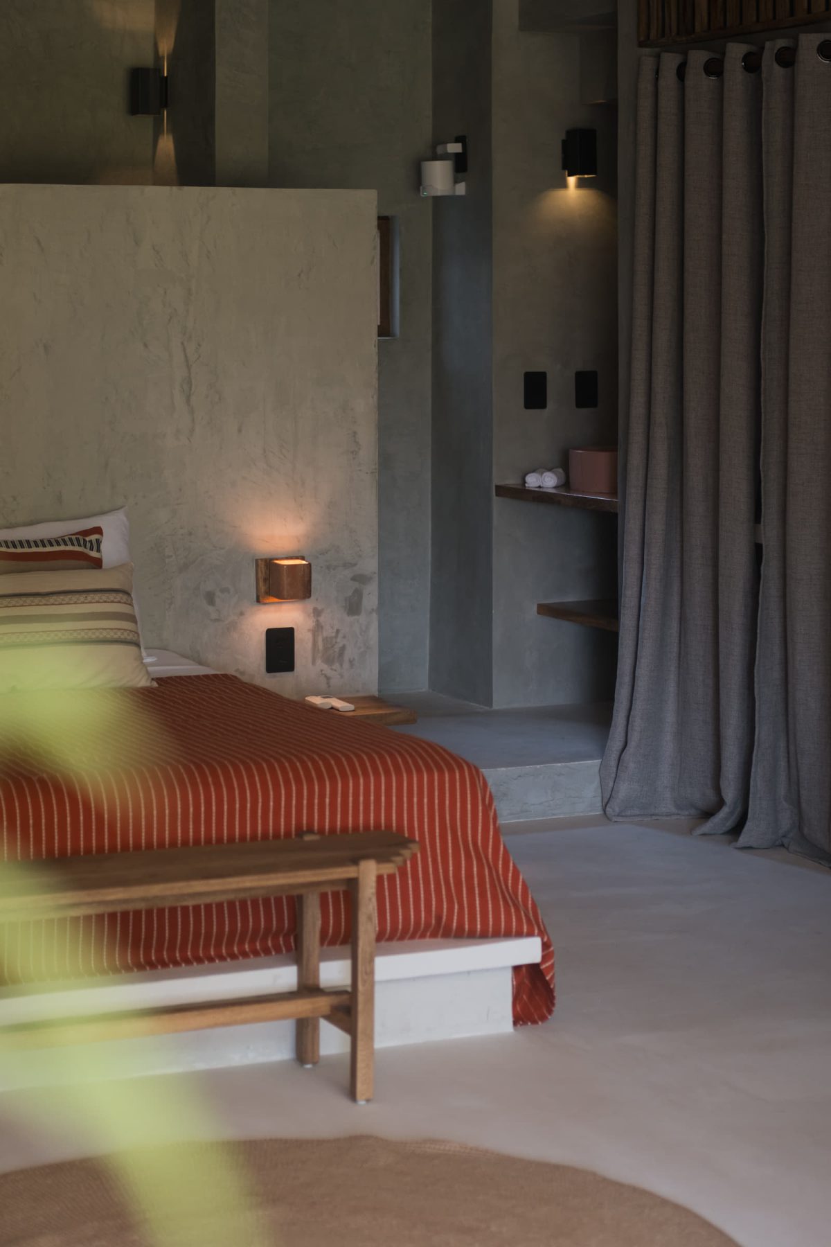 The use of wood throughout the project further softens the spaces, creating wind tunnels that refresh guests and a permanent play of fabrics and curtains that decorate the interiors, sensually opening and breaking up the spaces.