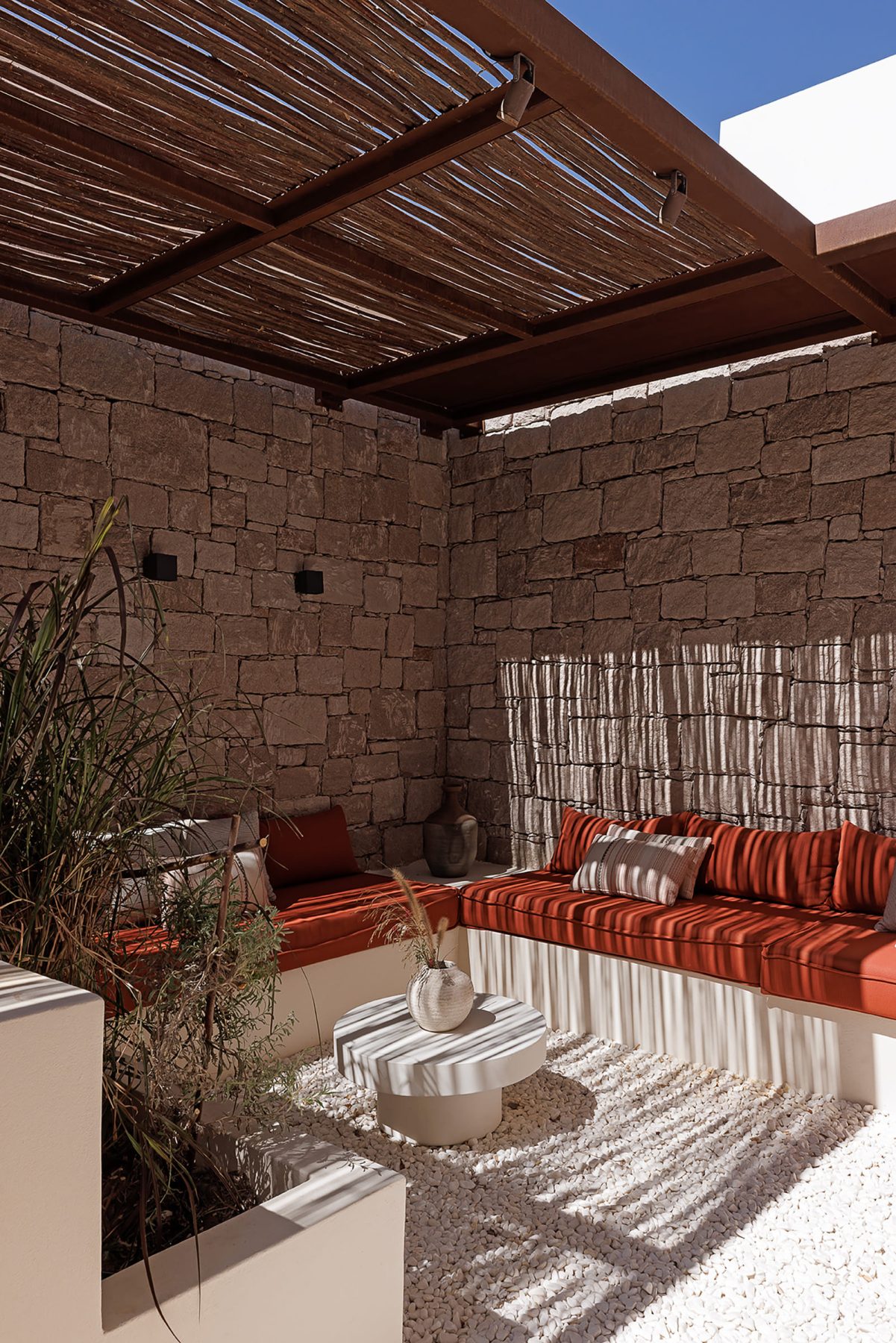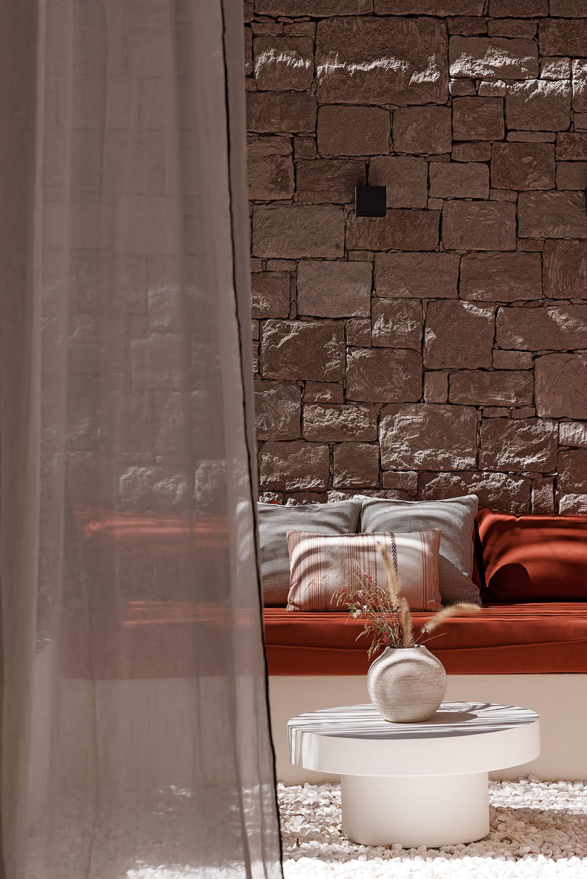 The courtyard, the “heart” of the Cycladic house, becomes here a place of meeting and gathering, a secret garden sheltered from the wind, where guests come together as one community.