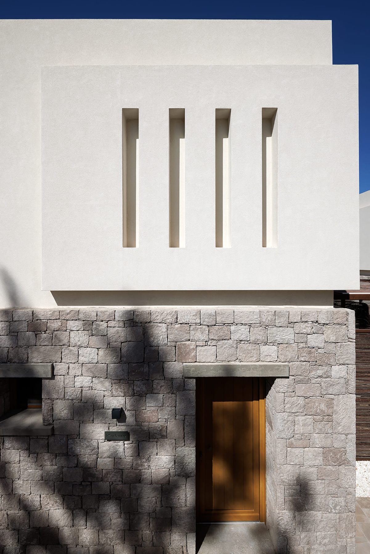 Έξι σουίτες με εσωτερικά διπλό ύψος φιλοξενούν τους επισκέπτες σε χώρους λιτούς και φωτεινούς. Η αίσθηση της απλότητας και της αμεσότητας κυριαρχεί, αφήνοντας το βλέμμα να ταξιδέψει ανάμεσα σε αντιθέσεις: πέτρα και λευκό, σκιά και φως, απομόνωση και κοινότητα.