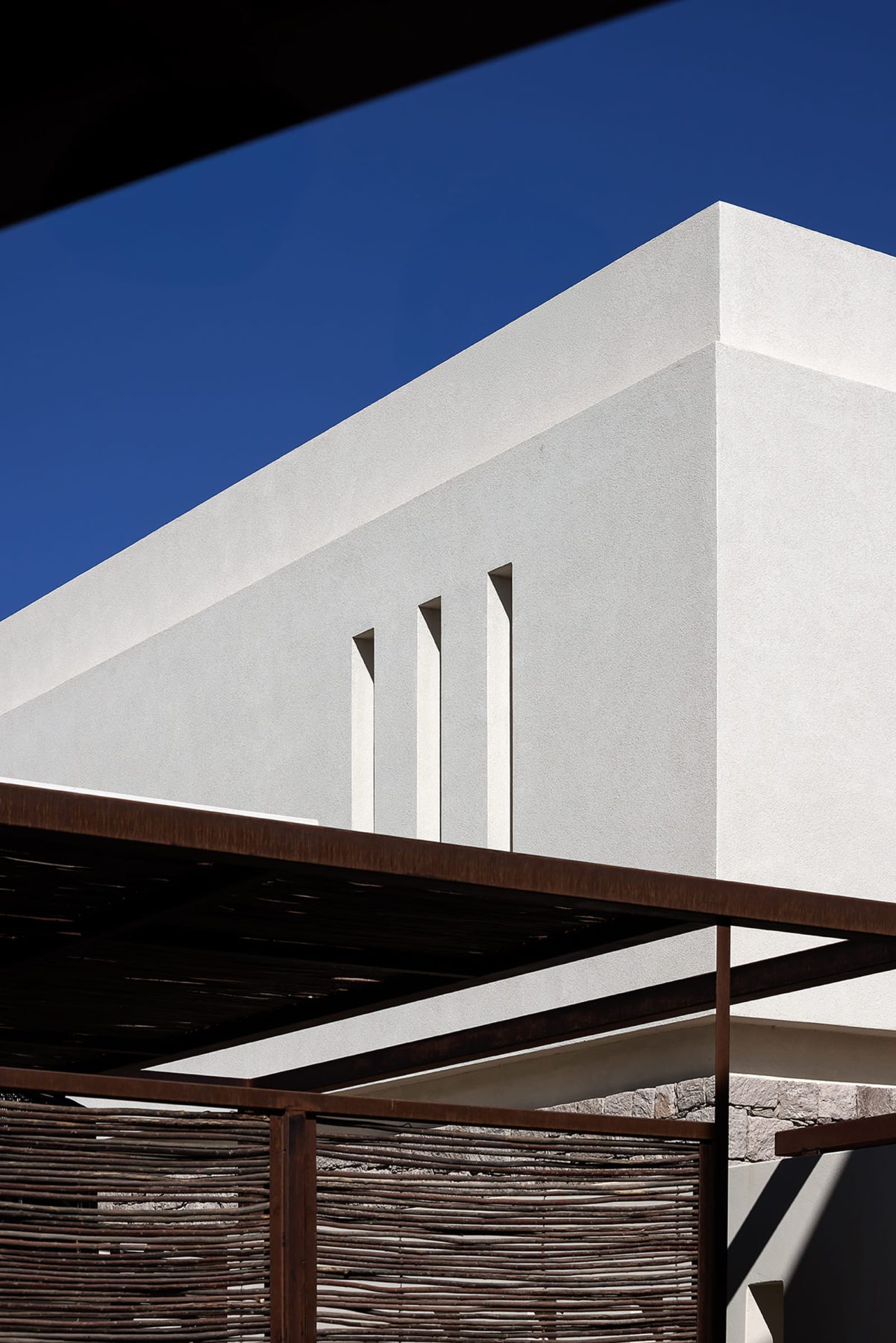 Στην πέτρα και το λευκό προστίθεται ένα τρίτο επίπεδο υλικότητας: οι μεταλλικές πέργκολες και τα κατακόρυφα στοιχεία από corten που ορίζουν τα όρια των κήπων, φιλτράρουν το φως και χαράζουν στιγμές απομόνωσης και ιδιωτικότητας.