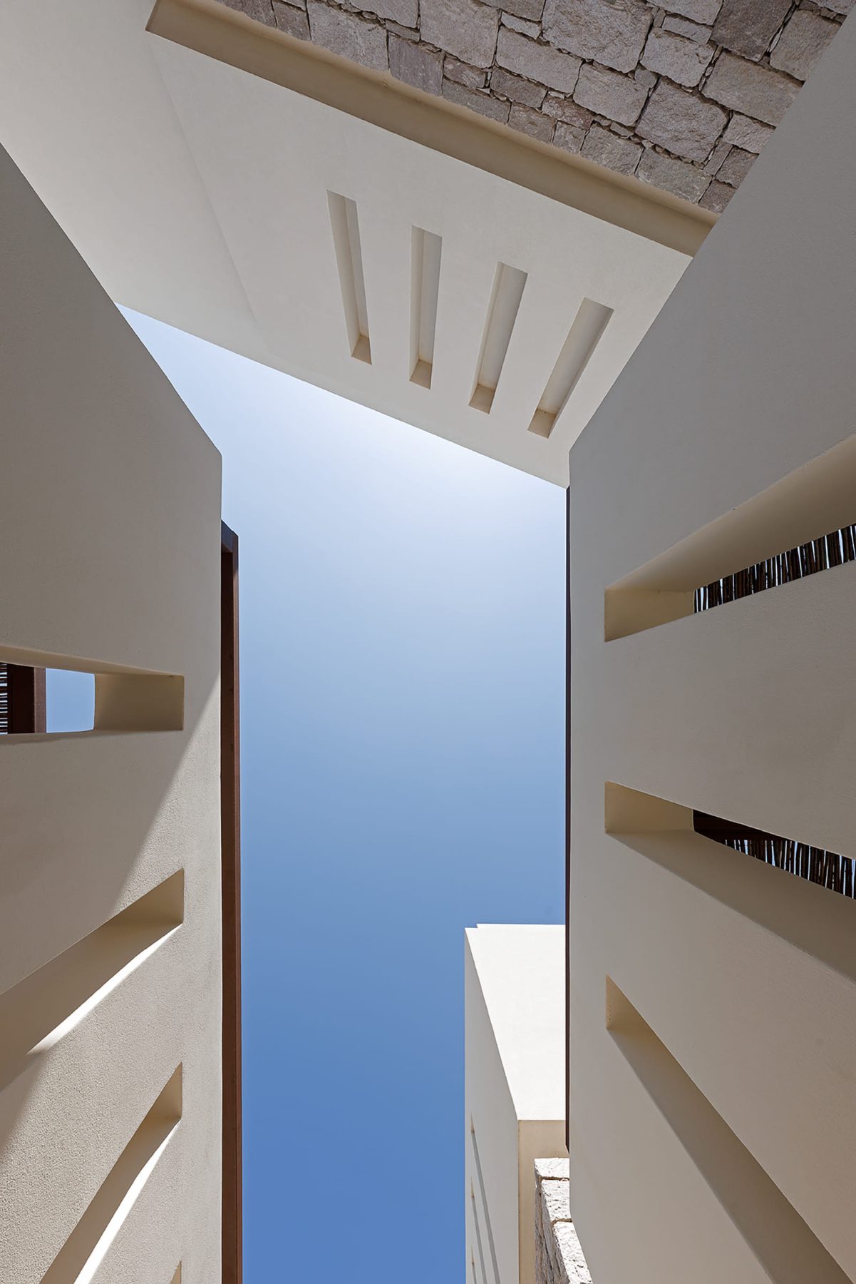 Six suites with double-height interiors welcome guests into spaces that are simple and luminous. A sense of clarity and directness prevails, allowing the eye to travel between contrasts, stone and white, shadow and light, solitude and togetherness.