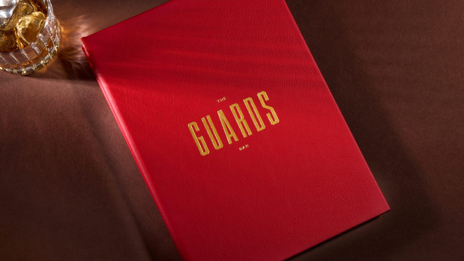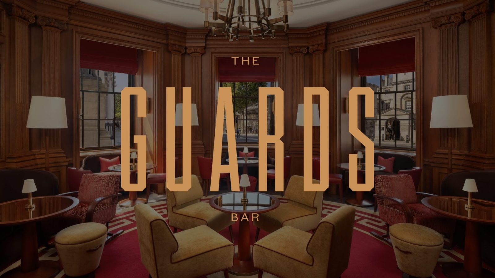 The Guards Bar and Lounge sits opposite Horse Guards Parade and Buckingham Palace, its branding tinted in regal red and gold and informed by the trim, medals and silhouette of the Household Cavalry and the Royal Sentry Box; menu design mirrors uniform detailing and the logotype adopts the firm, condensed forms seen in ceremonial lettering.