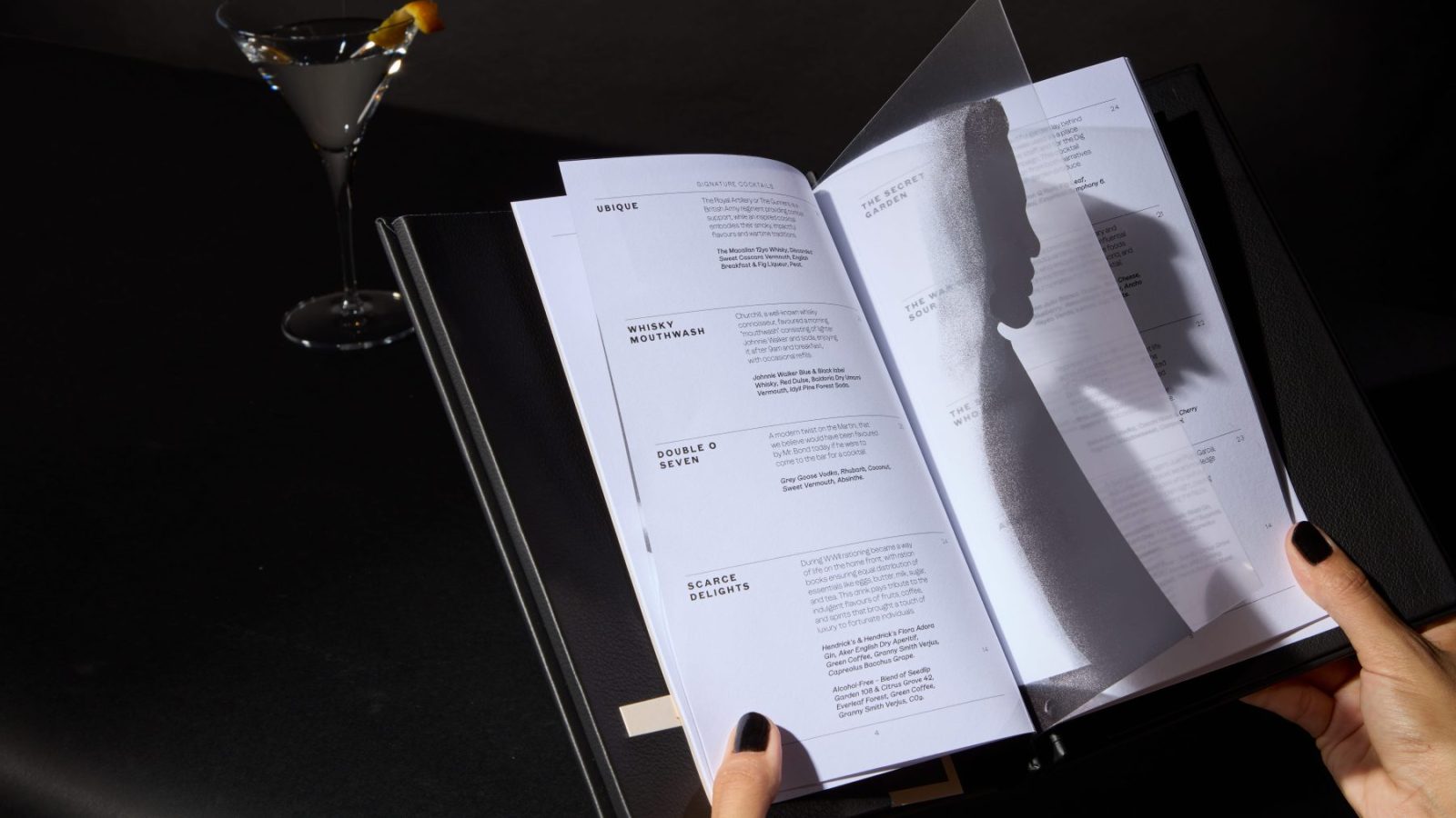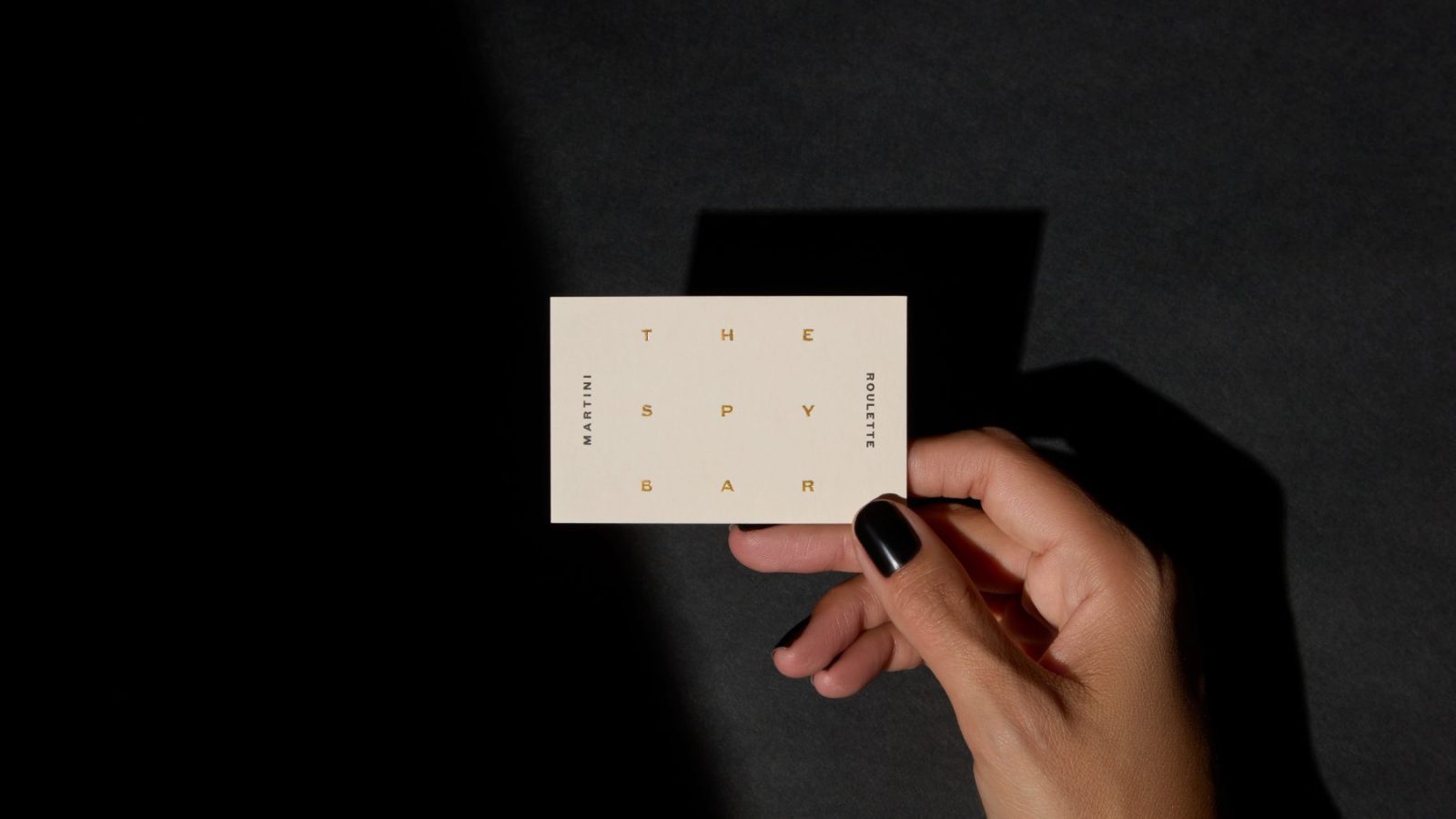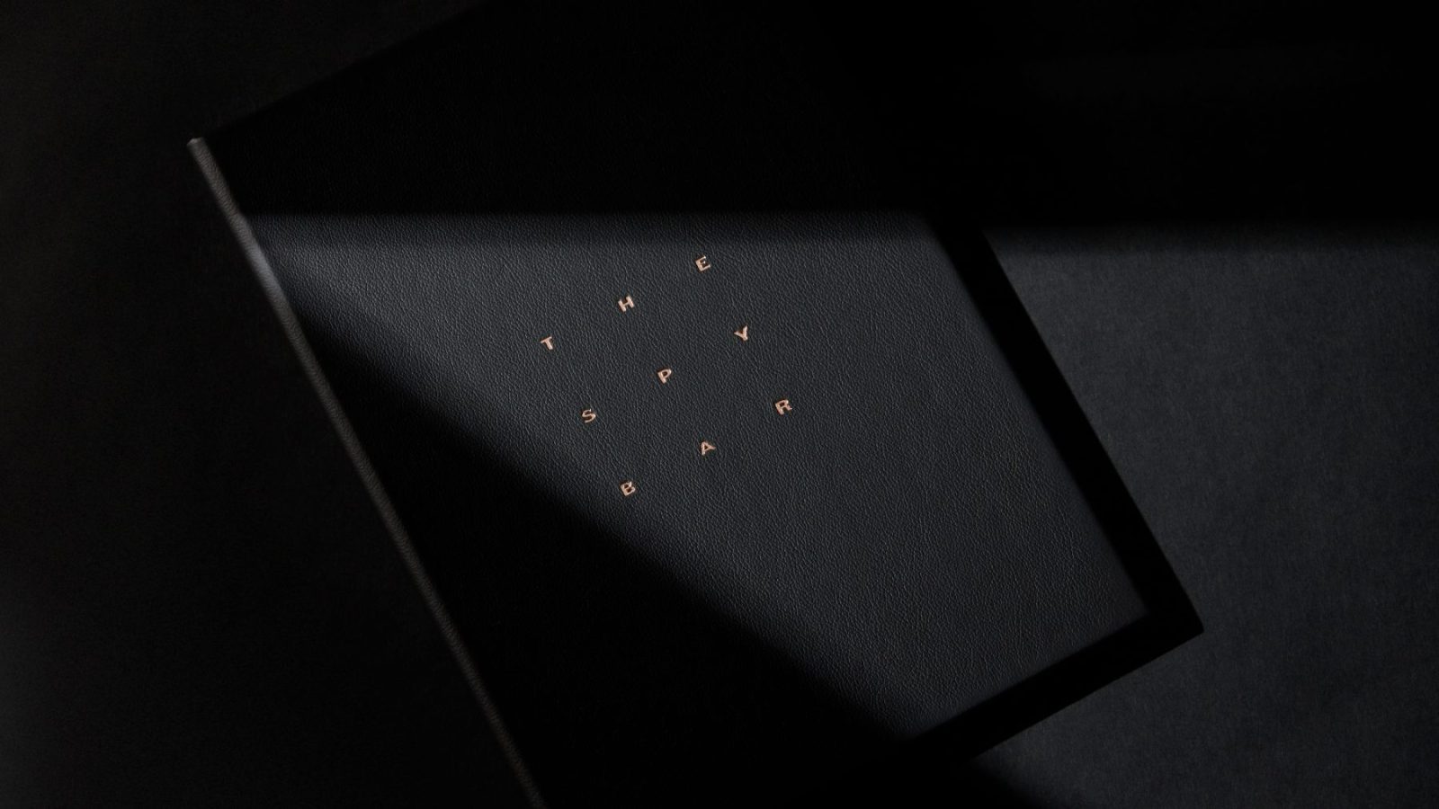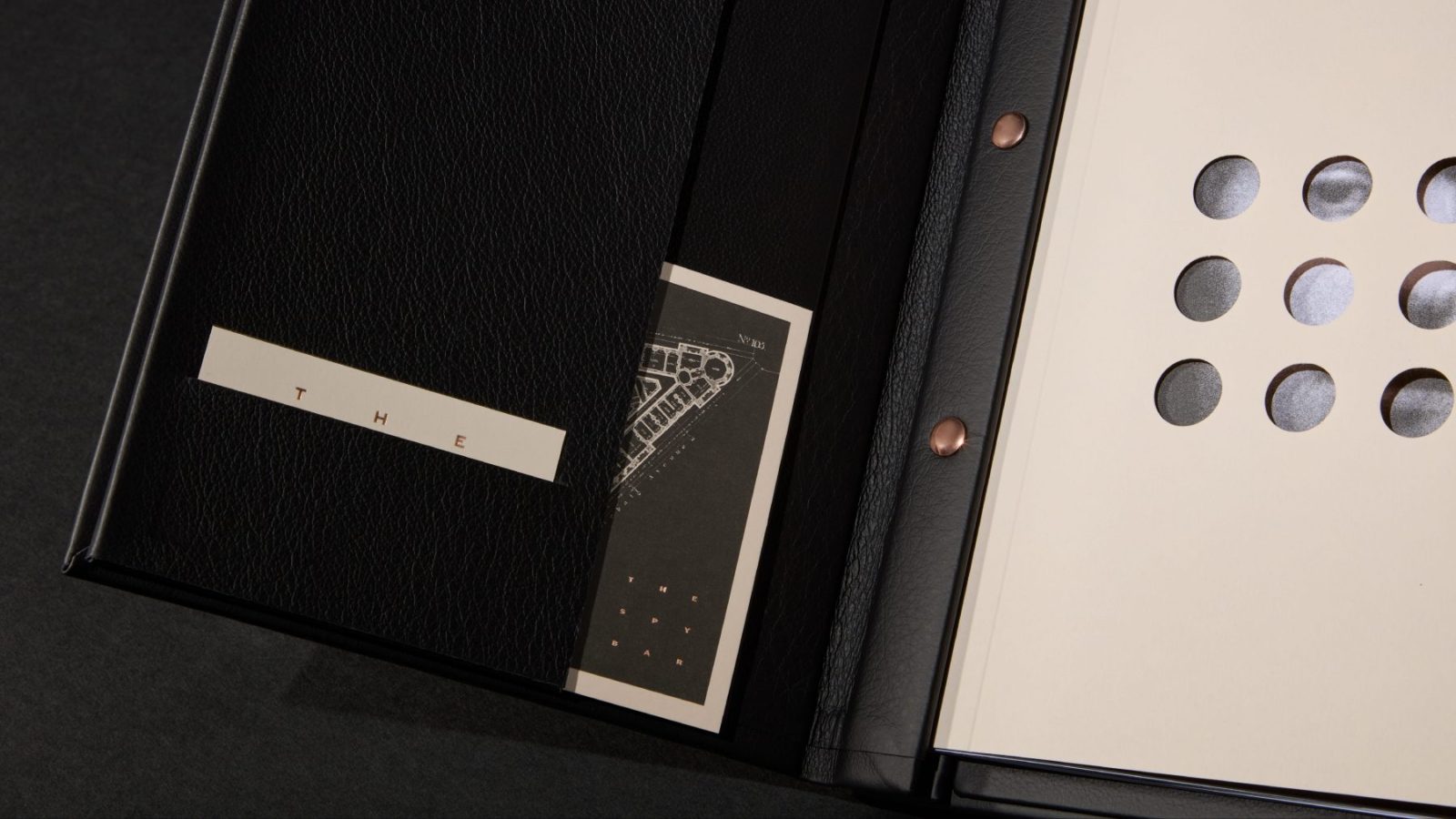 In its secret subterranean location, is The Spy Bar. The branding reflects both the real and fictional espionage associations of the building, employing a geometric word-mark typeset in 1906 Bold, paired in black and rose gold in homage to 007’s Vesper Lynd, and menus that unfold like classified dossiers complete with pockets, a blackout-cut front page and martini roulette card invoking Christine Granville, Britain’s longest-serving spy.