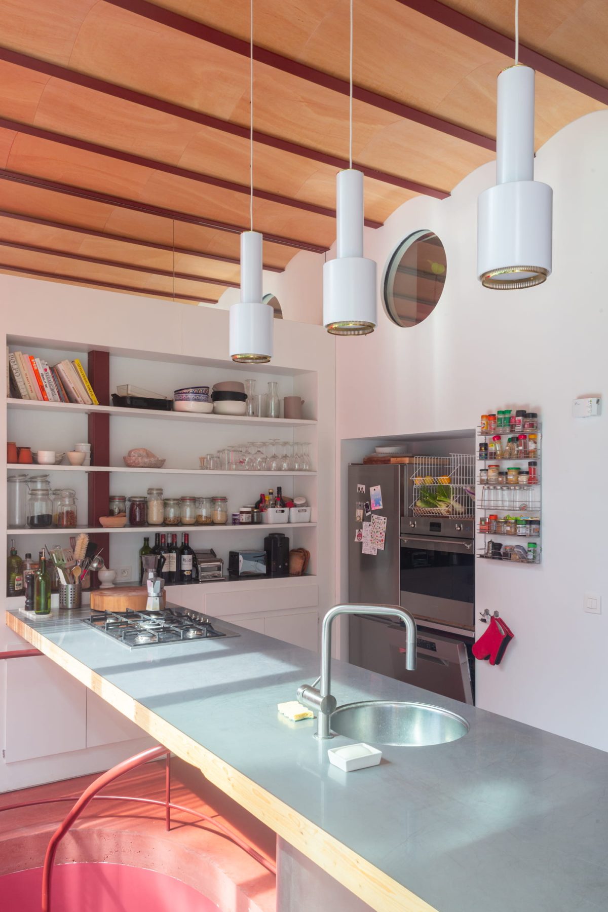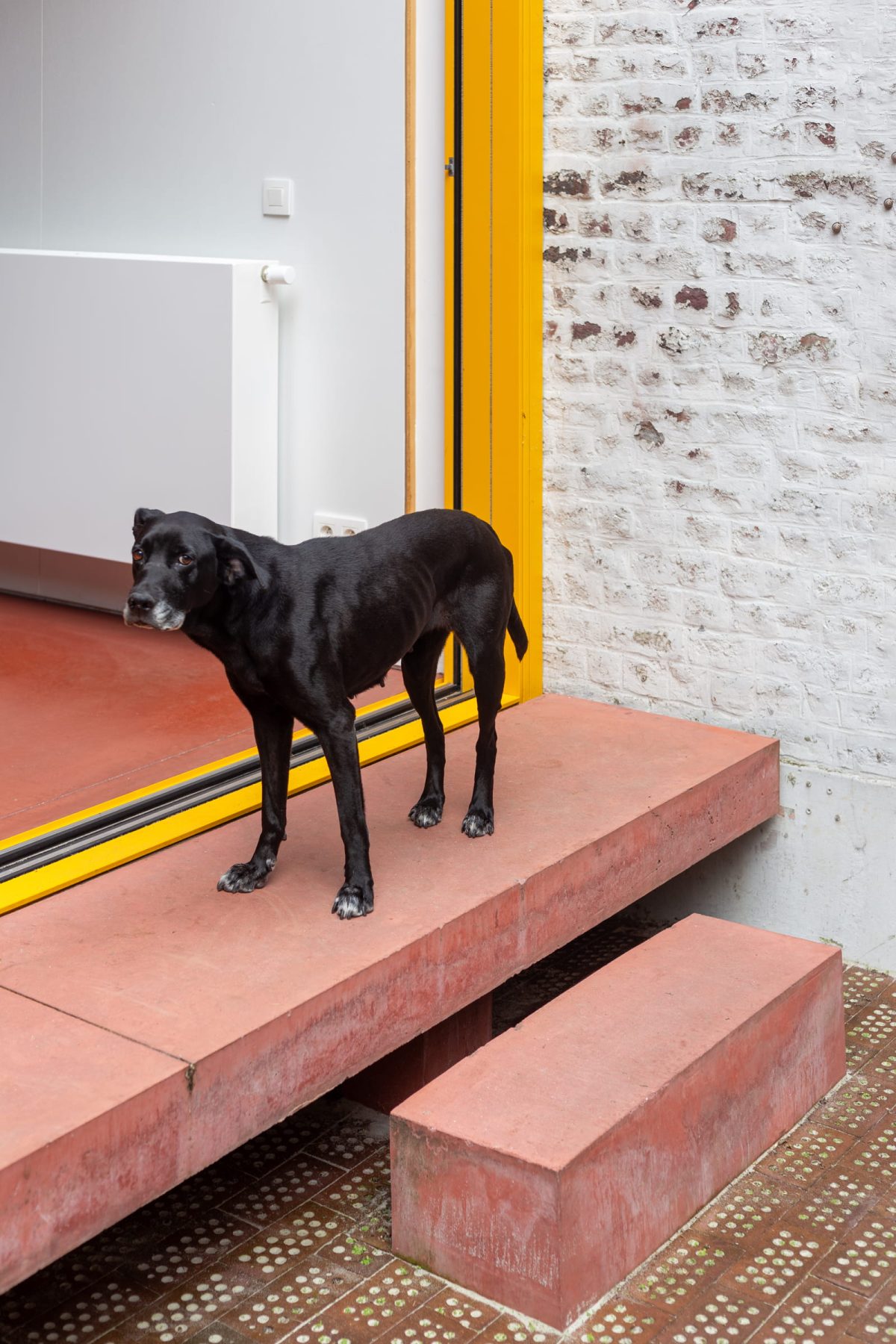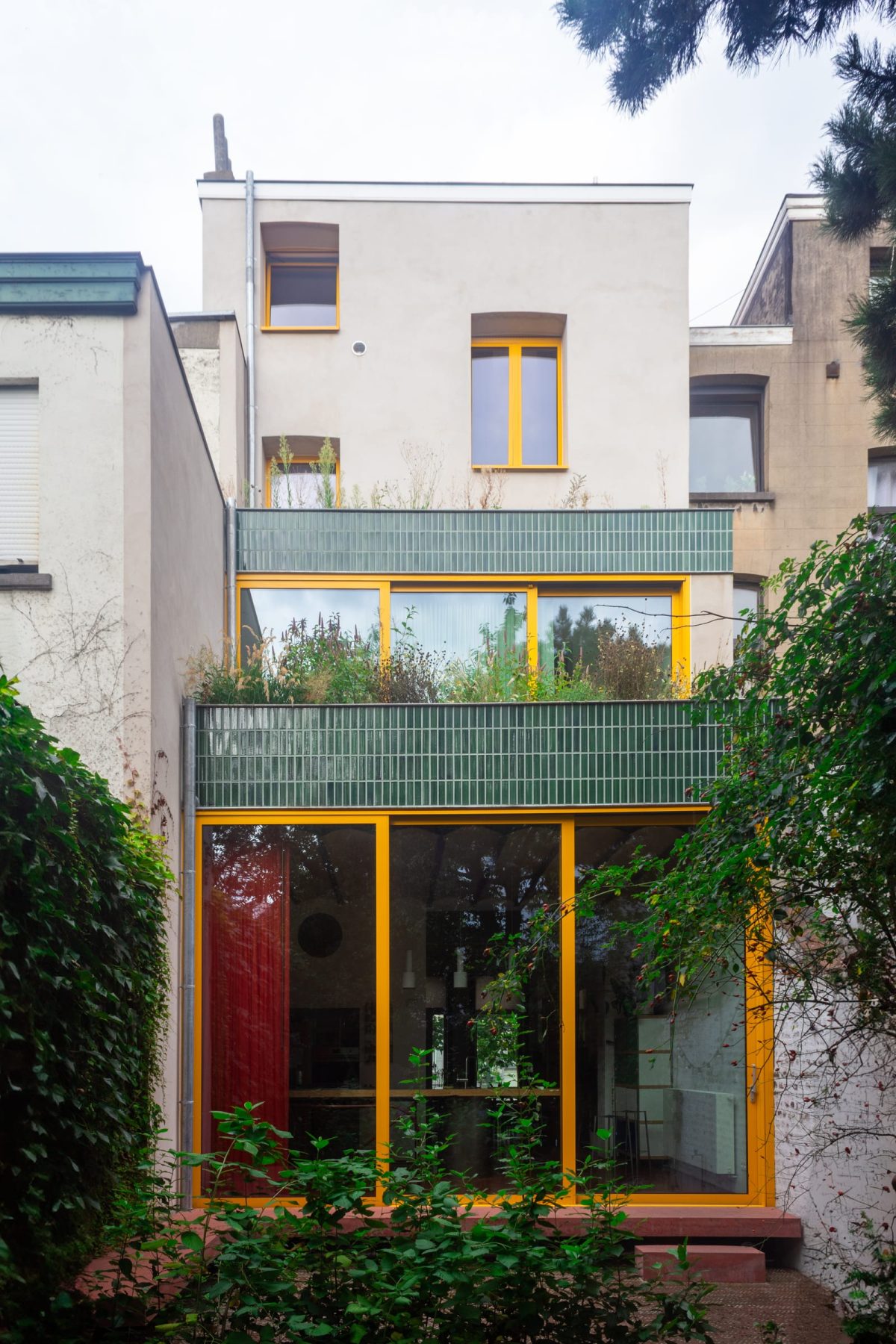 It is developed by Vormen, a Brussels based design collective. The back façade is clad with green tiles; a red concrete bench extends the kitchen floor to the outside.