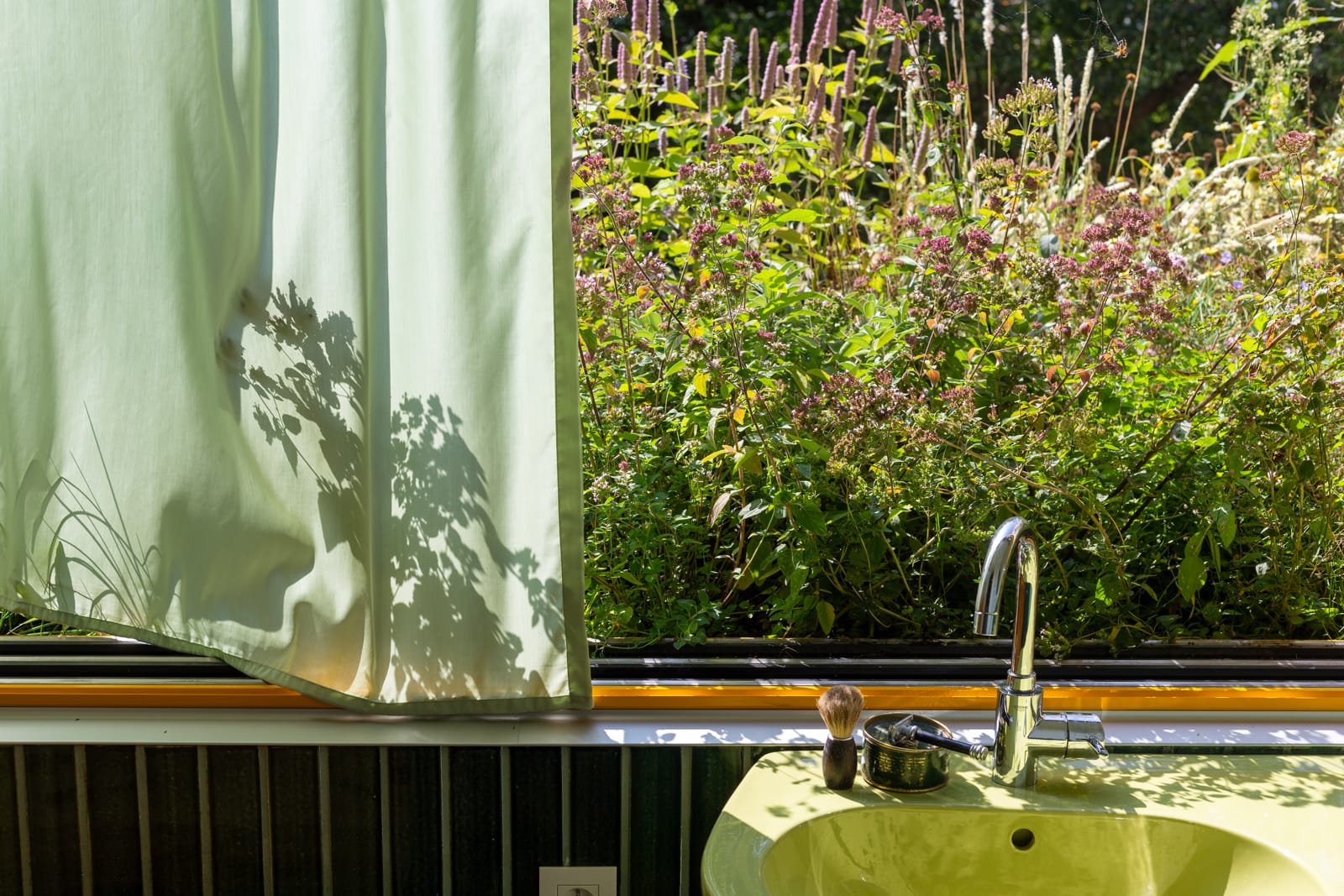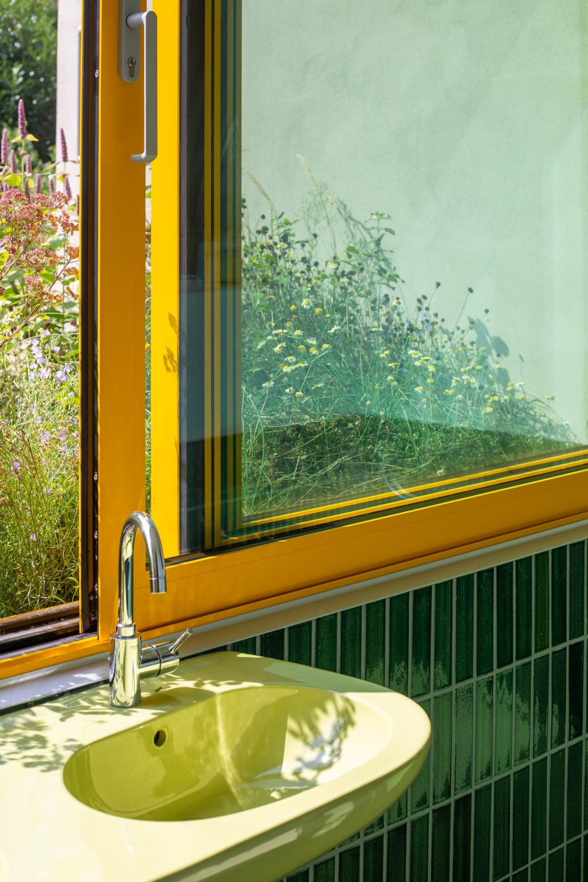 Two big yellow sliding windows connect to the garden and the planted roof and bring greenery into the living spaces.