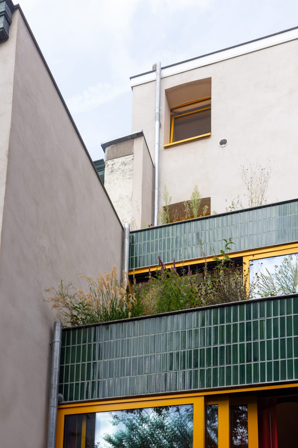 The bold color choices link the green atmosphere of the inside of the building block with the warmer tones in the living spaces.
