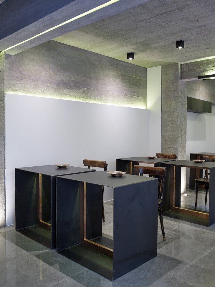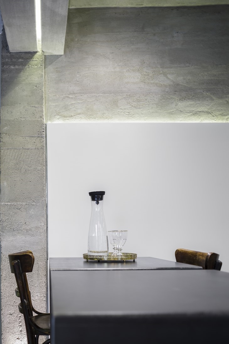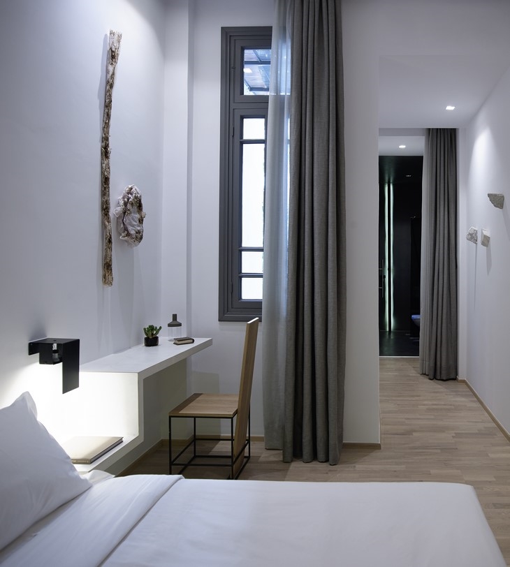 Inside the rooms, there is no standardization. During the stage of inserting furniture into the rooms, the basic intention, was to reveal the simplicity of the furniture design through the use of raw materials, but on the same time the promotion of the materials themselves as furniture through the designed simplicity. A characteristic sample is the beds made from unpainted black mild steel, the marble pieces functioning as bedside tables as well as the reception desk, where the marble volume that is placed at its base, is working as a counterweight. At the breakfast area, the tables and the counter made of mild steel and copper, together with the vintage wooden coffee chairs create a familiar atmosphere, while the ceiling was chosen to reveal the construction material, concrete.