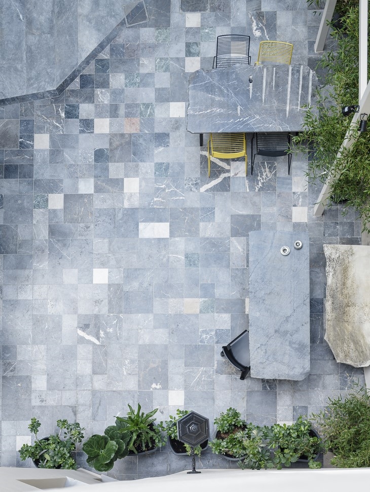 At the centre of the front yard, the existing lemon tree, the only tree that was planted in soil, becomes the core of the space, since it is transformed into a polygonal object, alive table. The building itself, as well as many of the used materials gain a second chance. The hotel is considered a challenge for a different unique experience in the center of Athens.