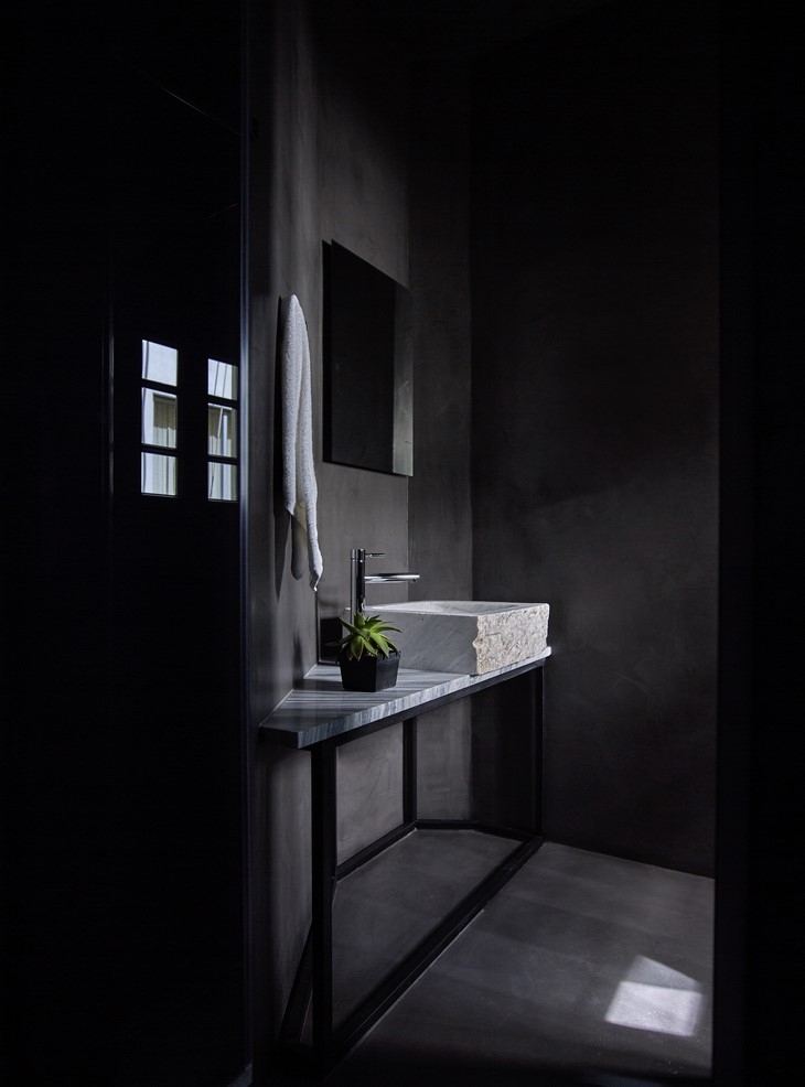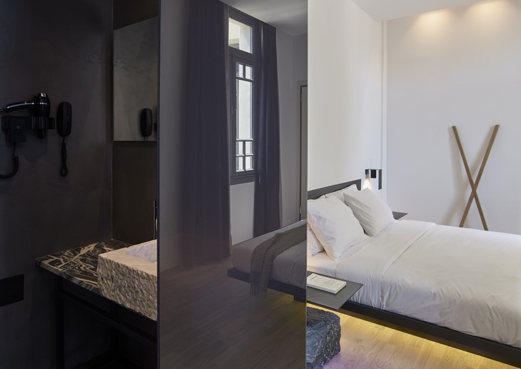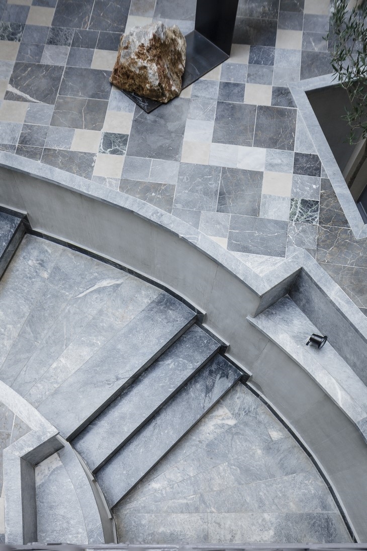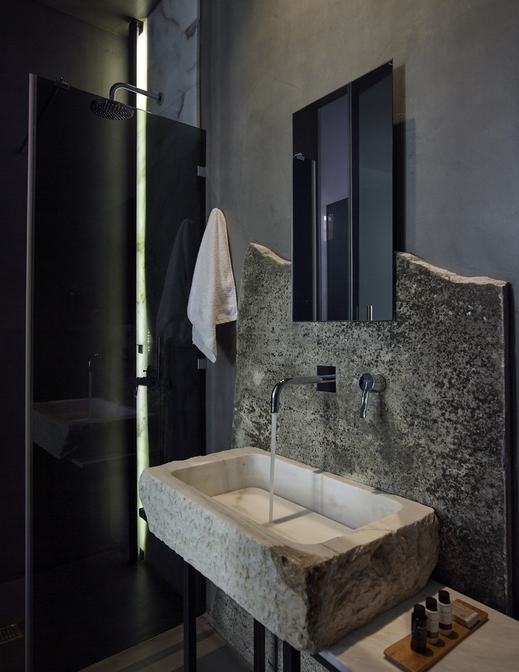 The reflections that arise in the tinted glass surfaces of the rooms create new images and give different meanings and interpretations of the spaces. Each bathroom is different since the marble surfaces used at the back of the washbasins and the washbasins themselves are selected each separately, and bring upon them their excavation process, corrosion, the accidental, the fragmentary and finally time. Nothing is perfect and this is what binds us with the natural and sensitive side of ourselves.
