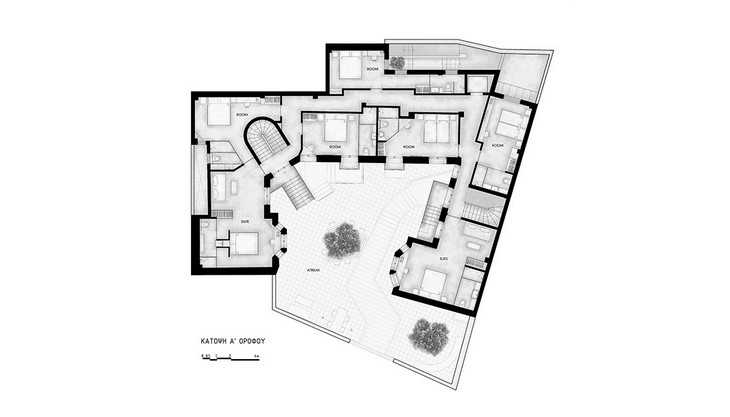 The above location offers a unique character to the hotel, since it is surrounded by buildings that restrain the optical leaves and simultaneously create an internal calmness. The access is through a passage of a commercial arcade, which functions as a natural filtering process for the visitor, leading him from the noise of the city towards innerness.
