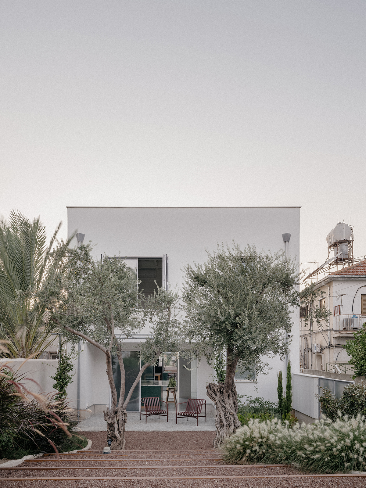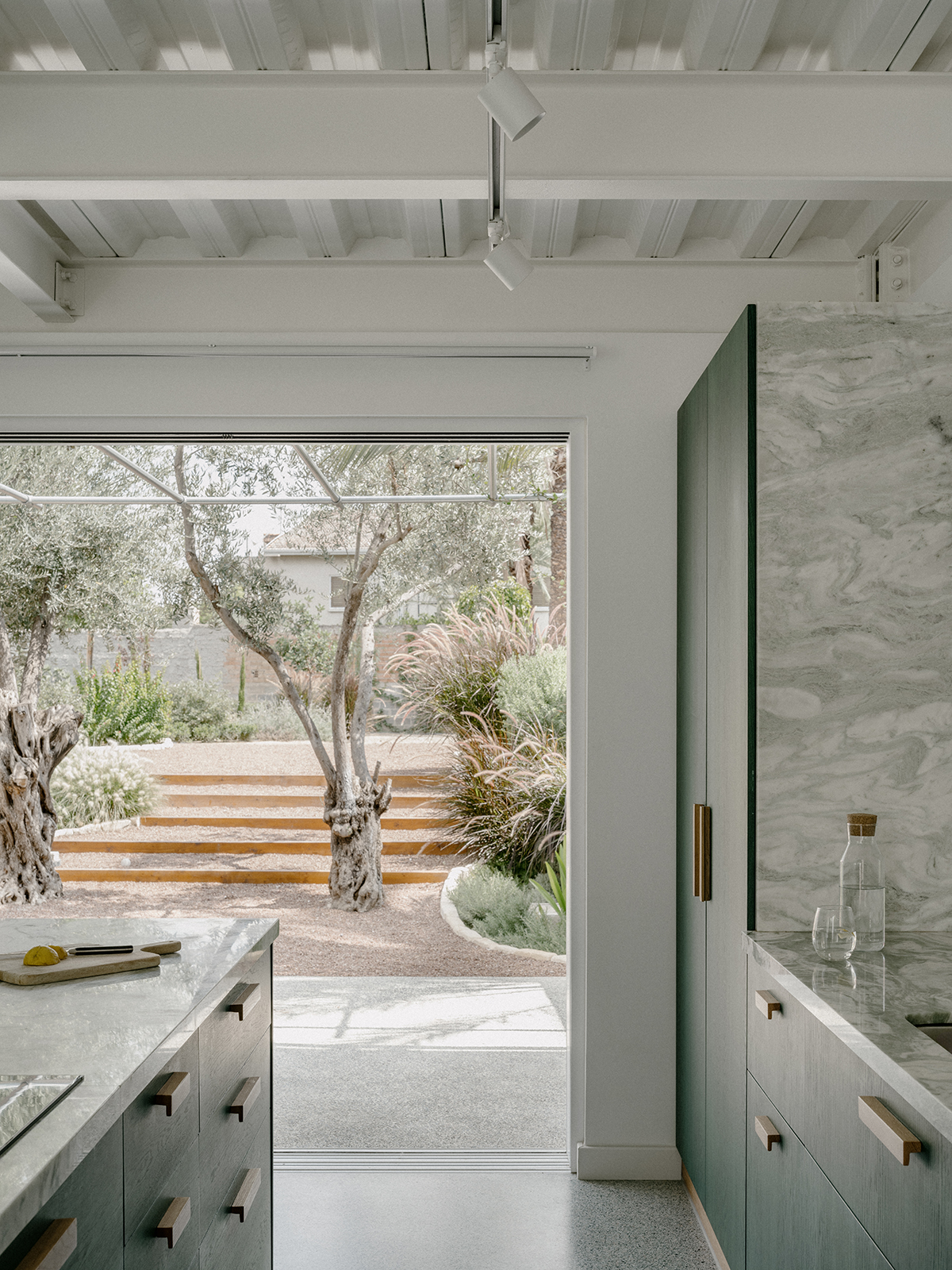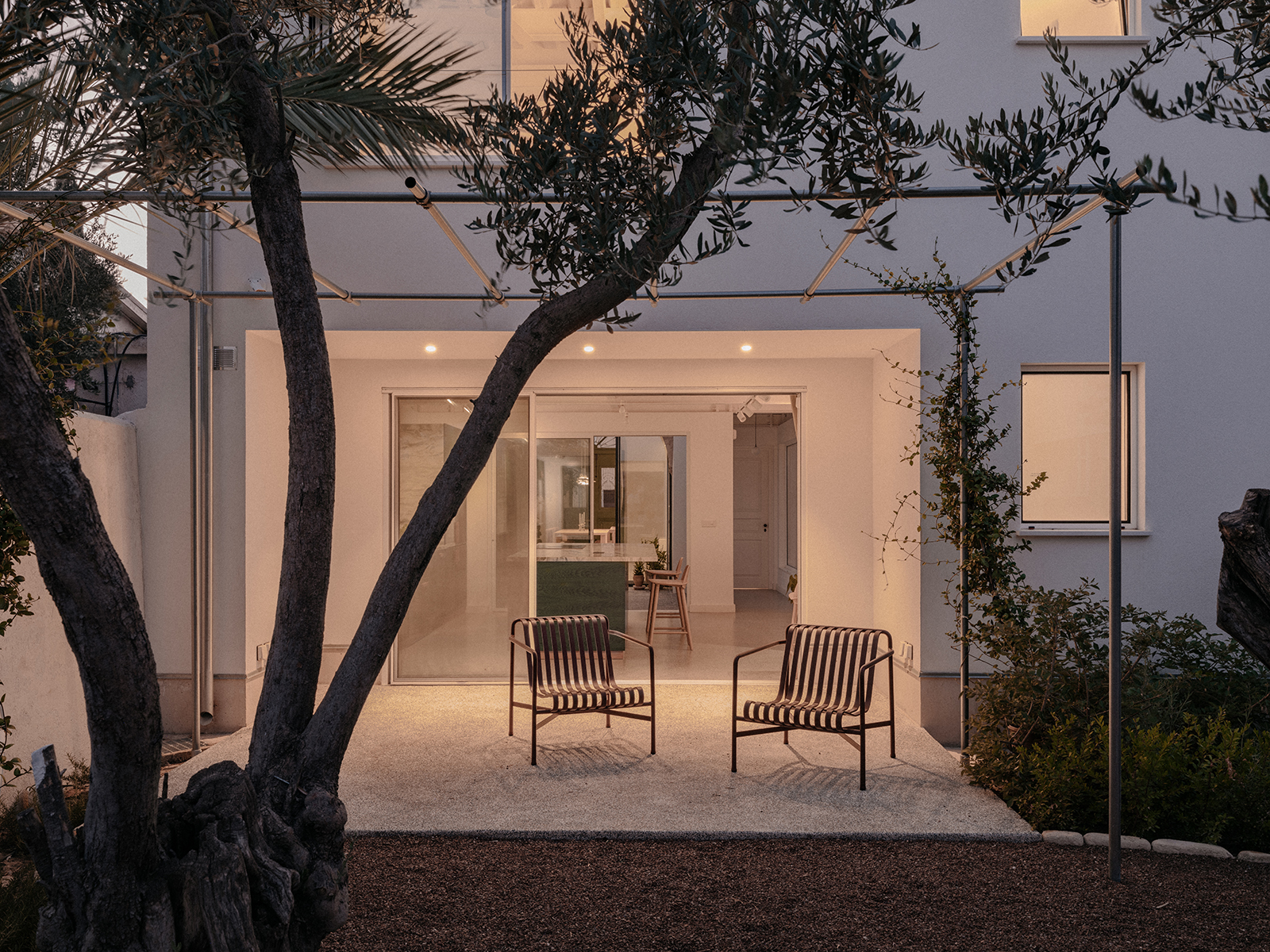 The extension is constructed out of a steel frame with exposed beams, visually expanding the interiors and enhancing the sense of spaciousness. The aim was for a simple and aesthetically clean result which led to a careful selection of materials: seamless terrazzo flooring in communal areas, pebble-finished flooring in the courtyards and terraces, wooden flooring in the bedrooms, and white render on vertical surfaces.