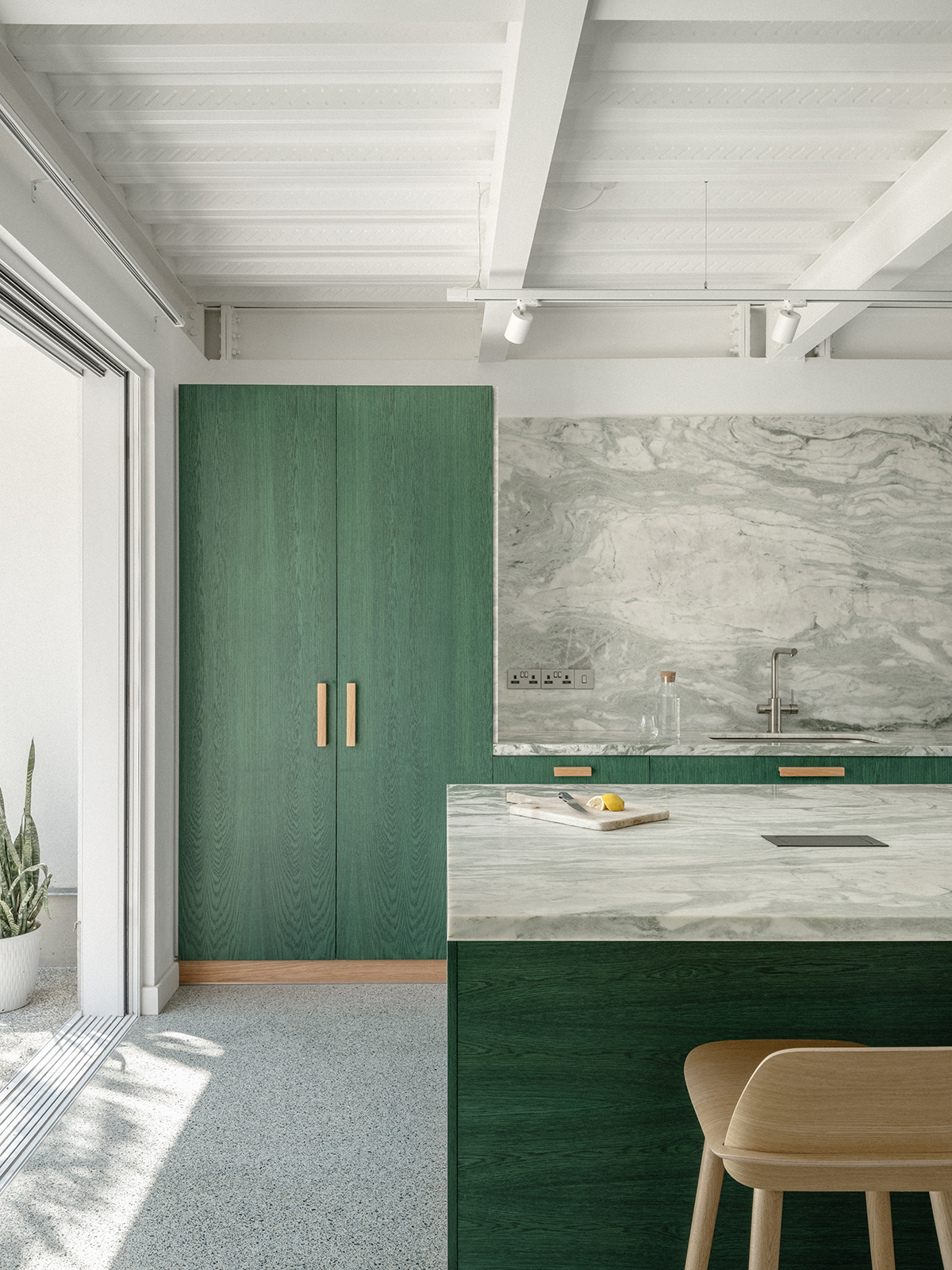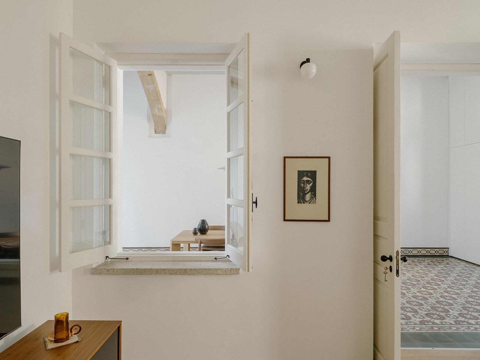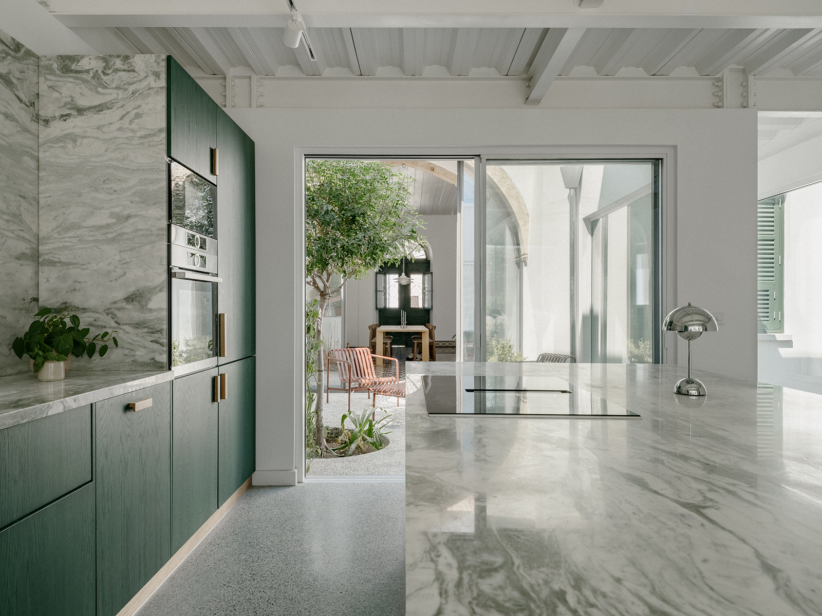 The extension is constructed out of a steel frame with exposed beams, visually expanding the interiors and enhancing the sense of spaciousness. The aim was for a simple and aesthetically clean result which led to a careful selection of materials: seamless terrazzo flooring in communal areas, pebble-finished flooring in the courtyards and terraces, wooden flooring in the bedrooms, and white render on vertical surfaces.