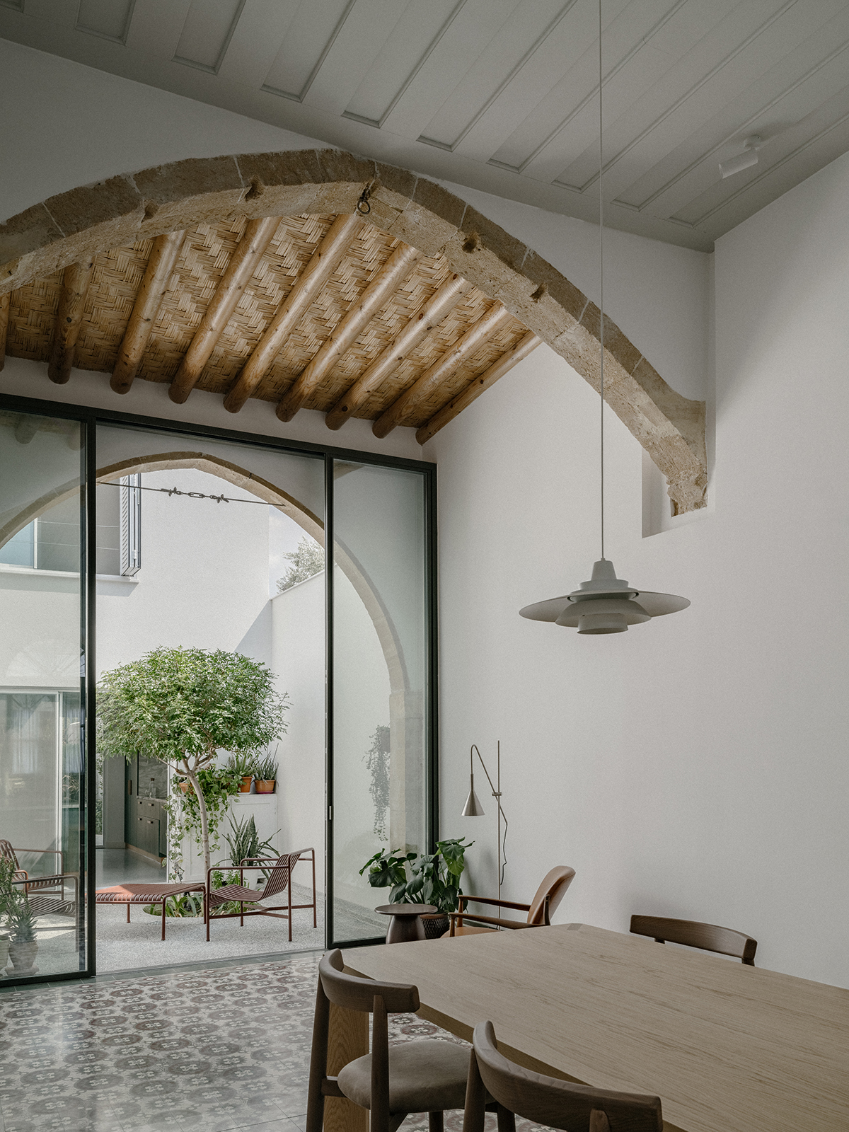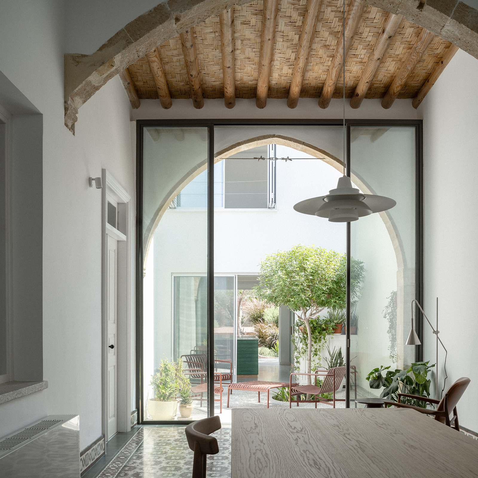 The main internal courtyard functions as the heart of the home, offering a vital open-air space adjacent to the sunroom and kitchen.