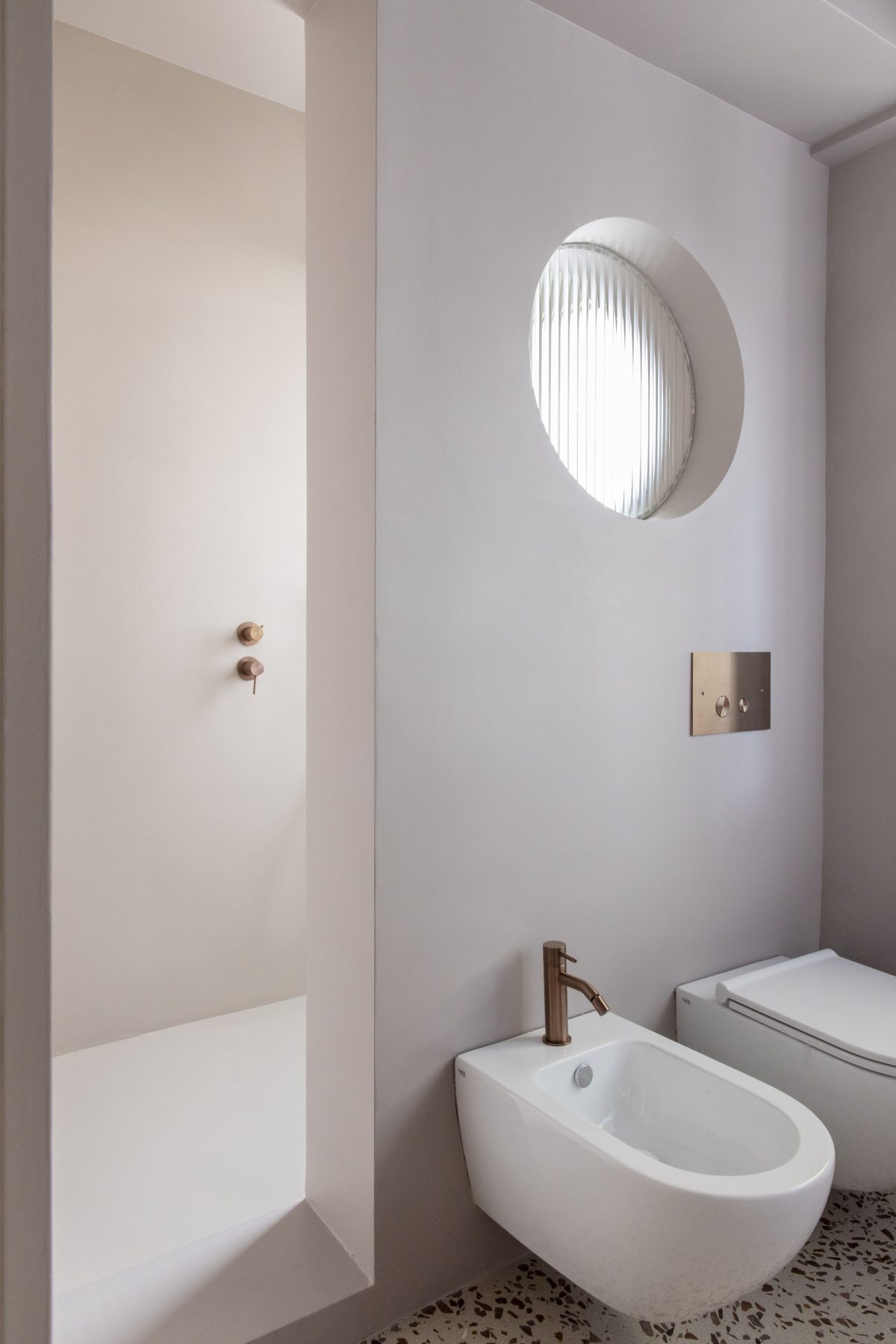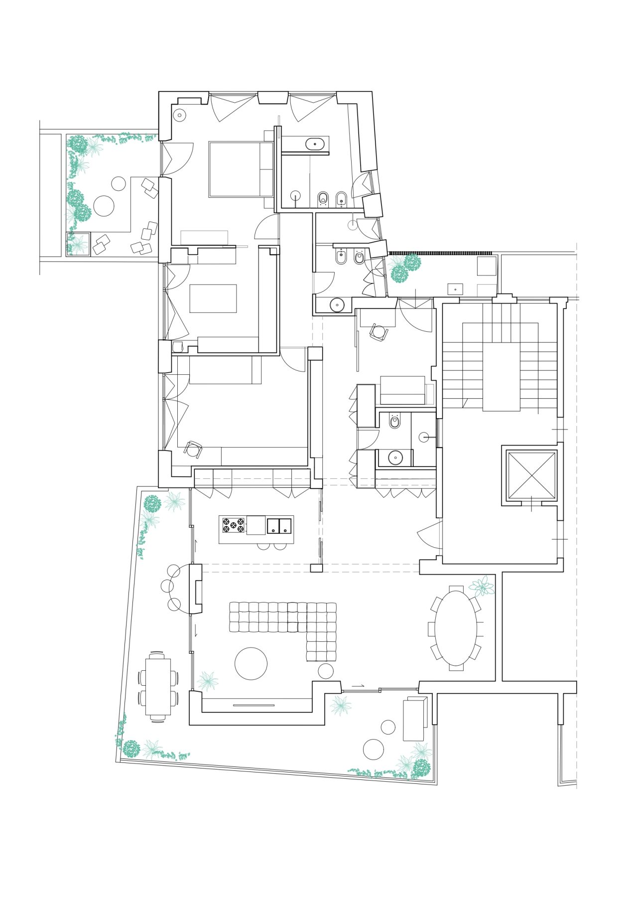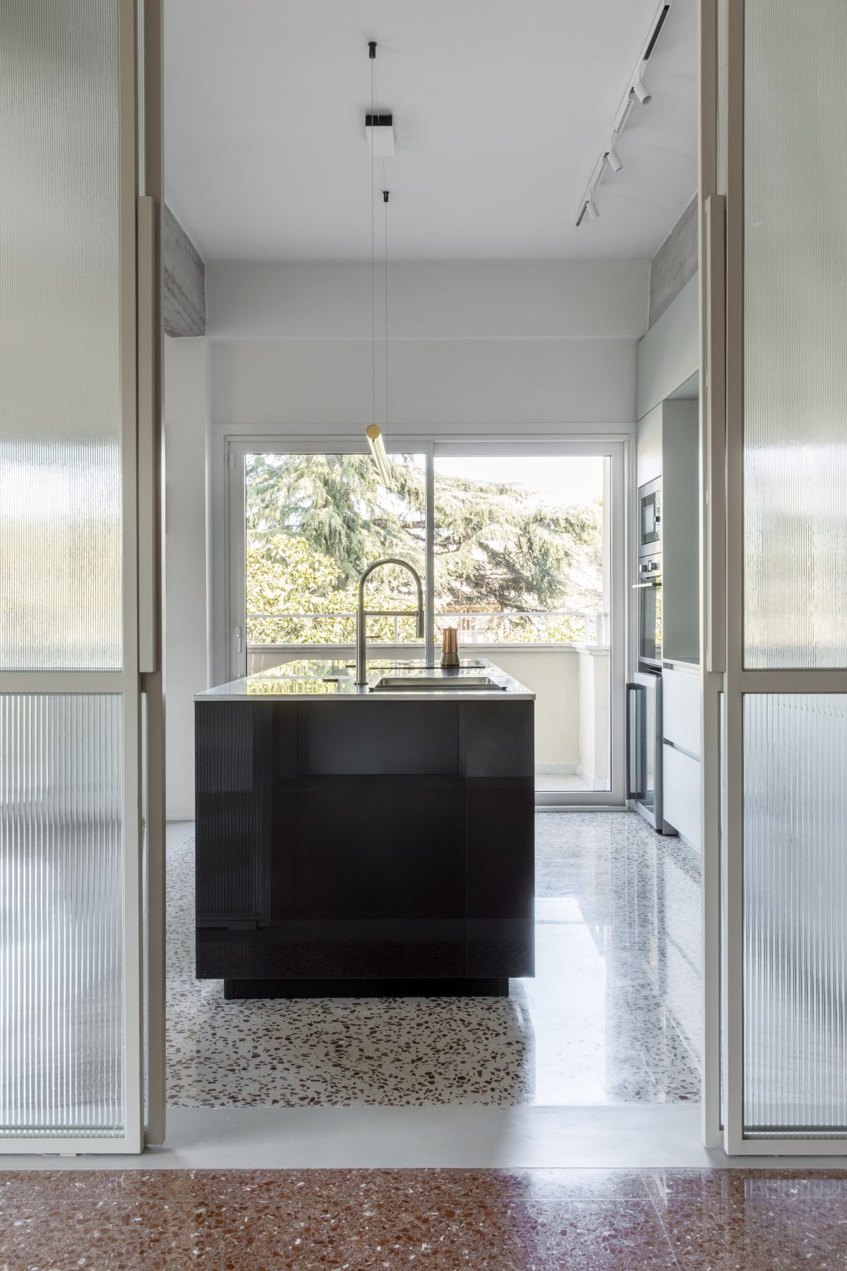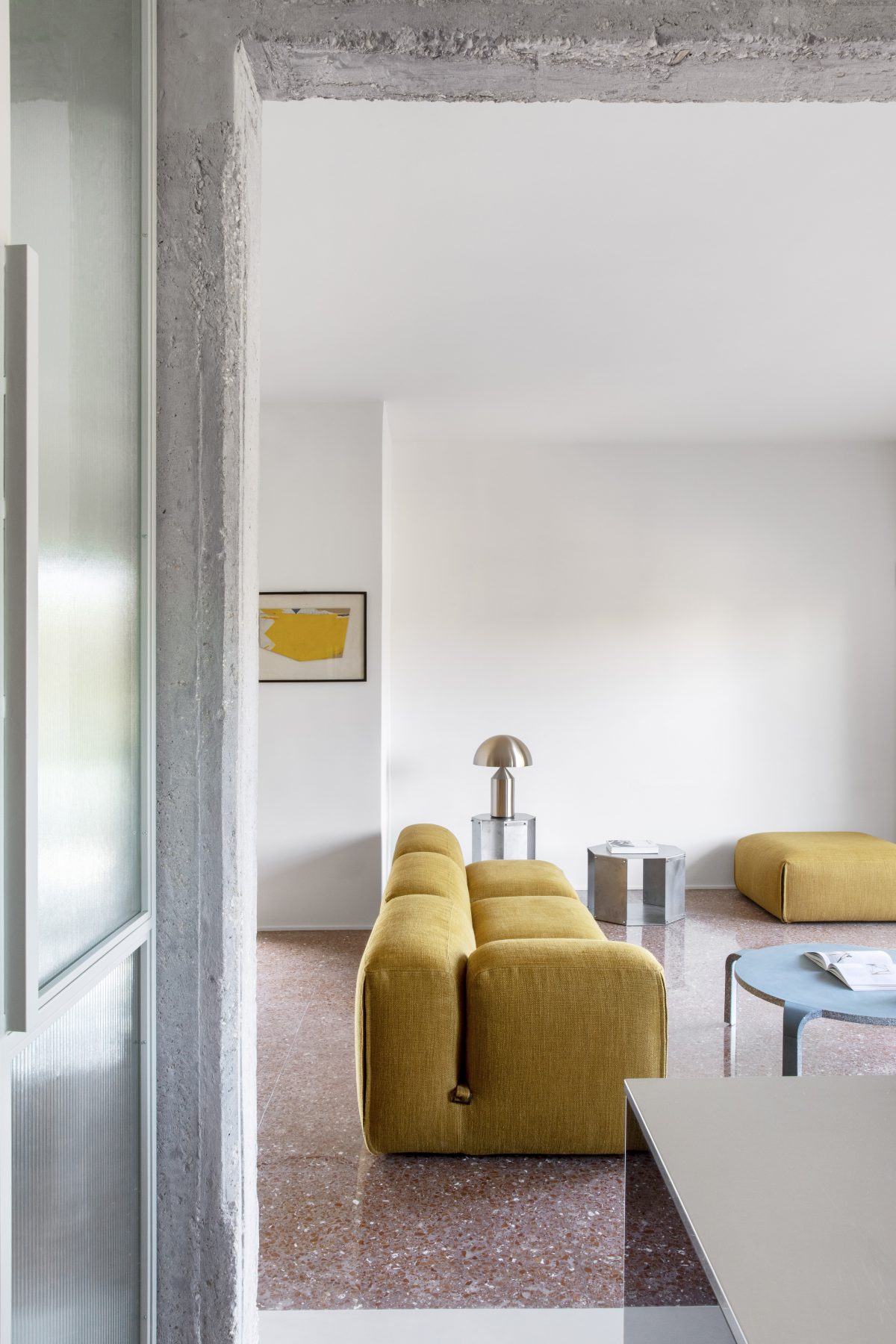 Venetian flooring and exposed reinforced concrete walls become the compositional and graphic matrices around which a new spatial layout is organised. Spaces are reconfigured to emphasise continuity between interior and exterior, introducing new openings and a fluid arrangement in which the living area extends seamlessly toward the terrace that wraps around the home.